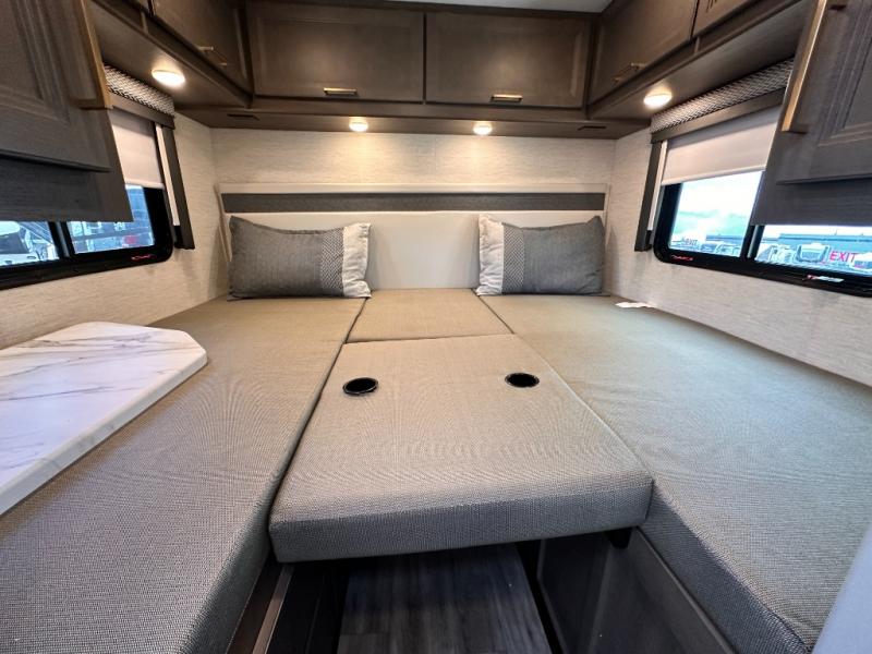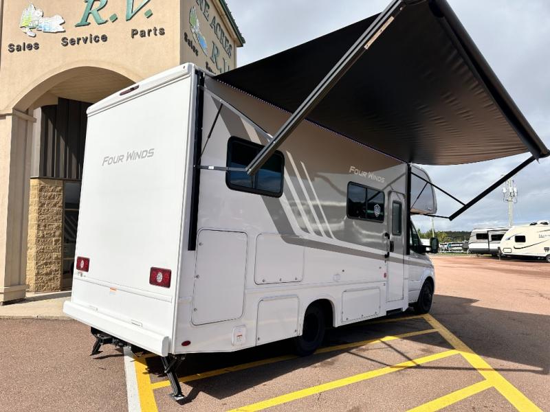 With any Four Winds Sprinter Class C diesel motorhome by Thor Motor Coach, you will have everything you need for unforgettable trips on the road! Each model is constructed with a durable one-piece fiberglass front cap plus a one-piece upper rear cap, a welded tubular aluminum roof and sidewall cage, plus a slick fiberglass exterior with standard graphics package. You can put your own style on your coach by choosing one of the optional partial paint choices, plus there two modern interior decor choices to choose from. The Mercedes-Benz sprinter chassis provides a strong foundation for each model, and the 2.0L l-4 211HP engine will power your adventures both near and far. There is even a 5,000 lb. trailer hitch if you need to tow a jet ski or fishing boat. A 100-watt solar charging system comes standard, along with a 4.0 kw LP generator, a tankless water heater, plus many more utilities to make each trip hassle-free. Step inside to find residential vinyl flooring, decorative glass inserts in the kitchen overhead cabinets, Leatherette furniture, and pressed laminate countertops to name a few comforts!