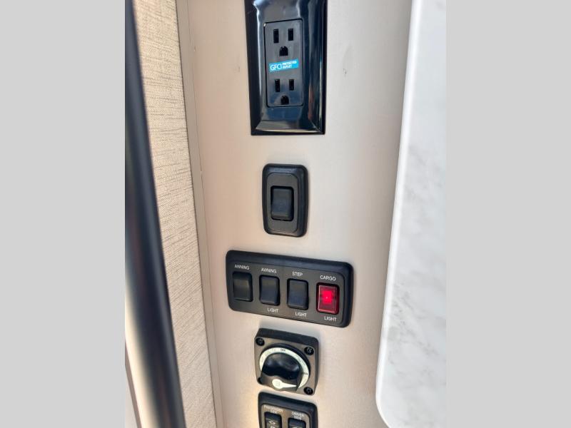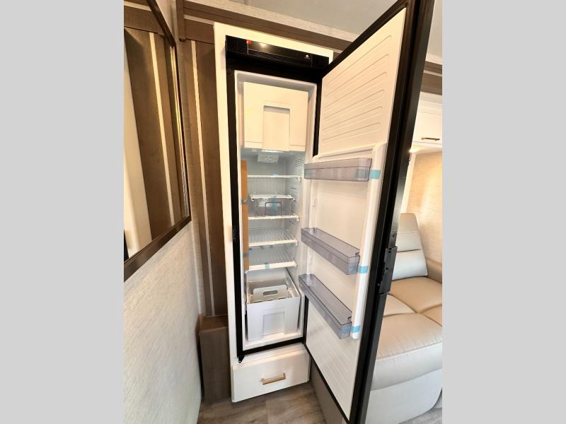 Travel comfortably in this Class C motorhome featuring a versatile sleeping space. In the rear of the coach, you might enjoy two twin beds to travel with a friend, or convert the twin beds to a king when you travel with your spouse. Plus, you will have a 52" x 87" cab-over bunk that sleeps two adults or children as well. All will enjoy the full bath amenities that offer the entire width of the unit for showering and getting dressed, and you can easily close off the toilet and vanity area for additional privacy during the day to allow access into the bedroom. There is also a skylight over the shower which adds additional headroom and natural lighting. A full kitchen including a three burner cooktop and convection microwave oven with an air fryer will let you make meals each day, and the 12V refrigerator will keep perishables fresh!