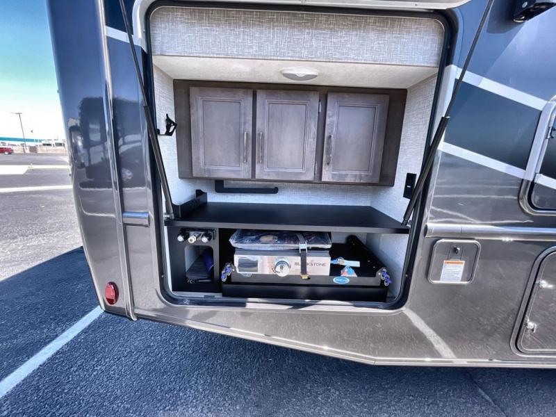 Family trips across the country are made complete in this spacious coach! The swivel captain's chairs can become a part of the living area once you park, and your guests can relax on the Dream Dinette or sofa bed. Lunch can be made on the three burner gas cooktop, or in the 30" over-the-range microwave oven, and clean up will be a breeze in the stainless steel single bowel sink. This model also includes an outdoor kitchen with a refrigerator and a sink to easily clean up. You will love having your own bedroom to retreat to each night, and here you'll find a king bed, a 32" LED Smart TV, plus a closet to keep your clothes and shoes tidy!
