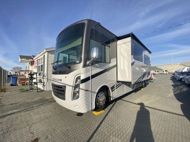 With any Hurricane Class A gas motorhome by Thor Motor Coach you will appreciate solid construction materials, like the premium one-piece Crossflex roof, welded tubular steel floor and the Vacu-Bond laminated roof, walls, and floor with block foam insulation. Each model sits on a Ford F-53 chassis with a 7.3L Triton V8 engine for power you can feel, plus there is an 8,000 lb. trailer hitch with a 7-pin round connector to pull your car along. The Rapid Camp+ multiplex system with Bluetooth will allow you to easily set up camp from the convenient 7" touchscreen provided, and the Winegard ConnecT WiFi extender +4G will let you catch up on work if needed. The Hurricane includes pressed laminated countertops inside, as well as residential vinyl flooring, decorative glass and tile backsplash in the kitchen, and many more at-home comforts.