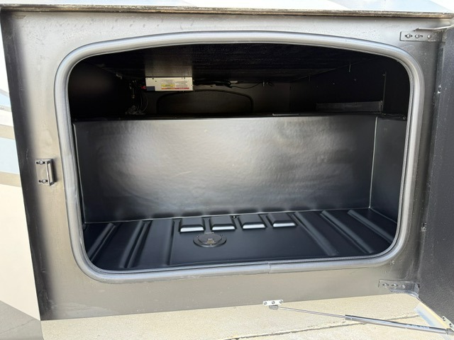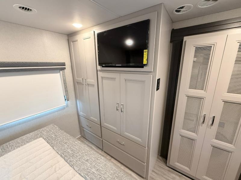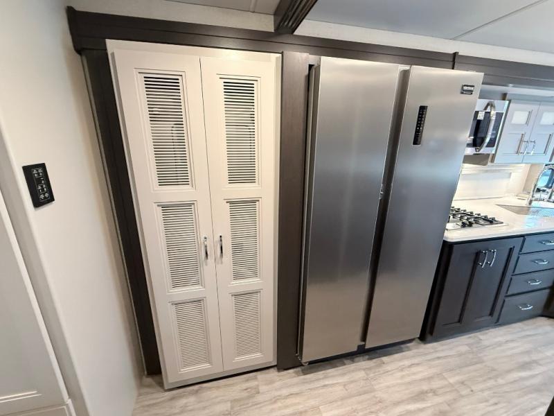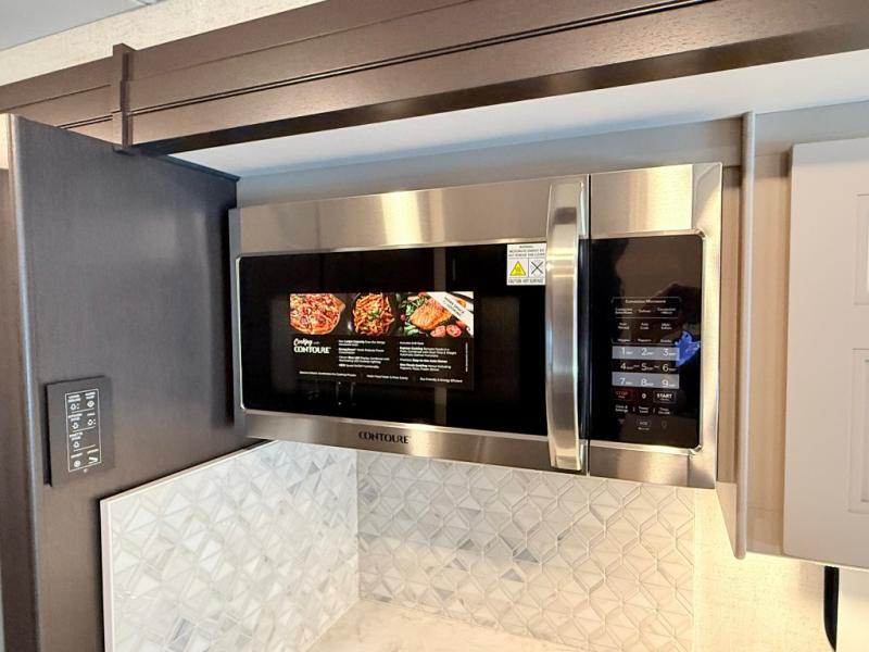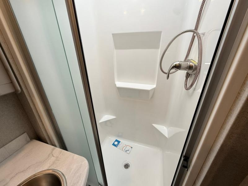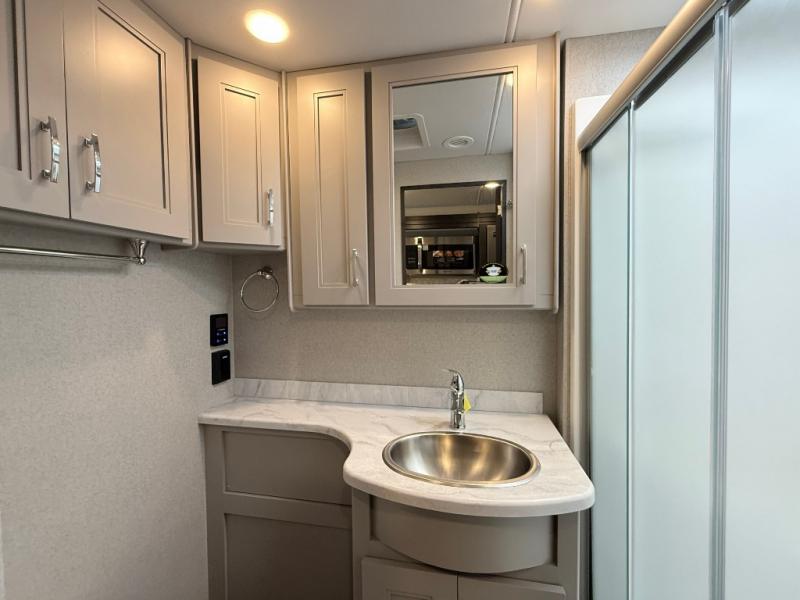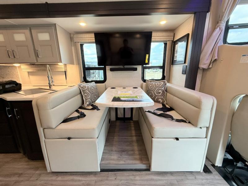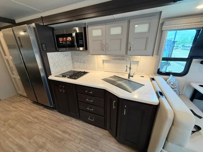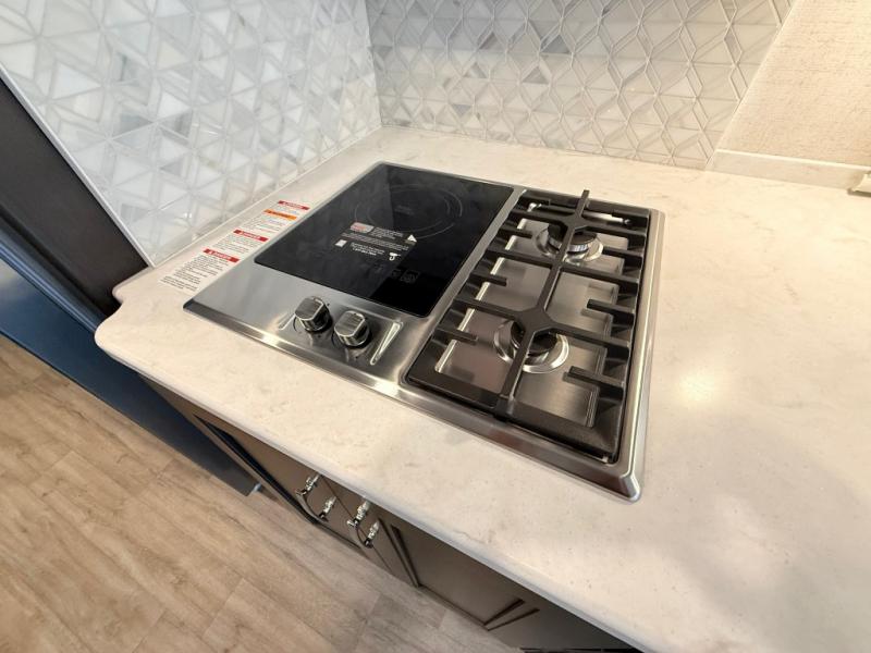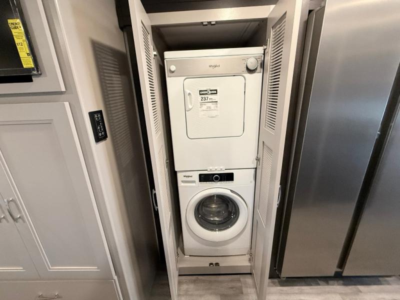 You won't even feel like you're traveling in this motorhome! The rear private bedroom offers at-home comforts with a Tilt-A-View inclining king bed slide, a closet, and a 32" Smart TV to watch movies in bed, plus there is a stackable washer and dryer for added convenience. The kiddos will want to draw straws for who gets to sleep on the 52" x 80" bunk over cab. Everyone can freshen up each morning in the full bathroom with 30" x 42" shower which has a skylight above, an Oxygenics shower head, and fiberglass shower with a glass door. Prepare your best home cooked meals with the two burner high output gas range top with single induction cooktop and enjoy them at the 72" Dream Dinette. The theater seating has the perfect view of the 42" Smart TV above the dinette.