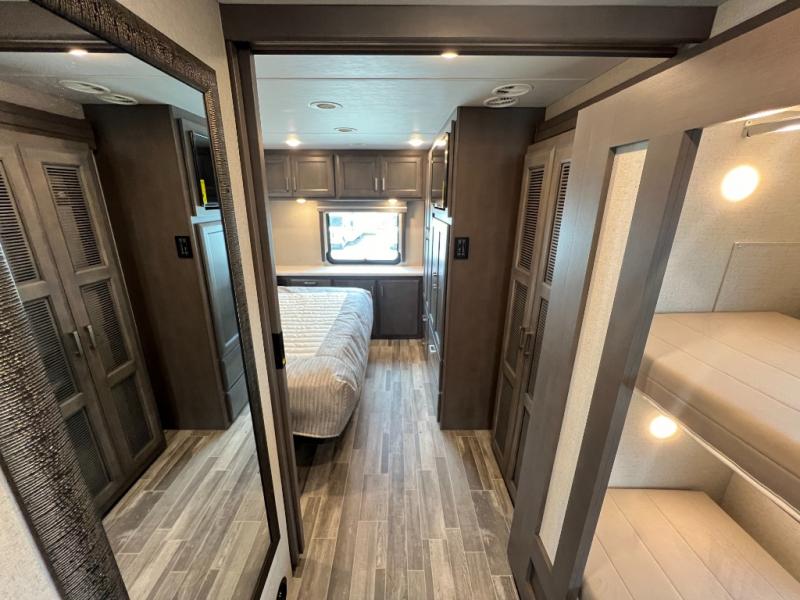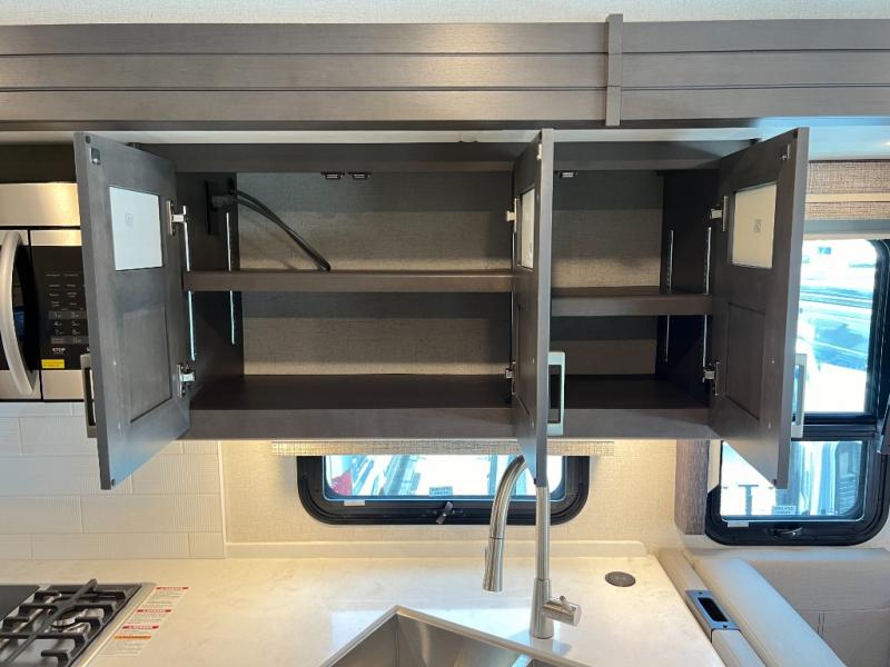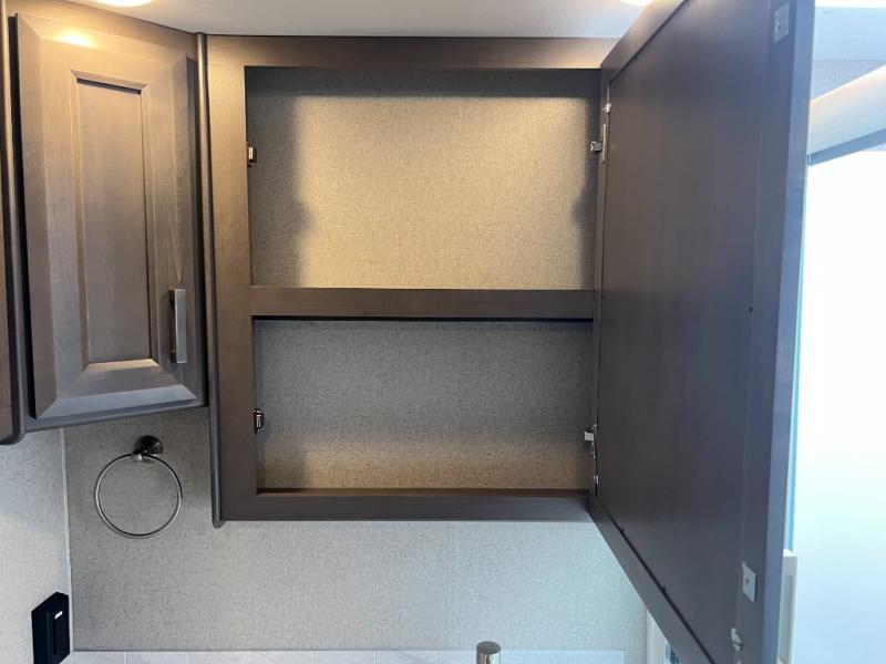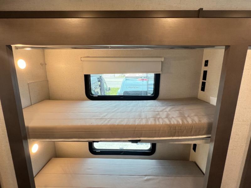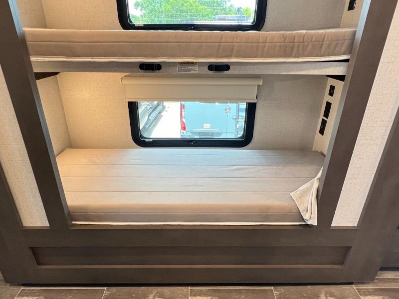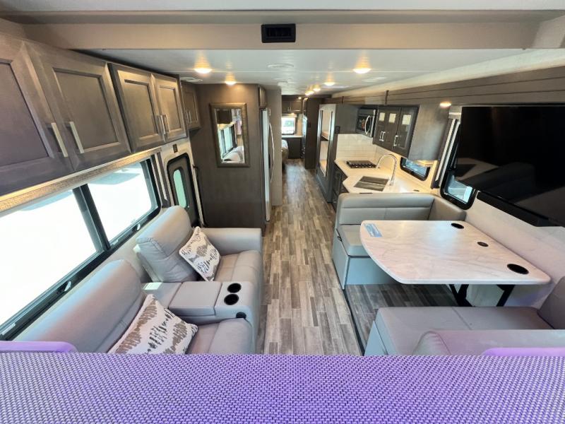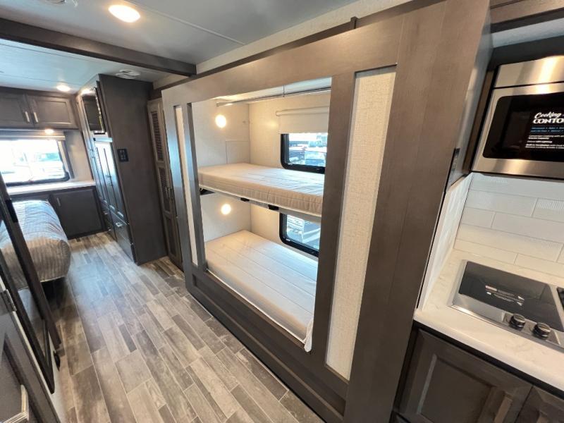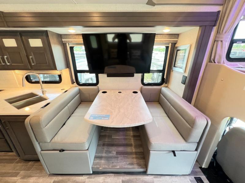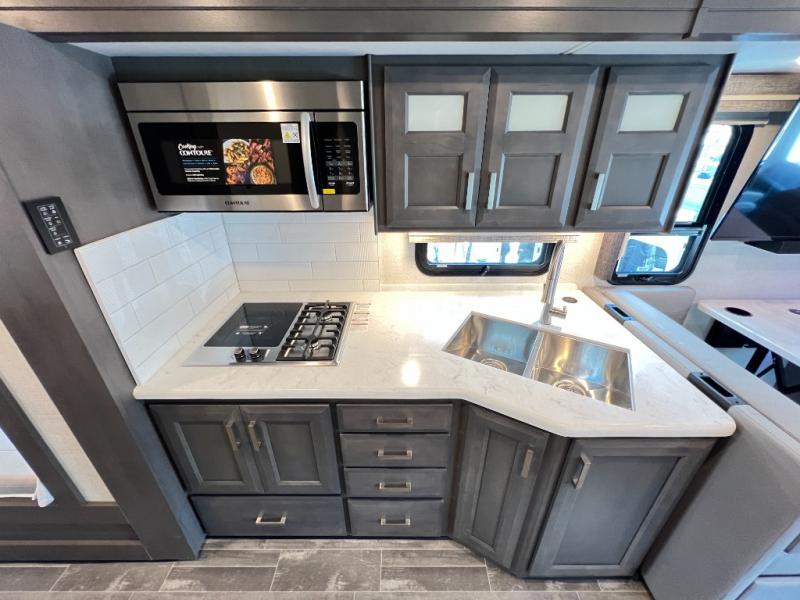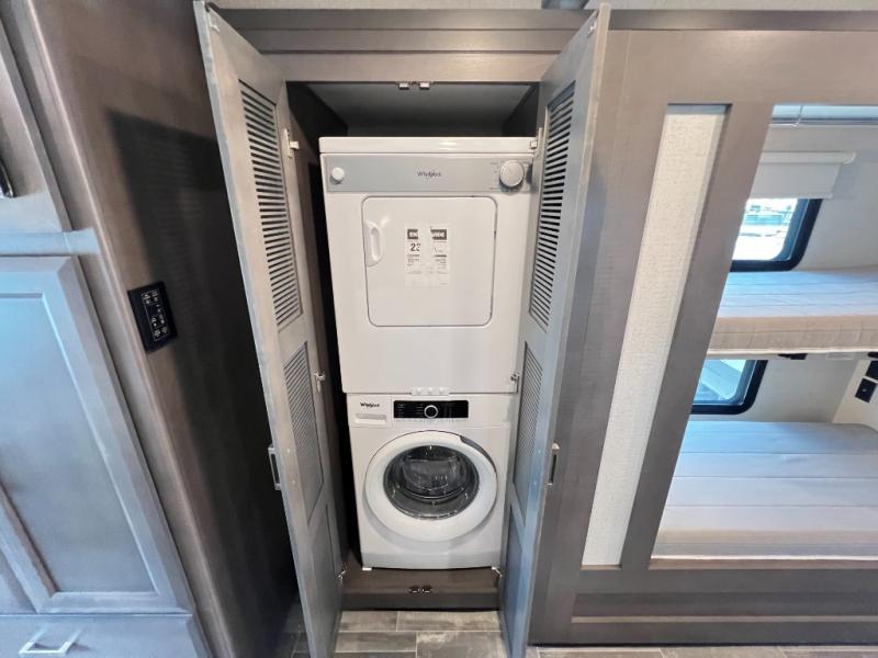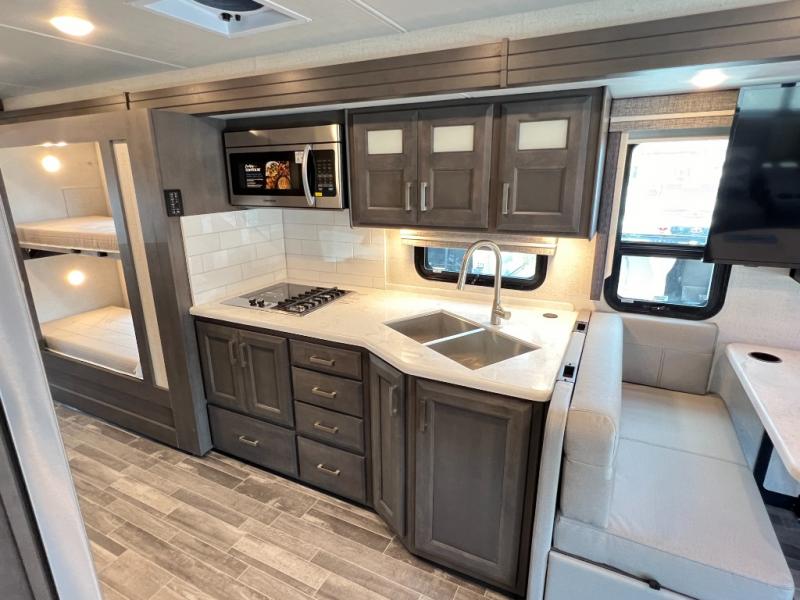 You won't even feel like you're traveling in this motorhome! The rear private bedroom offers at home comforts with a Tilt-A-View inclining king bed slide, a chest of drawers, a closet, and a 32" Smart TV to watch movies in bed. The kiddos can sleep on the set of 24" x 74" bunk beds and the 52" x 80" bunk over cab. Everyone can freshen up each morning in the full bathroom with the 30" x 42" shower which has a skylight above, an Oxygenics shower head, and foot flush porcelain toilet. Prepare your best home cooked meals with the two burner high output gas range top with single induction cooktop and enjoy them at the 78" Dream Dinette. The theater seating has the perfect view of the 50" Smart TV above the dinette, but you could switch the theater seating out for an optional sofa for more seating space.