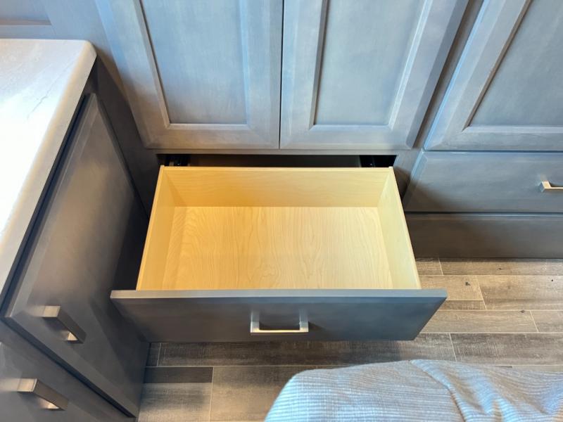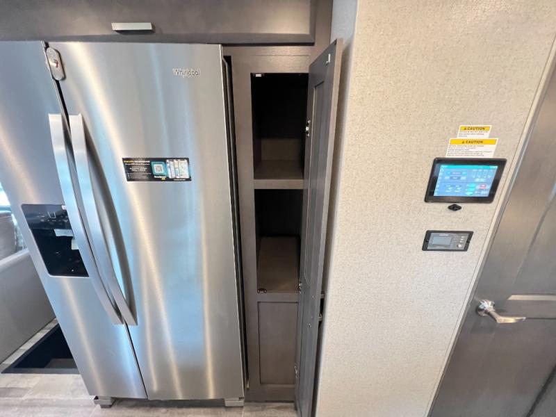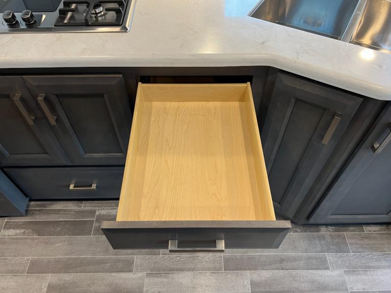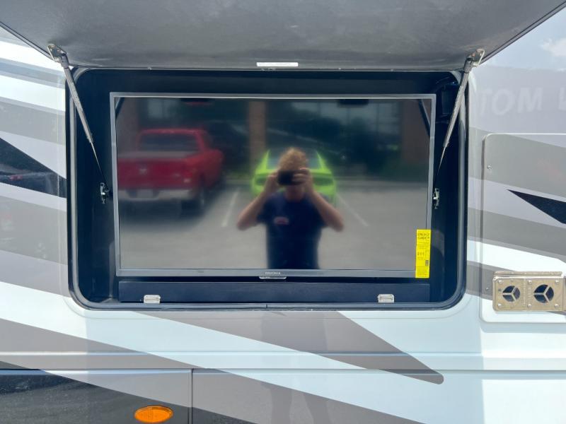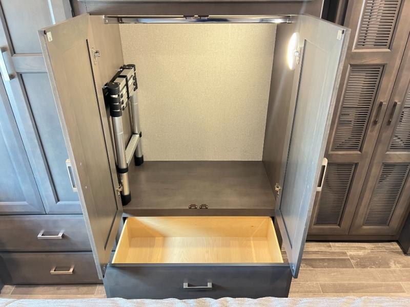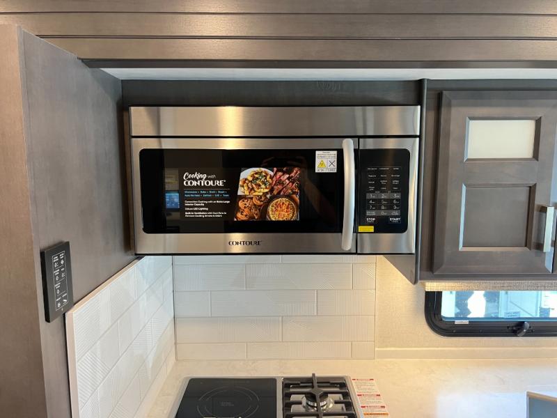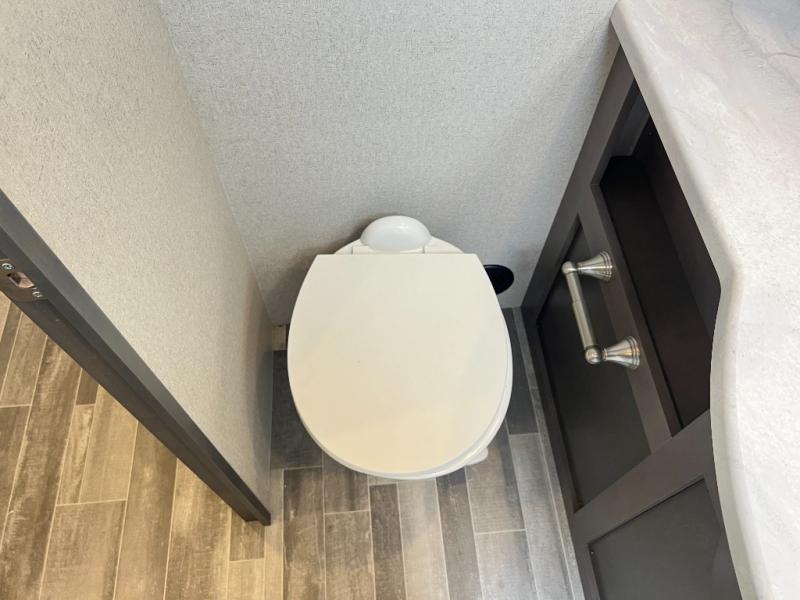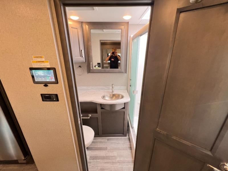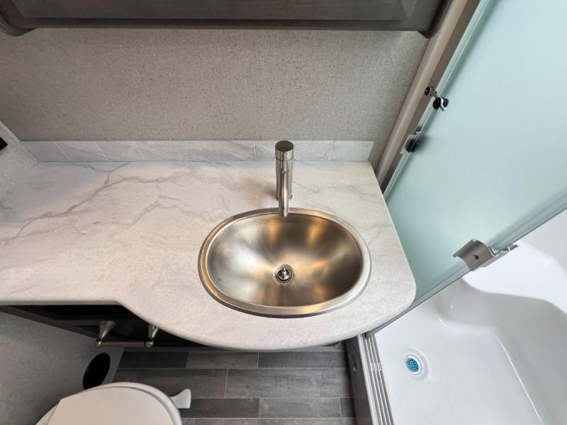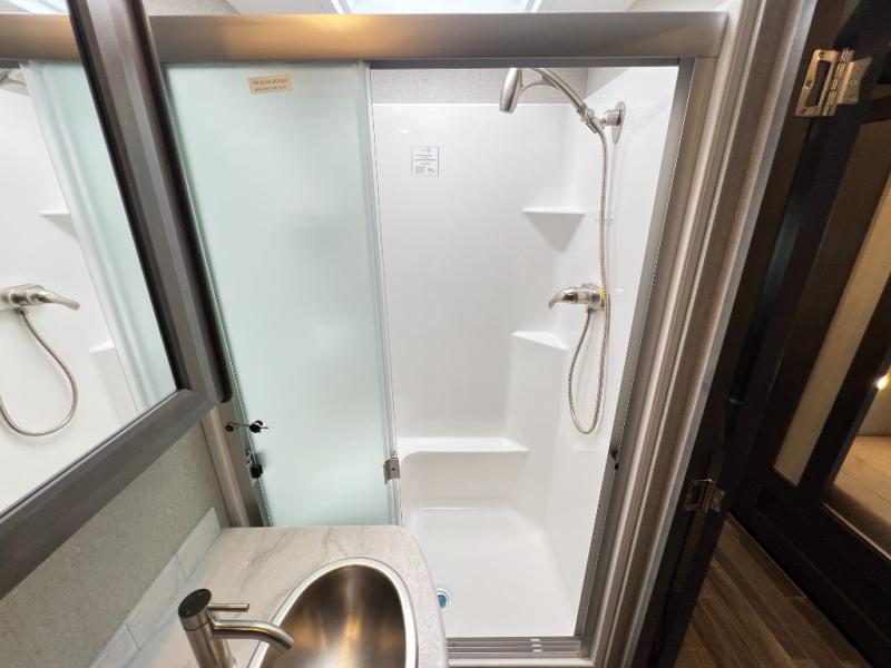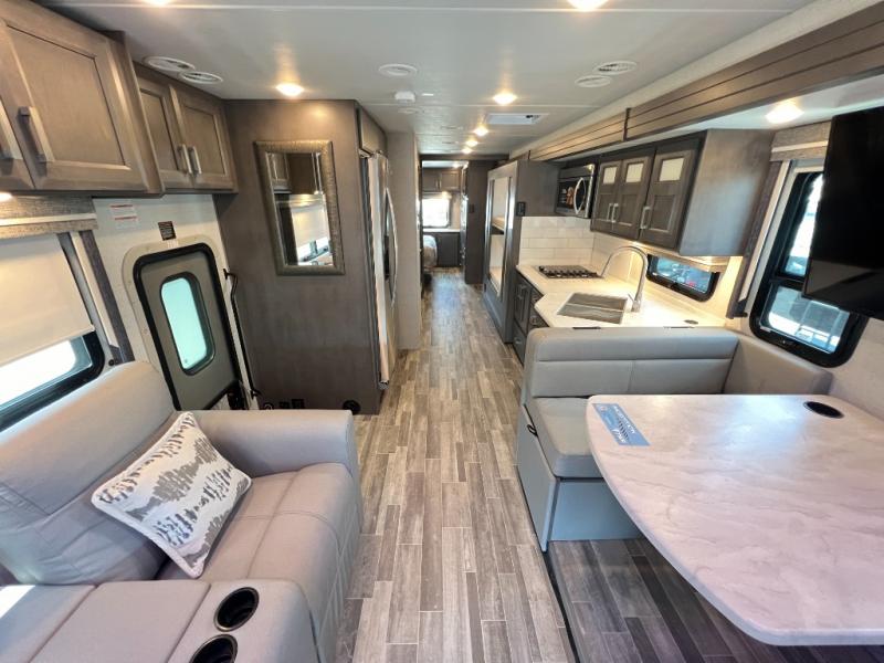 You won't even feel like you're traveling in this motorhome! The rear private bedroom offers at home comforts with a Tilt-A-View inclining king bed slide, a chest of drawers, a closet, and a 32" Smart TV to watch movies in bed. The kiddos can sleep on the set of 24" x 74" bunk beds and the 52" x 80" bunk over cab. Everyone can freshen up each morning in the full bathroom with the 30" x 42" shower which has a skylight above, an Oxygenics shower head, and foot flush porcelain toilet. Prepare your best home cooked meals with the two burner high output gas range top with single induction cooktop and enjoy them at the 78" Dream Dinette. The theater seating has the perfect view of the 50" Smart TV above the dinette, but you could switch the theater seating out for an optional sofa for more seating space.