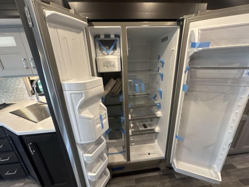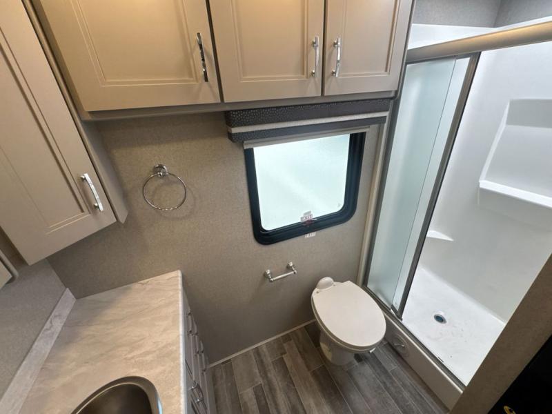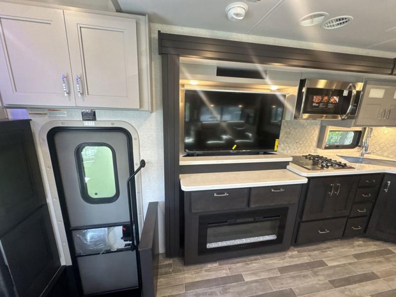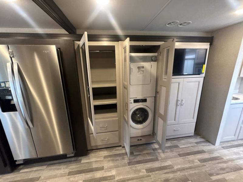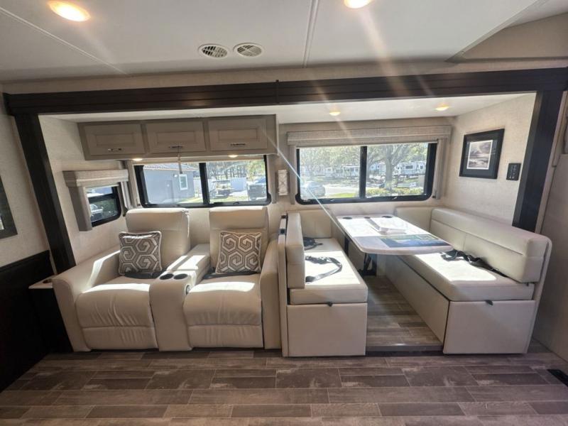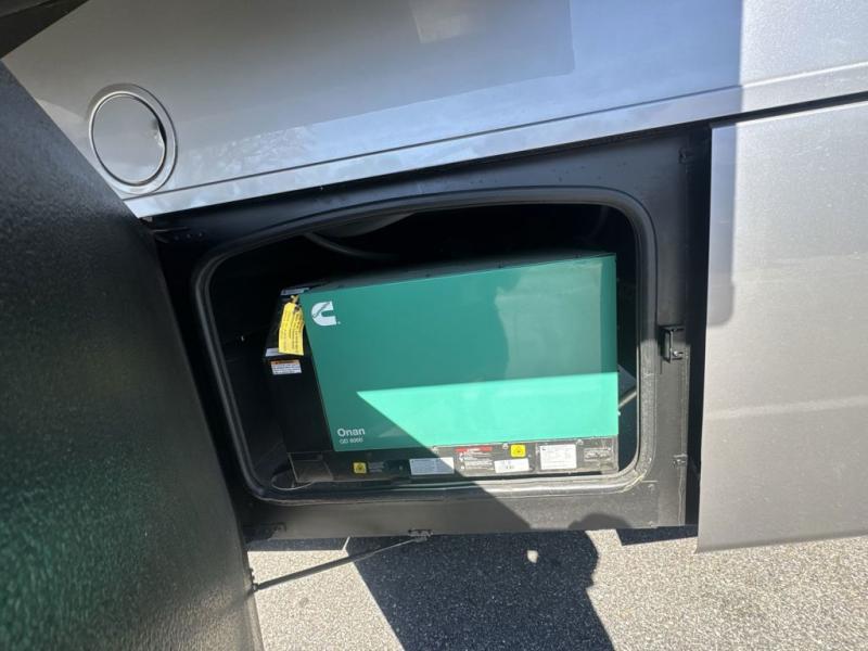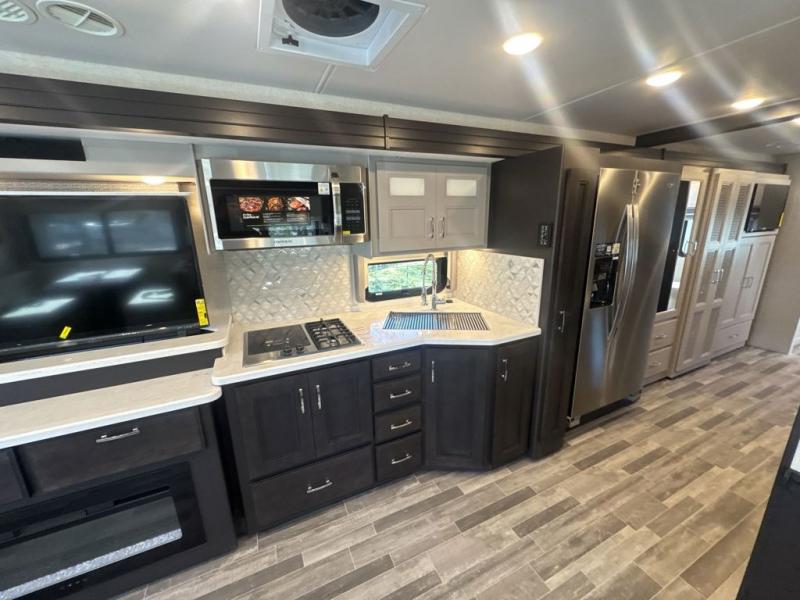 It's a clean decision to take this motorhome on your next trip with the bath and a half! The master suite offers at home comforts with a Tilt-A-View inclining king bed slide, a chest of drawers, a closet, and a 32" TV to watch movies in bed. The guests can sleep on the 52" x 80" bunk over cab and even convert the 72" Dream Dinette. Everyone can freshen up each morning in the full bathroom with the 30" x 36" shower which has a skylight above, an Oxygenics shower head, and a fiberglass shower with a glass door. Prepare your best home cooked meals with the two burner high output gas range top with single induction cooktop and easily take a bathroom break with the half bathroom nearby. The theater seating has the perfect view of the fireplace with a TV above it.