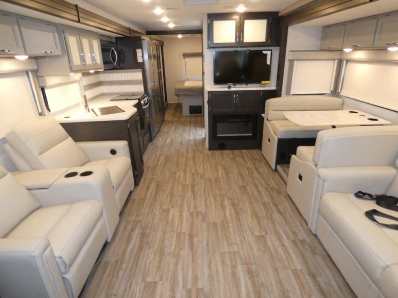 This spacious Class A motorhome has room to sleep eight! Enjoy the privacy of the rear king bedroom which has a spacious closet and a 32" LED Smart TV. Extra guests can utilize the Dream Dinette, the sofa bed, or the drop-down overhead bunk which has a Cotton Cloud mattress for comfort. As if that's not enough, there's a pair of leatherette theater seats with footrests so you can kick back and watch either the 39" or 50" LED Smart TV in the living room. You'll also find another TV outside. A full bath with 30" x 36" shower is conveniently located in the center so everyone has access, and the glass shower door and skylight make it feel roomy. The kitchen features a three-burner gas cooktop and oven, refrigerator, and stainless steel convection microwave. You will also appreciate the closet with stackable washer and dryer prep if you want to add those appliances!