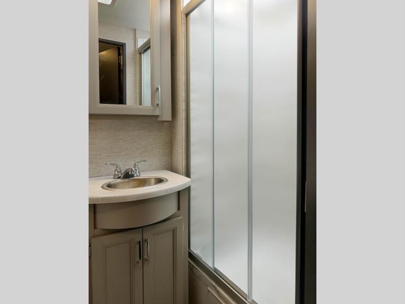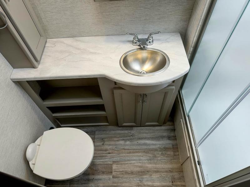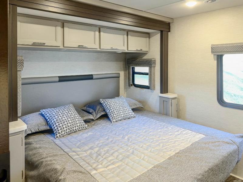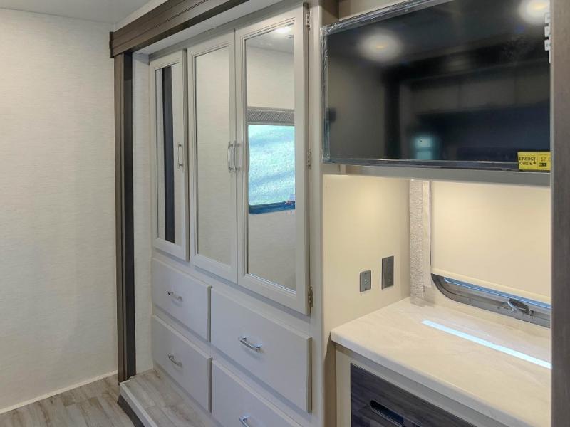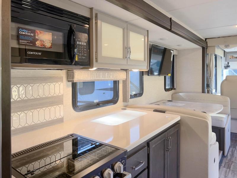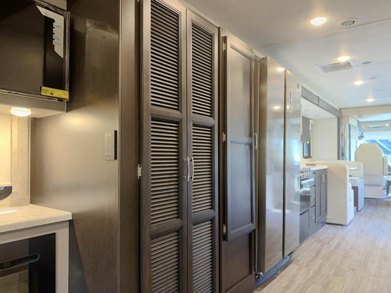 Enjoy added space and comfort in this coach with a full-wall slide out plus a second slide out in the rear bedroom. You will sleep soundly each night on the king bed, and you can easily grab a clean clothes from the closet and head to the full bath close by. Your guests can sleep on the Dream Dinette or on the drop-down overhead bunk with a 48" x 74" sleeping area. Once everyone is clean up and ready for the day, you can prepare breakfast on the three burner gas cooktop or in the 30" stainless steel over-the-range convection microwave. There is also a residential refrigerator and a pantry to store food for your trip. You will also enjoy spending time outdoors with a power awning with LED lights and an exterior 32" Smart TV with a Bluetooth built-in soundbar and radio!