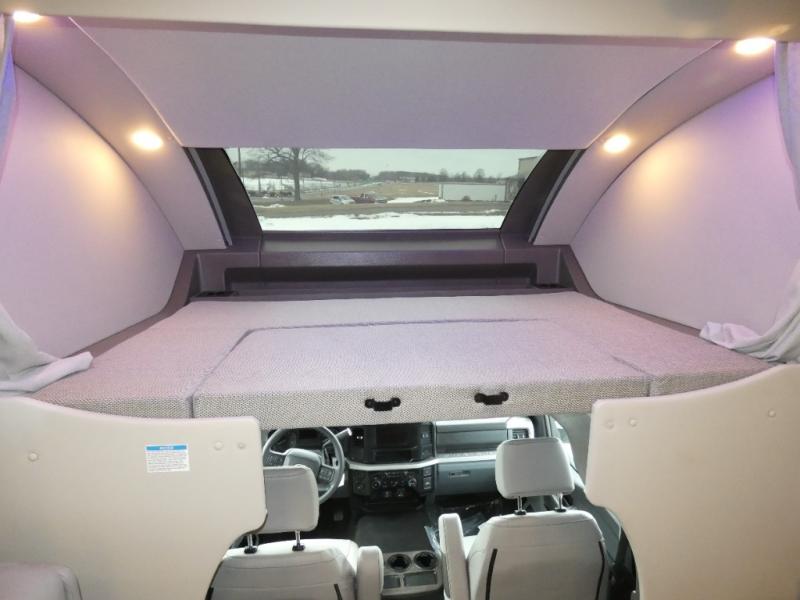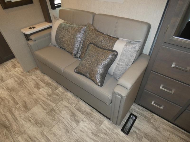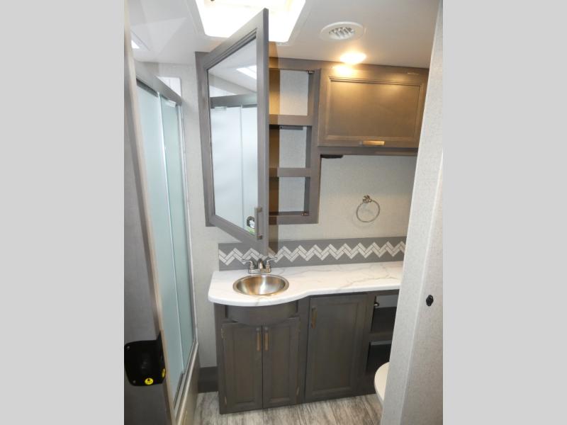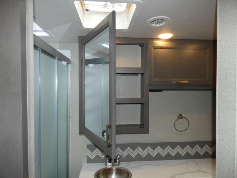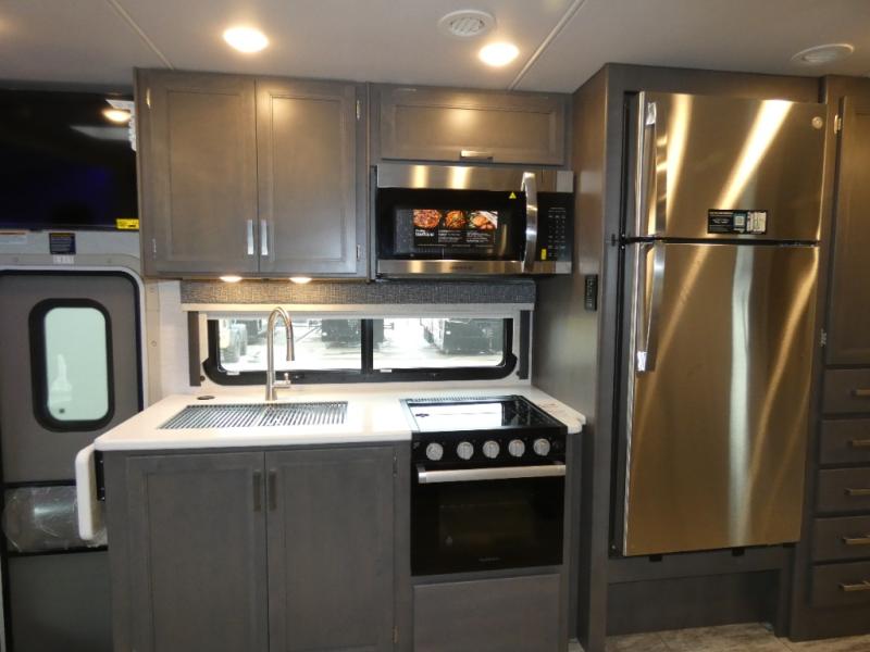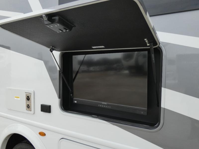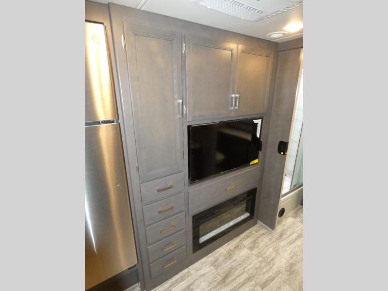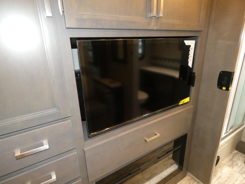 Relax in the full rear bathroom, featuring a spacious 30” x 36” shower. The living area boasts a versatile sofa with a murphy bed, perfect for guests or extra sleeping space. Cozy up by the fireplace, enjoy your favorite shows on the TV, and organize your stuff in the ample shelving and storage. The closet also provides additional space for your belongings. The kitchen is a culinary dream, equipped with a pantry, drawers, fridge, three-burner cooktop, and a microwave. Gather with family and friends at the 70” dream dinette, perfect for meals and game nights. Additional sleeping space is available in the front bunk over the cab, and when you're ready to take the party outside, enjoy your favorite shows on the exterior TV.