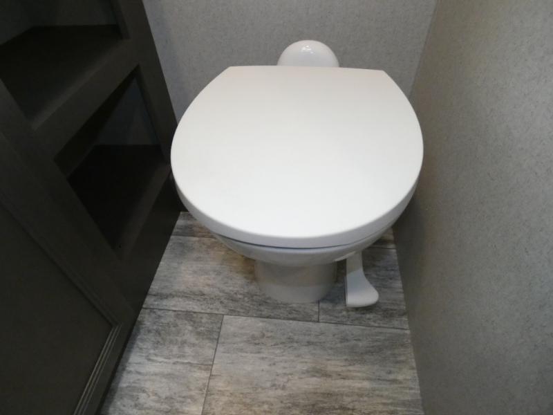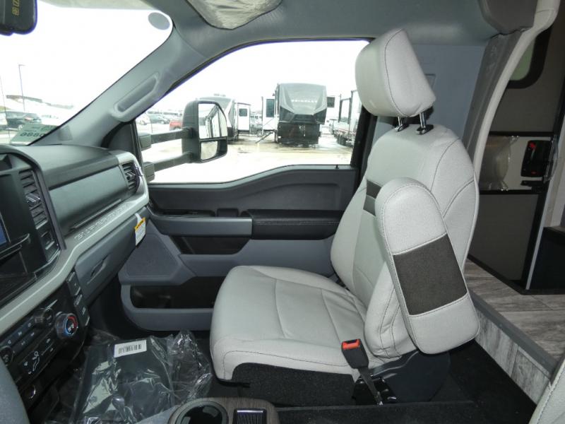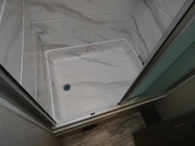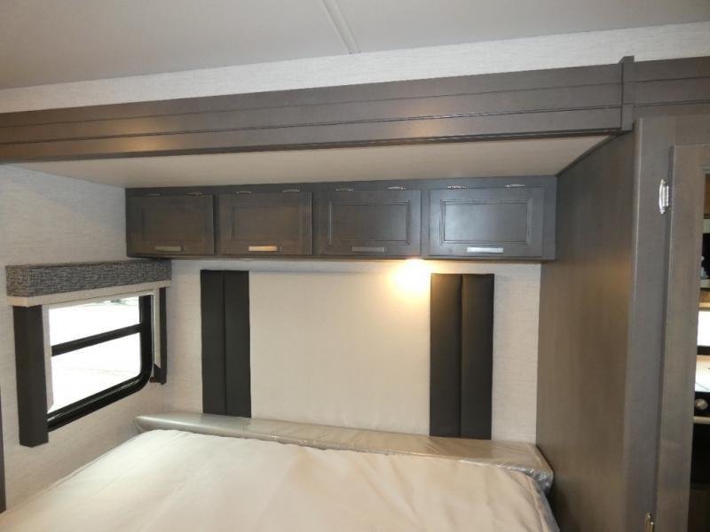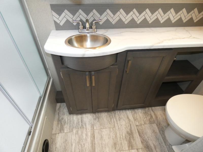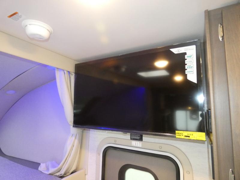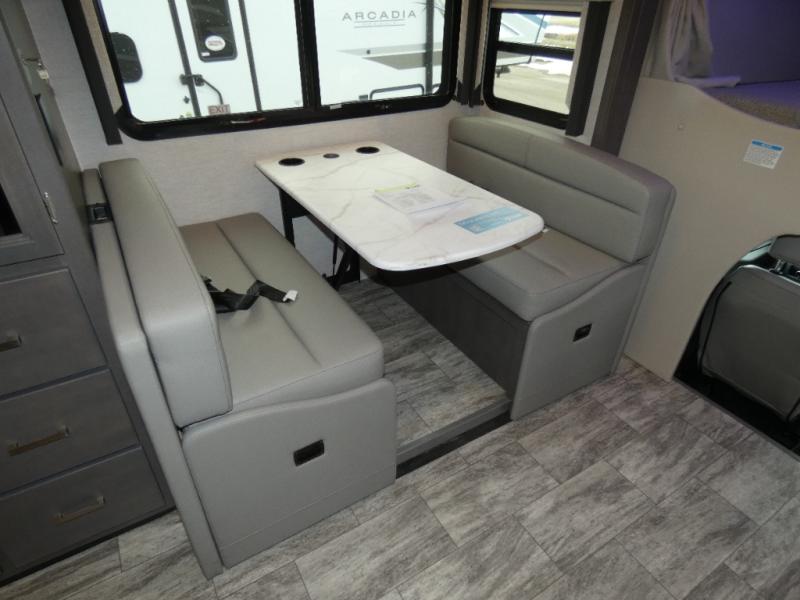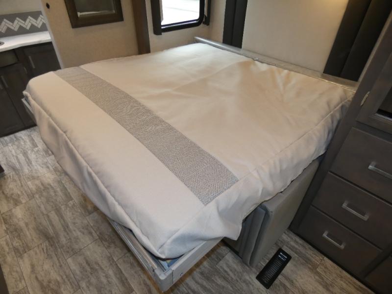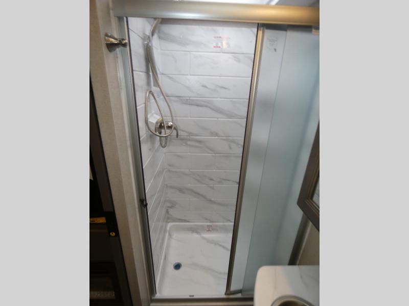 Relax in the full rear bathroom, featuring a spacious 30” x 36” shower. The living area boasts a versatile sofa with a murphy bed, perfect for guests or extra sleeping space. Cozy up by the fireplace, enjoy your favorite shows on the TV, and organize your stuff in the ample shelving and storage. The closet also provides additional space for your belongings. The kitchen is a culinary dream, equipped with a pantry, drawers, fridge, three-burner cooktop, and a microwave. Gather with family and friends at the 70” dream dinette, perfect for meals and game nights. Additional sleeping space is available in the front bunk over the cab, and when you're ready to take the party outside, enjoy your favorite shows on the exterior TV.