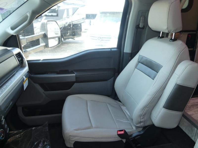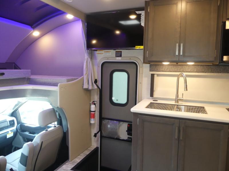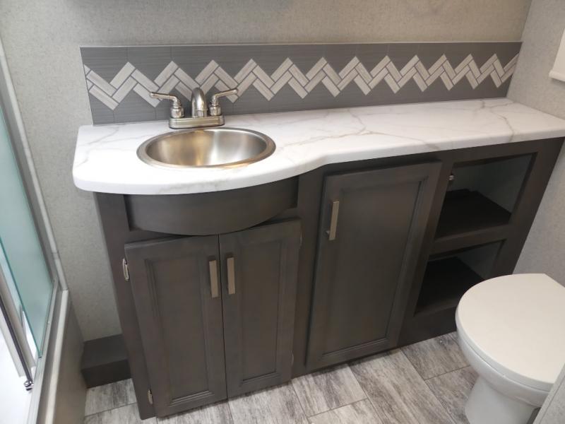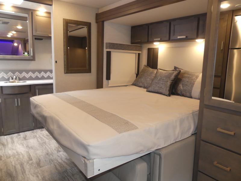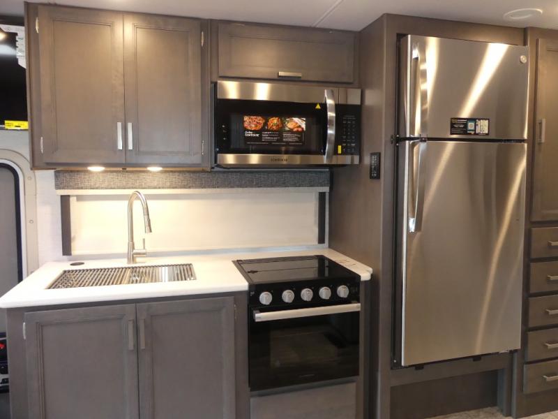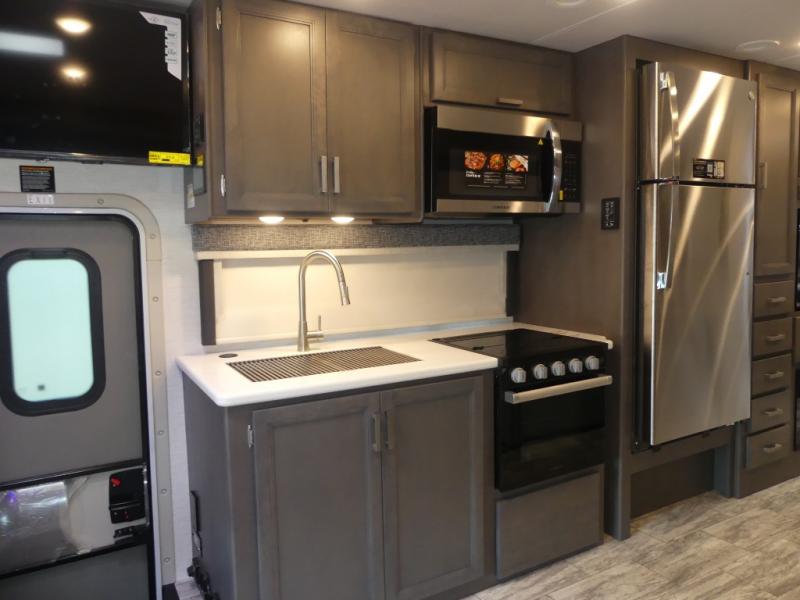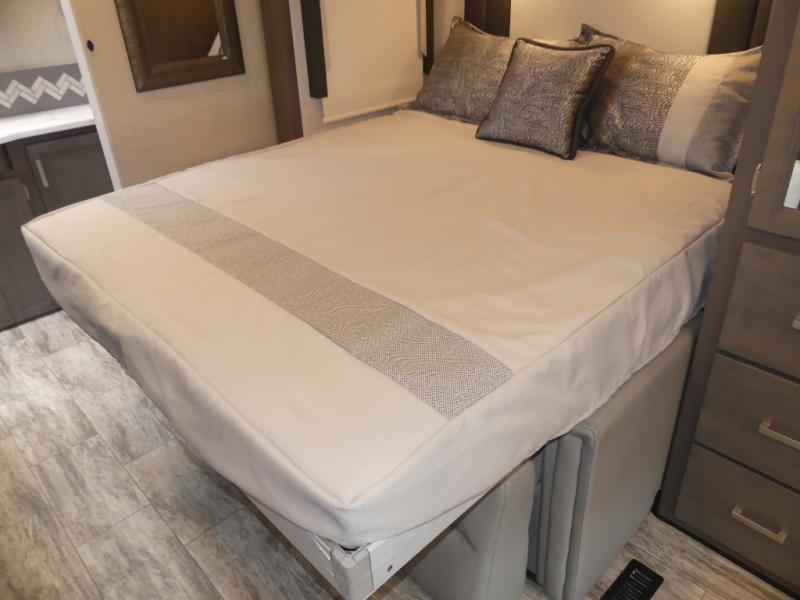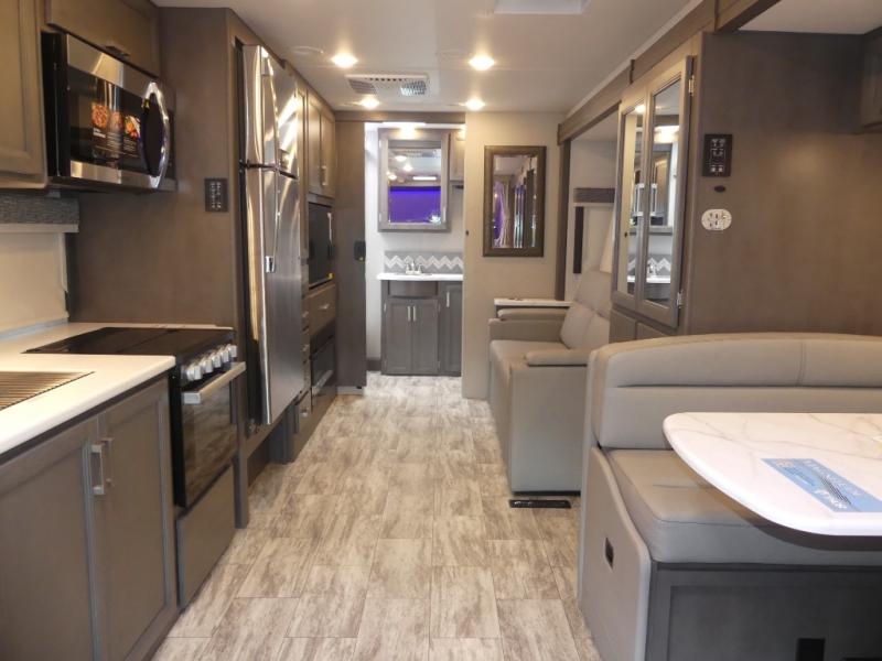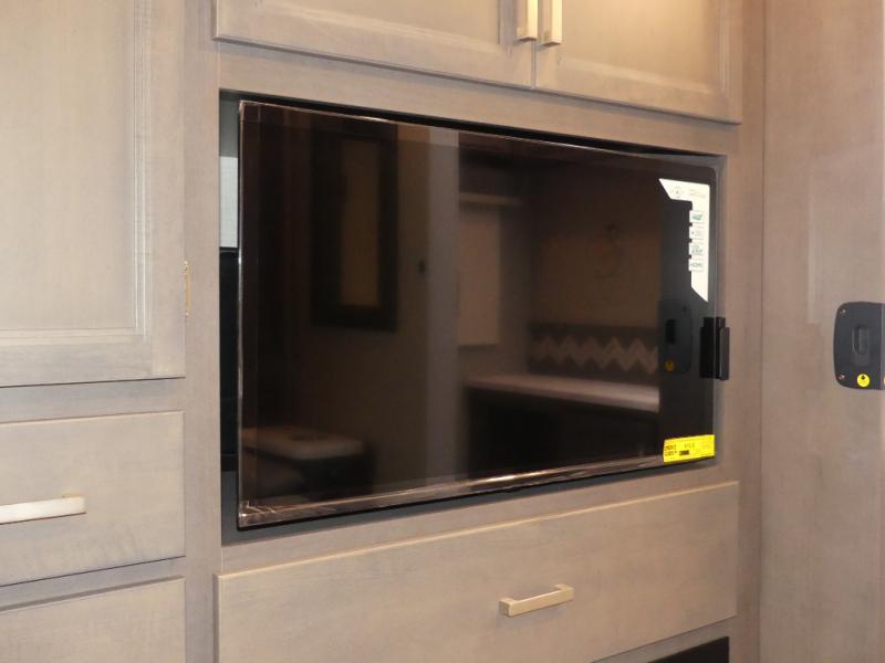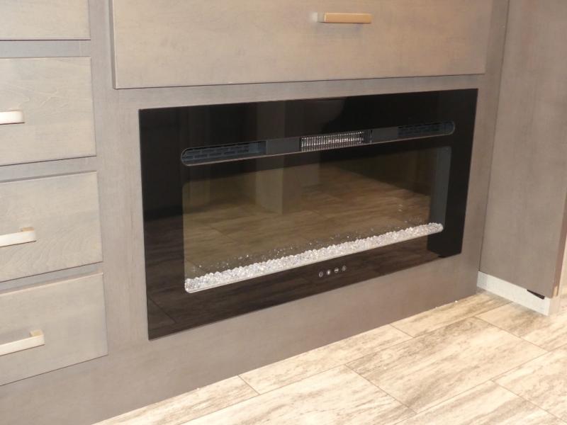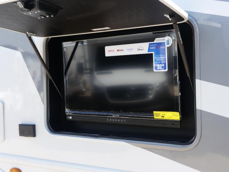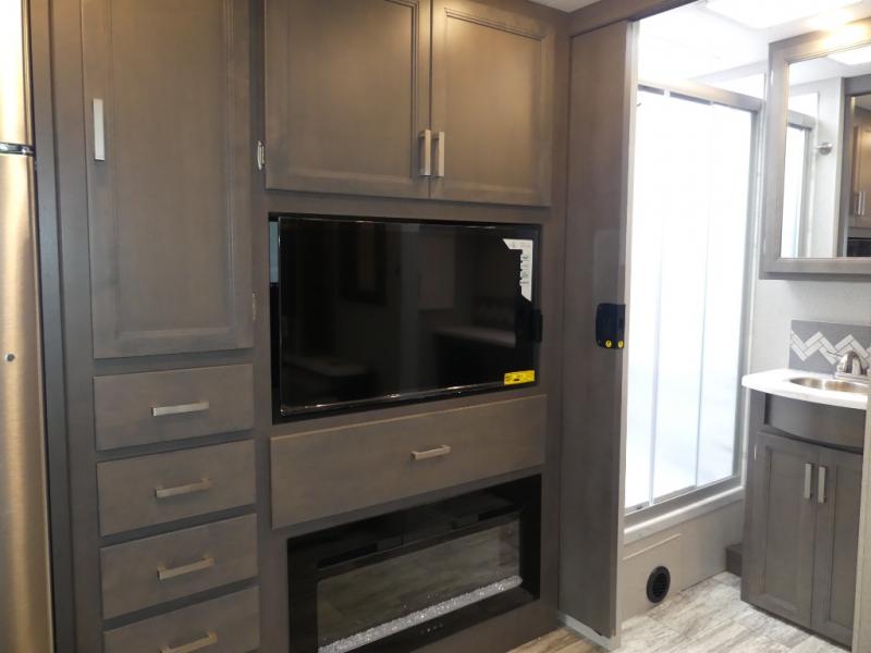 Relax in the full rear bathroom, featuring a spacious 30” x 36” shower. The living area boasts a versatile sofa with a murphy bed, perfect for guests or extra sleeping space. Cozy up by the fireplace, enjoy your favorite shows on the TV, and organize your stuff in the ample shelving and storage. The closet also provides additional space for your belongings. The kitchen is a culinary dream, equipped with a pantry, drawers, fridge, three-burner cooktop, and a microwave. Gather with family and friends at the 70” dream dinette, perfect for meals and game nights. Additional sleeping space is available in the front bunk over the cab, and when you're ready to take the party outside, enjoy your favorite shows on the exterior TV.