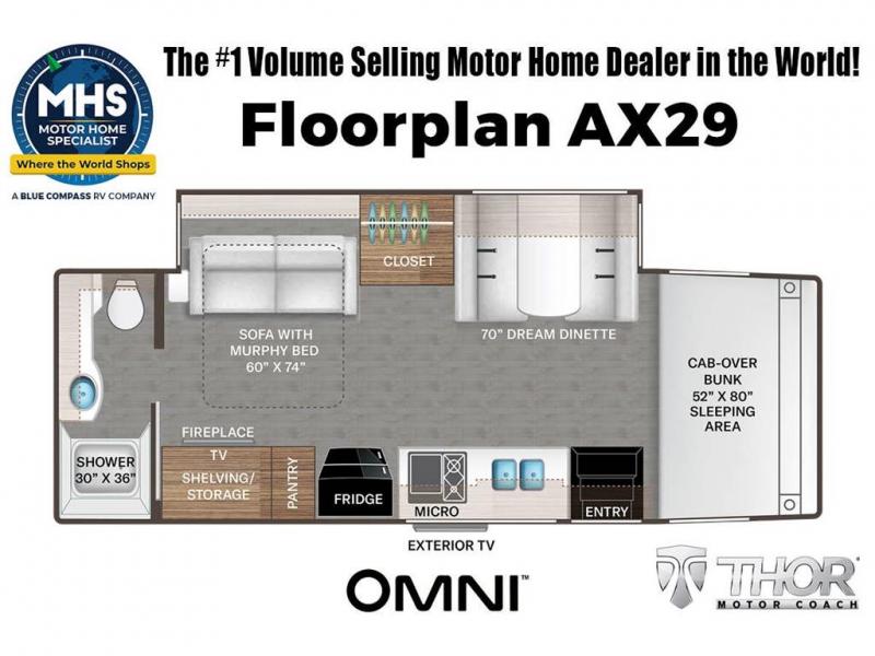 MSRP $292,110. New 2025 Thor Motor Coach Omni AX29 Super C is approximately 30 feet 8 inches in length with one slide out and is powered by the Ford® 6.7L Power Stroke® V8 turbo diesel engine with 330HP, 825 lb.-ft. torque and 10 speed transmission with selectable drive modes including Tow/Haul, Eco, Deep Sand/Snow. Options include the Solar charging system. Also includes a SYNC 3 Enhanced Voice Recognition Communications and Entertainment System, 8" Color LCD touchscreen with swiping capability, 911 assist, AppLink and smart-charging USB ports and navigation. The Omni Super C also features a 3 camera monitoring system, aluminum wheels, automatic leveling jacks, power patio awning with LED lighting, frameless windows, keyless entry, residential refrigerator, large OTR convection microwave, solid surface kitchen counter top, ball bearing drawer guides, large TV in living area, exterior entertainment center with sound bar, 6KW Onan diesel generator with automatic generator start, multiplex wiring control system, tankless water heater, 1800-watt inverter and much more. For additional details on this unit and our entire inventory including brochures, window sticker, videos, photos, reviews & testimonials as well as additional information about Motor Home Specialist and our manufacturers please visit us at MHSRV.com or call 800-335-6054. At Motor Home Specialist, we DO NOT charge any prep or orientation fees like you will find at other dealerships. All sale prices include a 200-point inspection, interior & exterior wash, detail service and a fully automated high-pressure rain booth test and coach wash that is a standout service unlike that of any other in the industry. You will also receive a thorough coach orientation with an MHSRV technician, a night stay in our delivery park featuring landscaped and covered pads with full hook-ups and much more! Read Thousands upon Thousands of 5-Star Reviews at MHSRV.com and See What They Had to Say About Their Experience at Motor Home Specialist. WHY PAY MORE? WHY SETTLE FOR LESS?