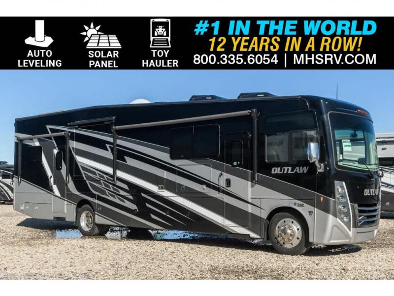MSRP $298,928. New 2025 Thor Motor Coach Outlaw Toy Hauler model 38MB is approximately 39 feet 10 inches in length with 2 slide-out rooms, high polished aluminum wheels, residential refrigerator, electric rear patio awning, three season patio doors with screen privacy panels in the garage, roller shades on the driver & passenger windows, as well as drop down ramp door with spring assist & railing for patio use. This beautiful new motorhome also features the new Ford chassis with 7.3L PFI V-8, a 6-speed TorqShift® automatic transmission, an updated instrument cluster, automatic headlights and a tilt/telescoping steering wheel. The Outlaw toy hauler RV has an incredible list of standard features including beautiful wood & interior decor packages, LED TVs, (3) A/C units, power patio awing with integrated LED lighting, dual side entrance doors, 1-piece windshield, a 5500 Onan generator, 3 camera monitoring system, automatic leveling system, Soft Touch leather furniture and day/night shades. Options include the upgraded solar charging system. For additional details on this unit and our entire inventory including brochures, window sticker, videos, photos, reviews & testimonials as well as additional information about Motor Home Specialist and our manufacturers please visit us at MHSRV.com or call 800-335-6054. At Motor Home Specialist, we DO NOT charge any prep or orientation fees like you will find at other dealerships. All sale prices include a 200-point inspection, interior & exterior wash, detail service and a fully automated high-pressure rain booth test and coach wash that is a standout service unlike that of any other in the industry. You will also receive a thorough coach orientation with an MHSRV technician, a night stay in our delivery park featuring landscaped and covered pads with full hook-ups and much more! Read Thousands upon Thousands of 5-Star Reviews at MHSRV.com and See What They Had to Say About Their Experience at Motor Home Specialist. WHY PAY MORE? WHY SETTLE FOR LESS?
