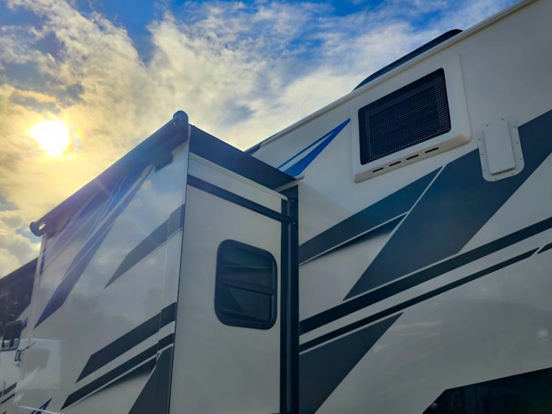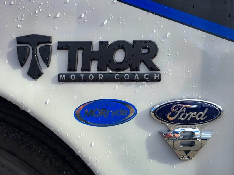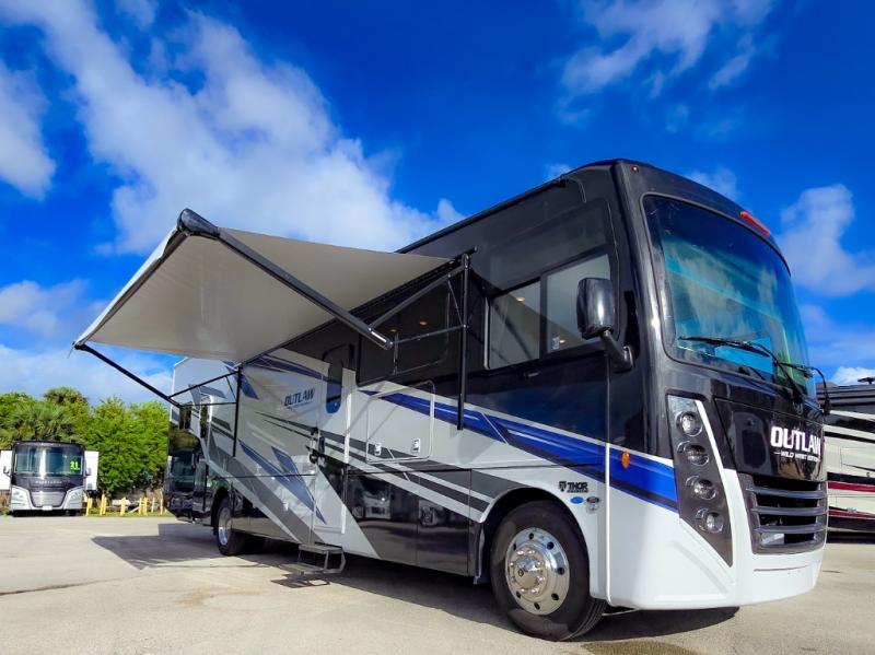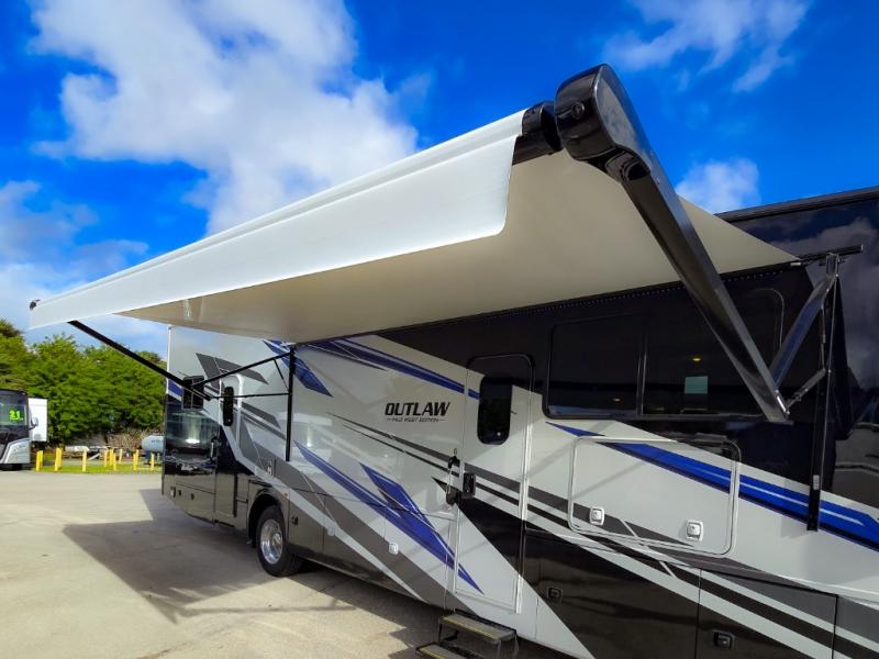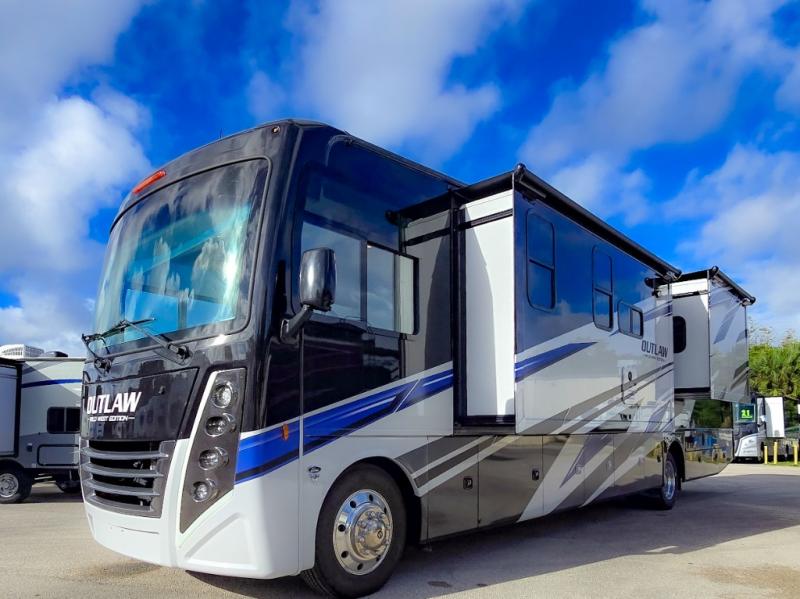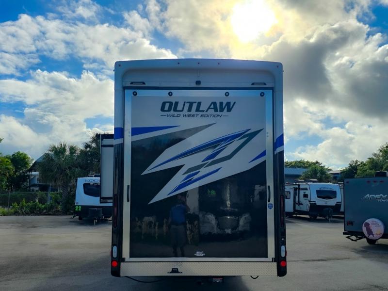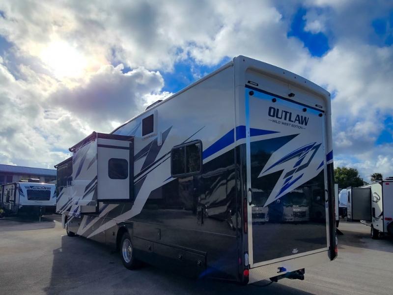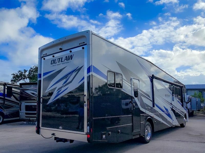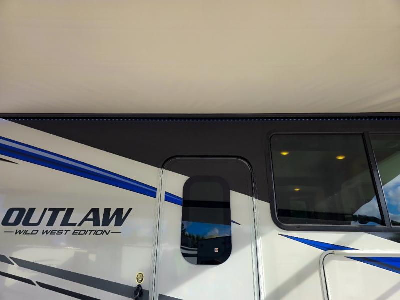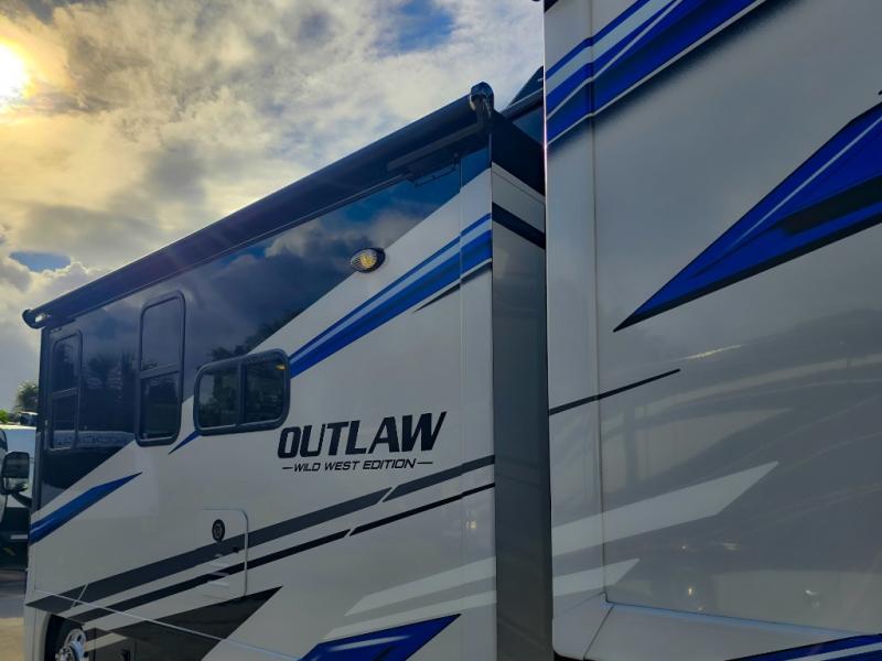 With any Outlaw Wild West Edition Class A gas toy hauler by Thor Motor Coach, you will have a capable and powerful motorhome for all your adventures. There is a vacu-bond laminated roof, walls, and floor with block foam insulation, a premium one-piece domed roof membrane, and a welded tubular steel floor for added strength. You will love having an 8,000 lb. trailer hitch for your towing needs, and the air ventilation sidewalls vents in the garage will be appreciated when gas and oil odors are present. Head inside to find residential vinyl flooring, full extension soft close metal ball-bearing drawer guides, and solid surface countertops in the kitchen. Some of the cockpit features the driver will enjoy are the 10.1" touchscreen dash radio, the blind spot detection, and the back-up monitor for easier parking. The RapidCamp+ multiplex wiring control system with a 7" screen also comes standard, along with an Onan RV QG 5500 gas generator with automatic generator start for added convenience. More utilities include a tankless water heater, a whole coach water filtration system, a 100-watt solar charging system, and more!