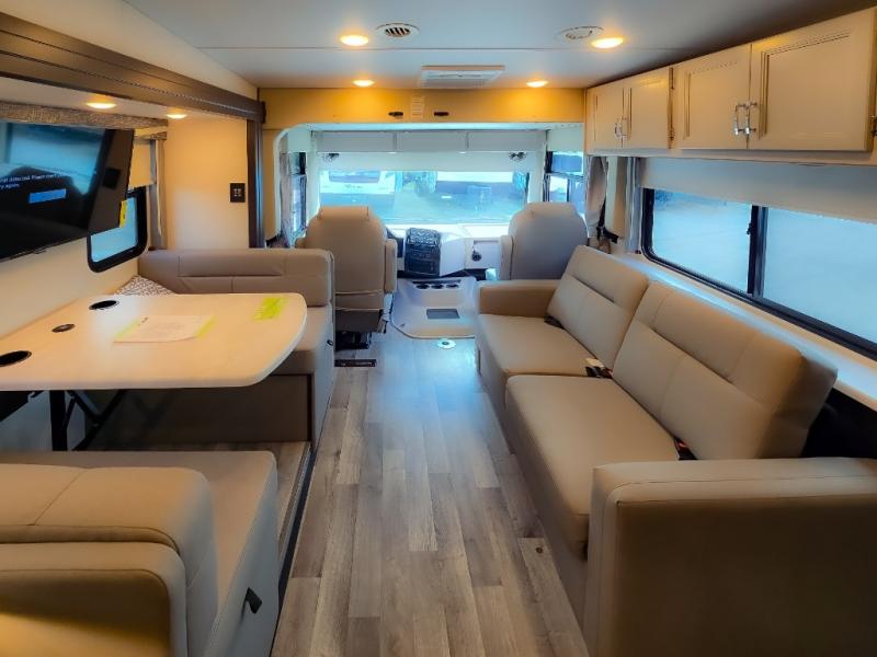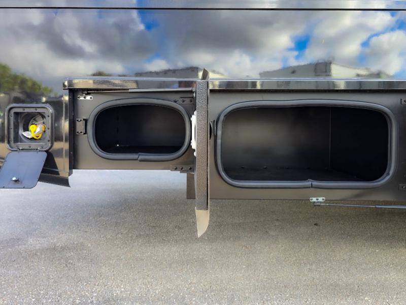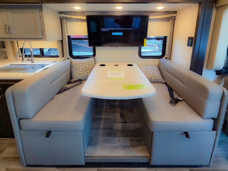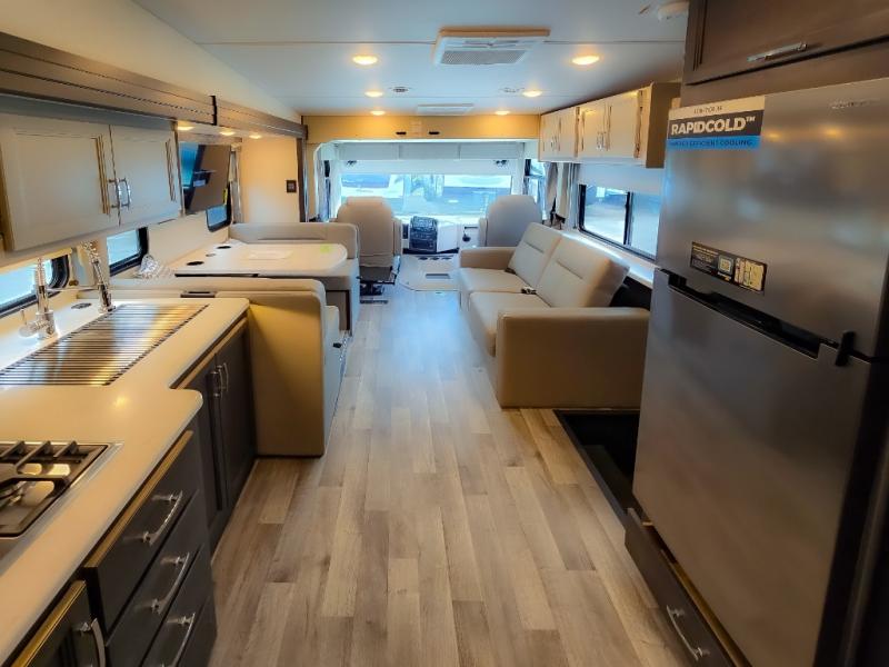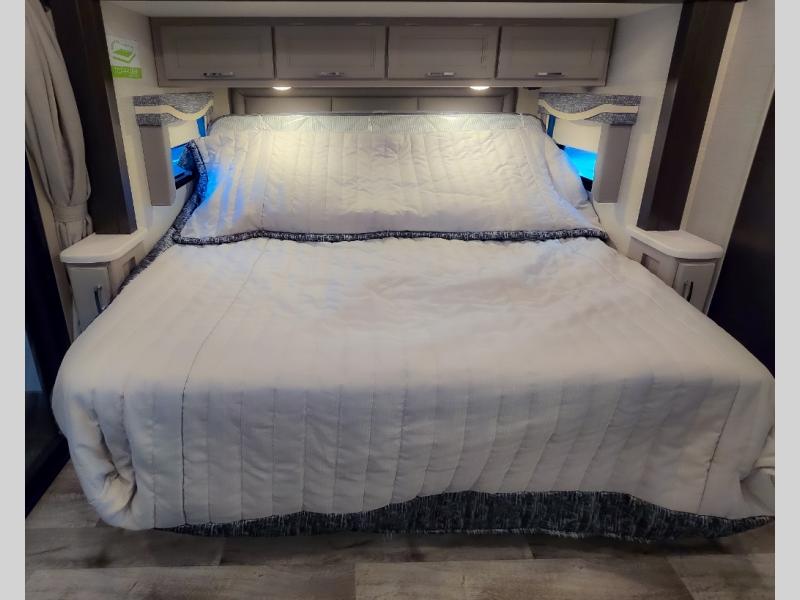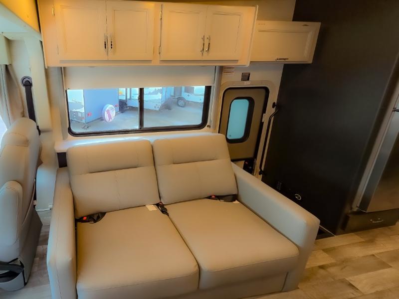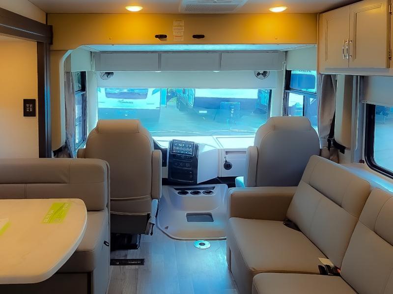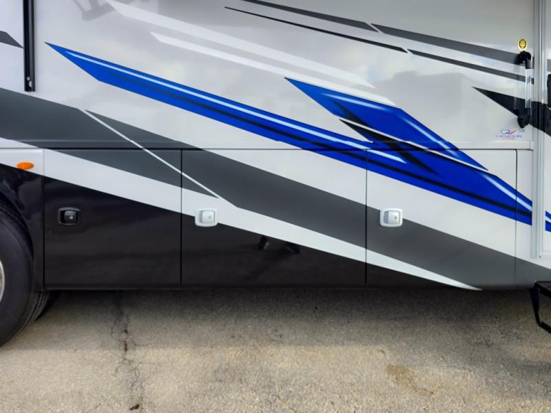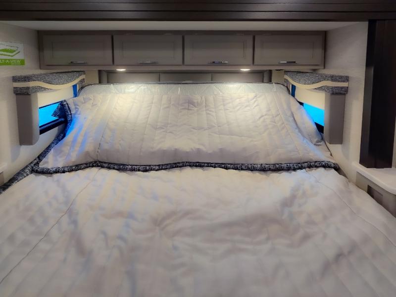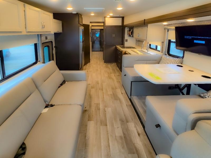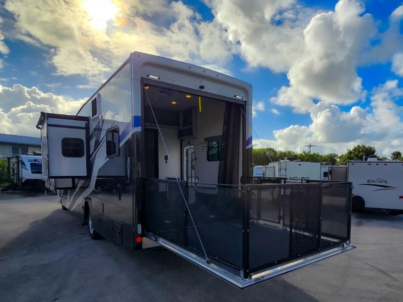 With any Outlaw Wild West Edition Class A gas toy hauler by Thor Motor Coach, you will have a capable and powerful motorhome for all your adventures. There is a vacu-bond laminated roof, walls, and floor with block foam insulation, a premium one-piece domed roof membrane, and a welded tubular steel floor for added strength. You will love having an 8,000 lb. trailer hitch for your towing needs, and the air ventilation sidewalls vents in the garage will be appreciated when gas and oil odors are present. Head inside to find residential vinyl flooring, full extension soft close metal ball-bearing drawer guides, and solid surface countertops in the kitchen. Some of the cockpit features the driver will enjoy are the 10.1" touchscreen dash radio, the blind spot detection, and the back-up monitor for easier parking. The RapidCamp+ multiplex wiring control system with a 7" screen also comes standard, along with an Onan RV QG 5500 gas generator with automatic generator start for added convenience. More utilities include a tankless water heater, a whole coach water filtration system, a 100-watt solar charging system, and more!