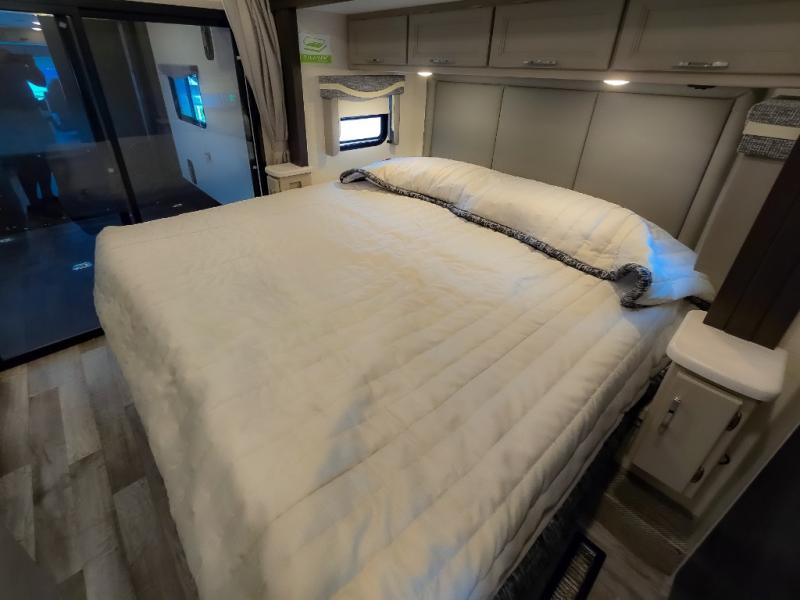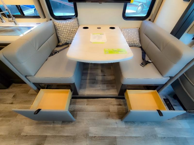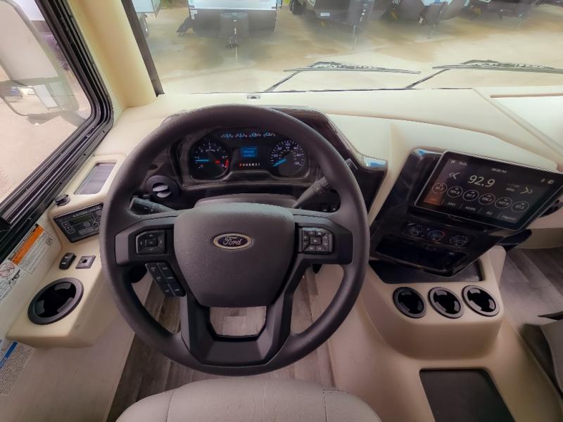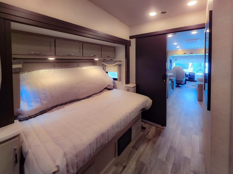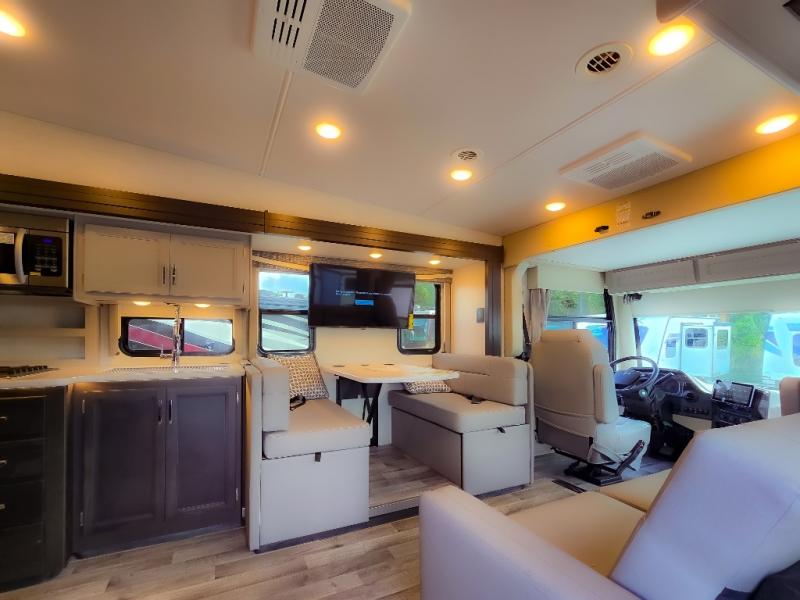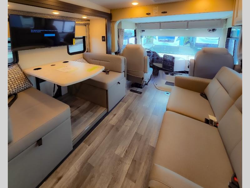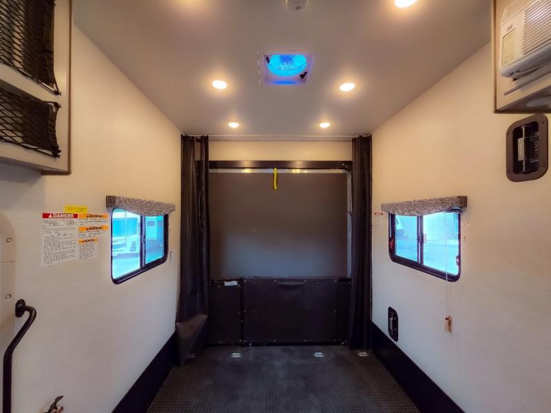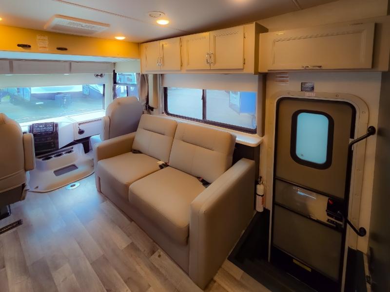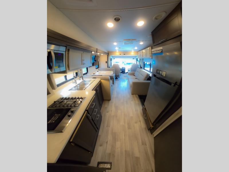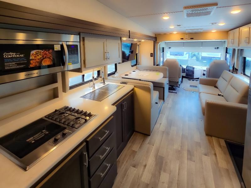 With any Outlaw Wild West Edition Class A gas toy hauler by Thor Motor Coach, you will have a capable and powerful motorhome for all your adventures. There is a vacu-bond laminated roof, walls, and floor with block foam insulation, a premium one-piece domed roof membrane, and a welded tubular steel floor for added strength. You will love having an 8,000 lb. trailer hitch for your towing needs, and the air ventilation sidewalls vents in the garage will be appreciated when gas and oil odors are present. Head inside to find residential vinyl flooring, full extension soft close metal ball-bearing drawer guides, and solid surface countertops in the kitchen. Some of the cockpit features the driver will enjoy are the 10.1" touchscreen dash radio, the blind spot detection, and the back-up monitor for easier parking. The RapidCamp+ multiplex wiring control system with a 7" screen also comes standard, along with an Onan RV QG 5500 gas generator with automatic generator start for added convenience. More utilities include a tankless water heater, a whole coach water filtration system, a 100-watt solar charging system, and more!