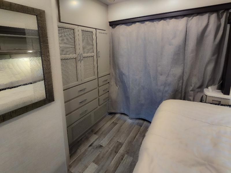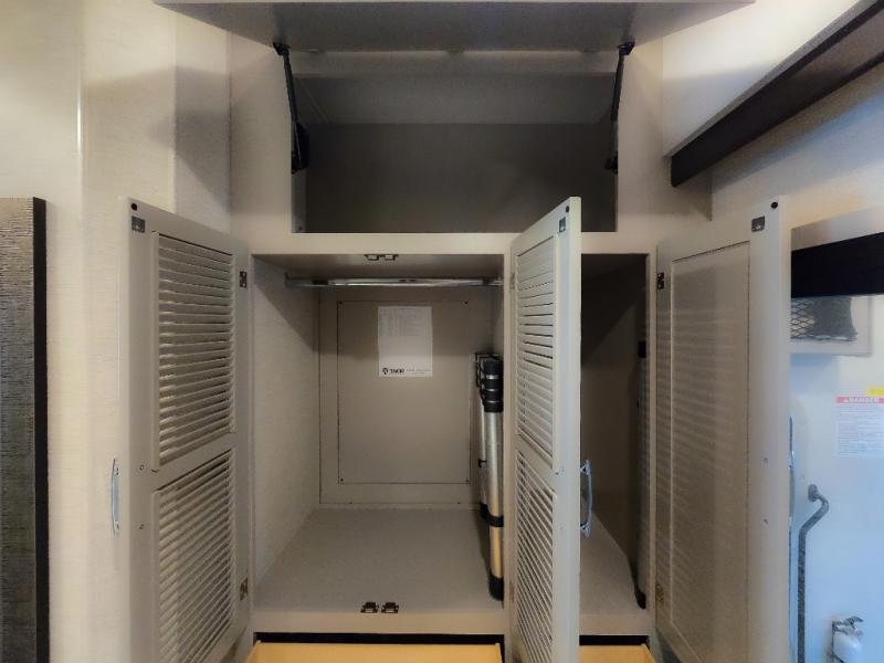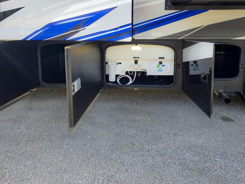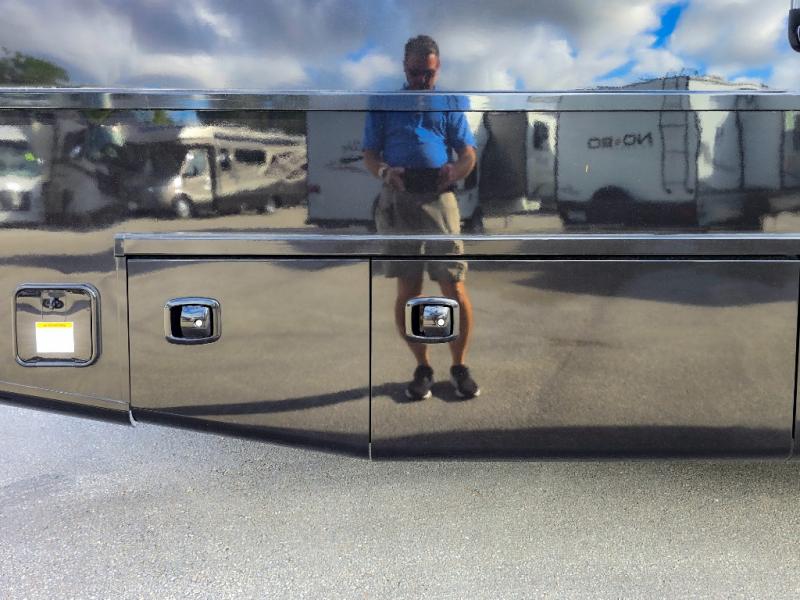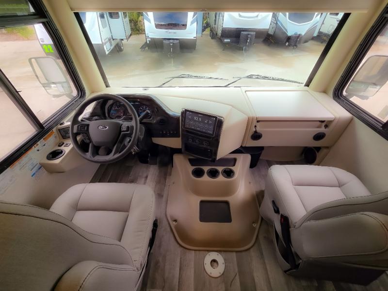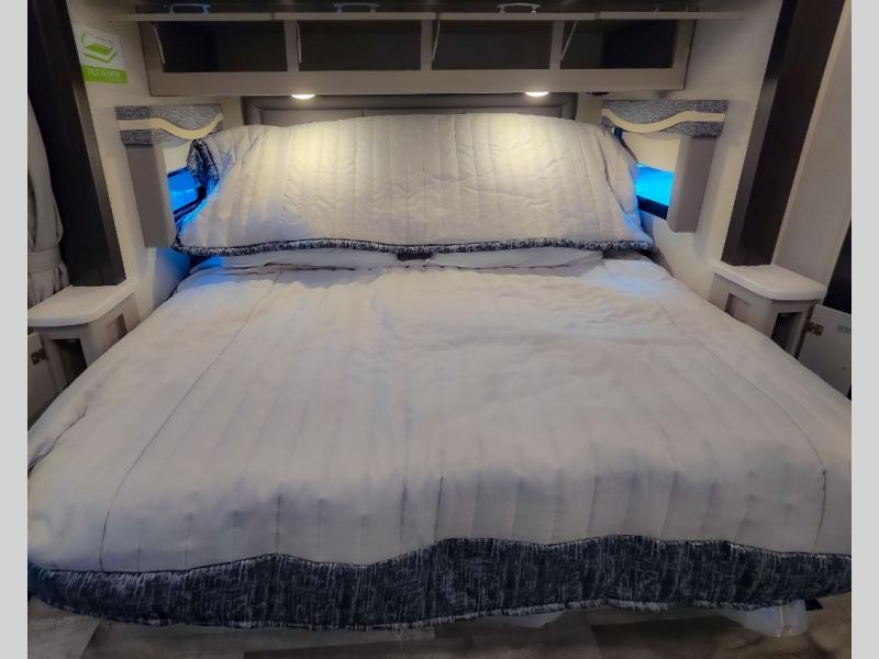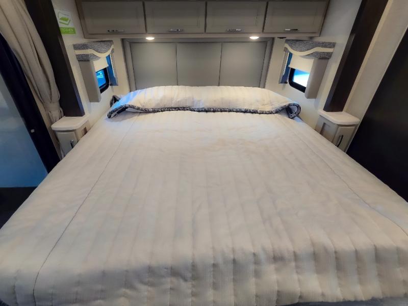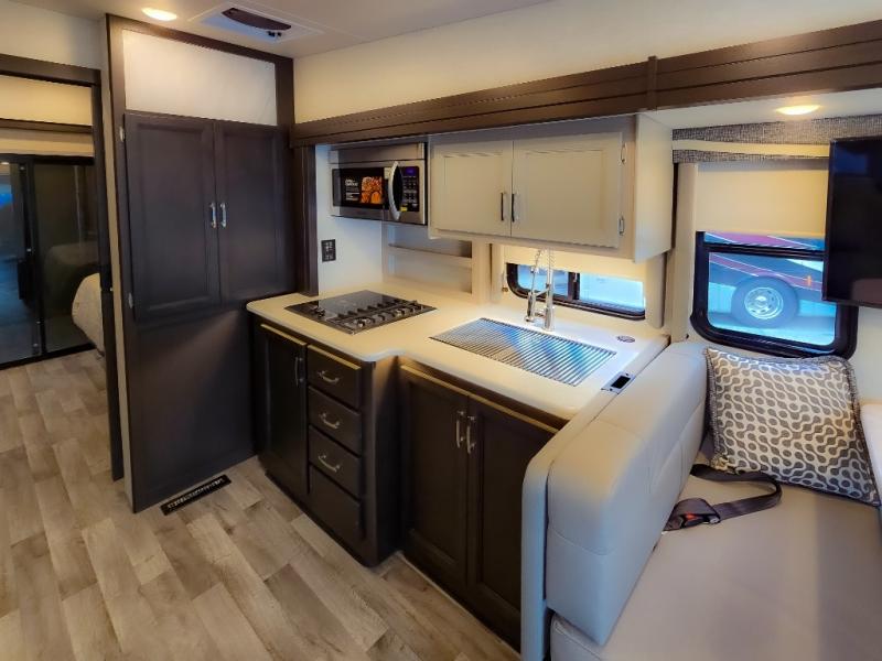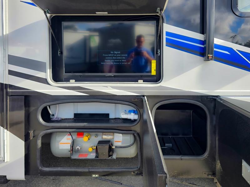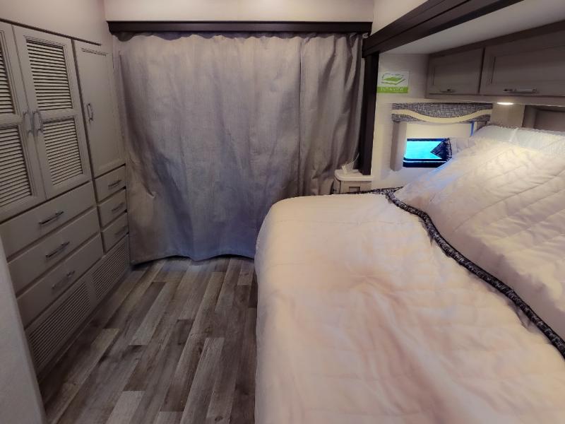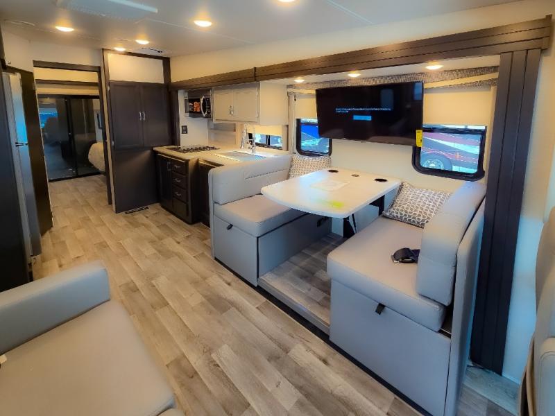 With any Outlaw Wild West Edition Class A gas toy hauler by Thor Motor Coach, you will have a capable and powerful motorhome for all your adventures. There is a vacu-bond laminated roof, walls, and floor with block foam insulation, a premium one-piece domed roof membrane, and a welded tubular steel floor for added strength. You will love having an 8,000 lb. trailer hitch for your towing needs, and the air ventilation sidewalls vents in the garage will be appreciated when gas and oil odors are present. Head inside to find residential vinyl flooring, full extension soft close metal ball-bearing drawer guides, and solid surface countertops in the kitchen. Some of the cockpit features the driver will enjoy are the 10.1" touchscreen dash radio, the blind spot detection, and the back-up monitor for easier parking. The RapidCamp+ multiplex wiring control system with a 7" screen also comes standard, along with an Onan RV QG 5500 gas generator with automatic generator start for added convenience. More utilities include a tankless water heater, a whole coach water filtration system, a 100-watt solar charging system, and more!