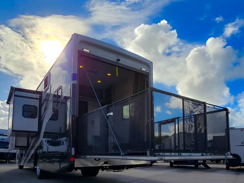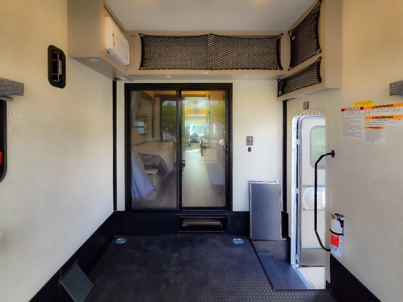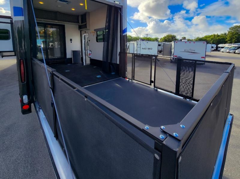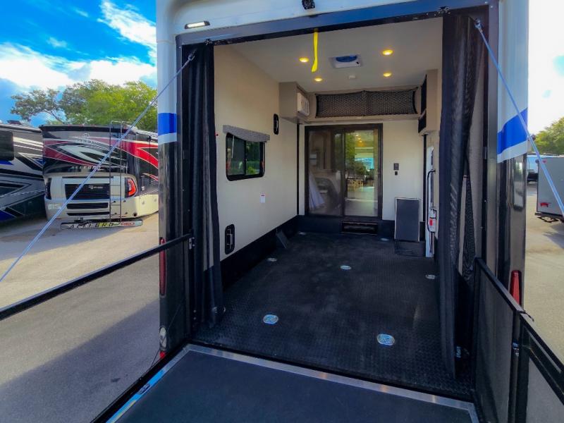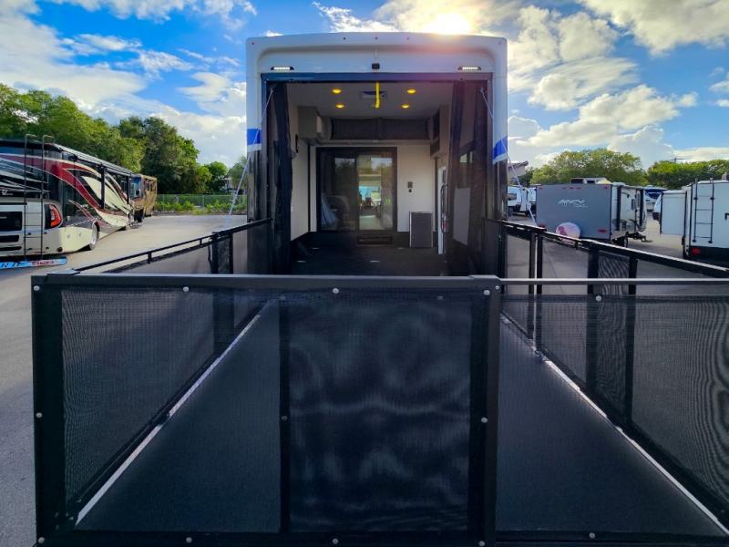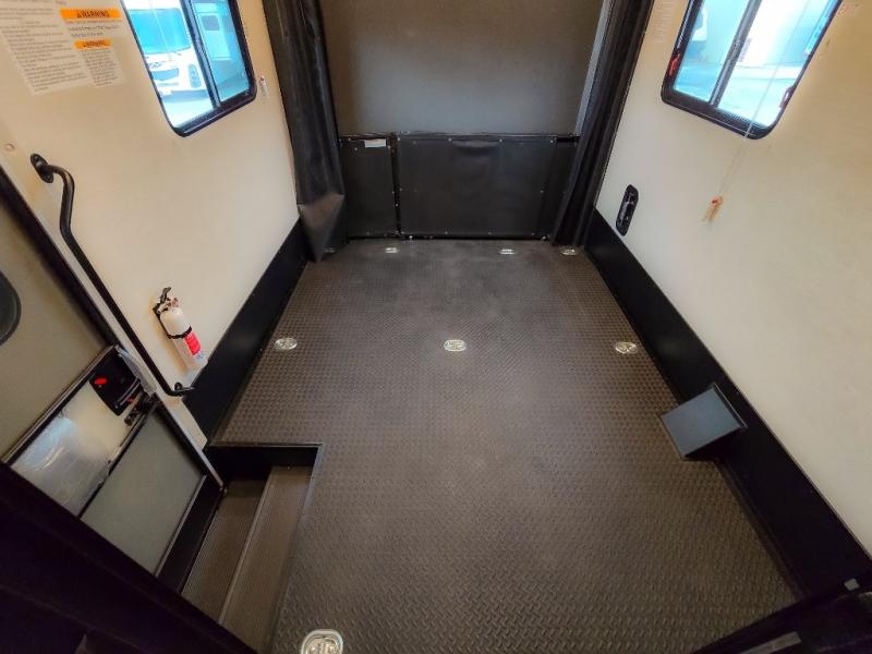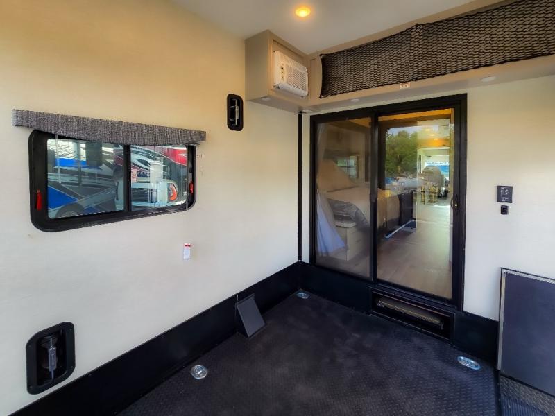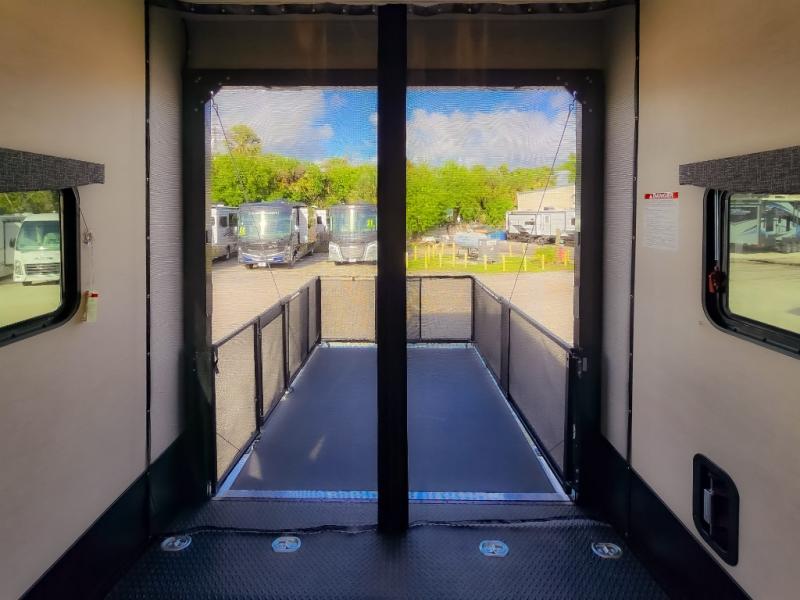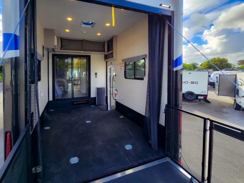 Whether you're heading to the lake, a bike show, or business expo, this toy hauler coach will be perfect for all your needs. You will have an 8' x 10' 2" garage with ample space for your items, and the bug screen on the back will let you enjoy fresh air without the bugs. You can also use the ramp door as a patio deck when you want to entertain guests! The private bedroom includes a king bed slide out across from TV prep and a closet with washer and dryer prep if you want the option to make laundry day easier. The kitchen includes a two burner gas range with a single induction cooktop, an over-the-range convection microwave, and a residential refrigerator for generous food storage. Your crew can get comfortable on the Dream Dinette and sofa bed, and there is a drop-down overhead bunk for more sleeping space!