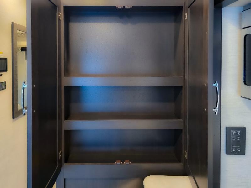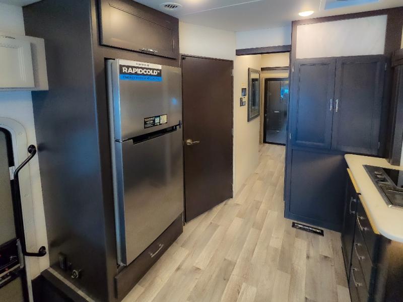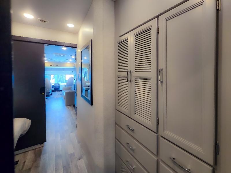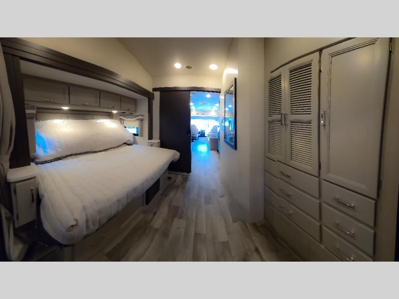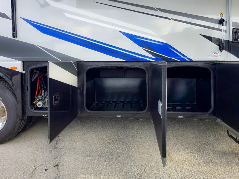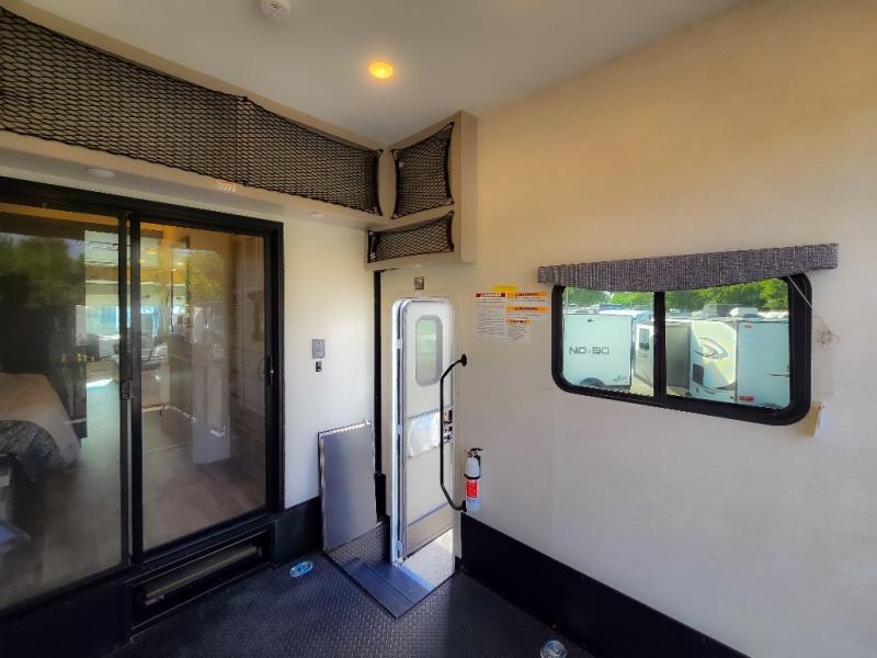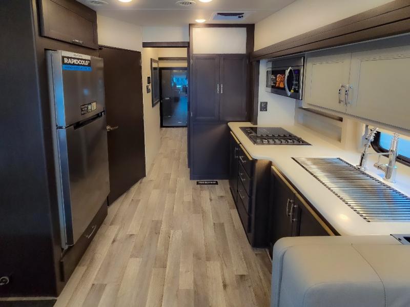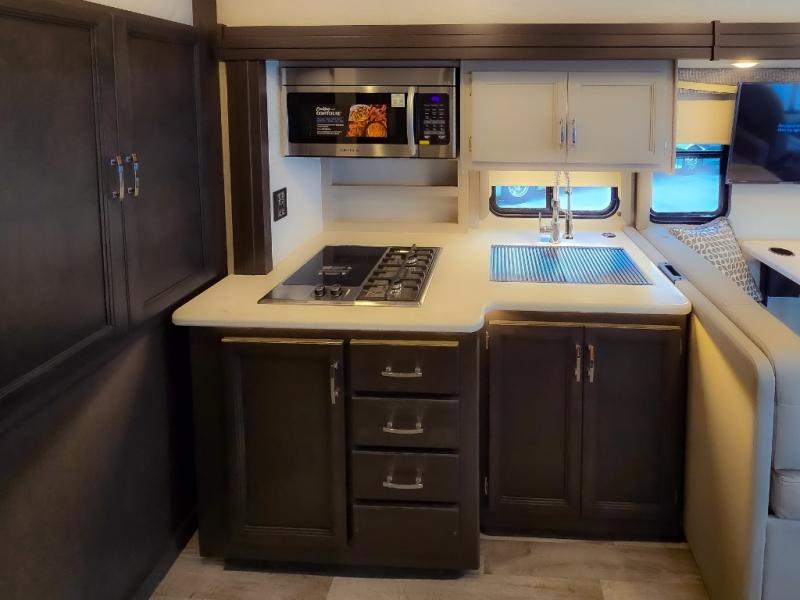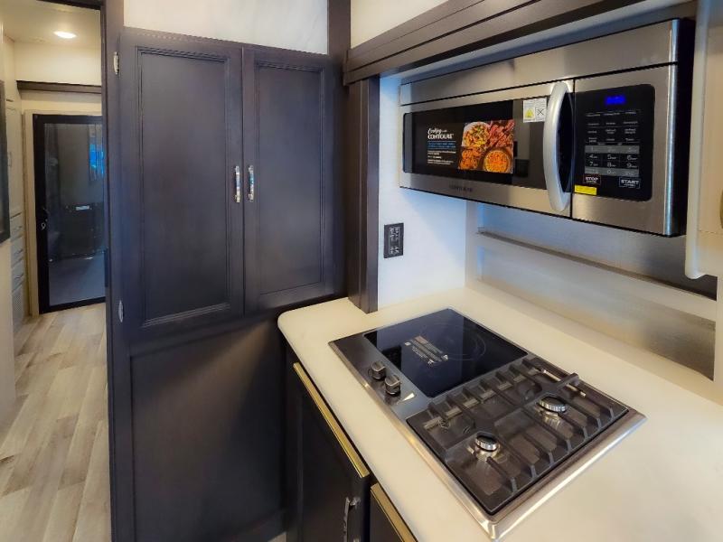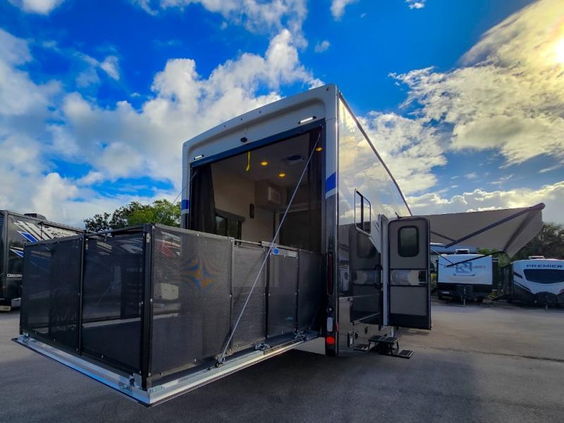 Whether you're heading to the lake, a bike show, or business expo, this toy hauler coach will be perfect for all your needs. You will have an 8' x 10' 2" garage with ample space for your items, and the bug screen on the back will let you enjoy fresh air without the bugs. You can also use the ramp door as a patio deck when you want to entertain guests! The private bedroom includes a king bed slide out across from TV prep and a closet with washer and dryer prep if you want the option to make laundry day easier. The kitchen includes a two burner gas range with a single induction cooktop, an over-the-range convection microwave, and a residential refrigerator for generous food storage. Your crew can get comfortable on the Dream Dinette and sofa bed, and there is a drop-down overhead bunk for more sleeping space!
