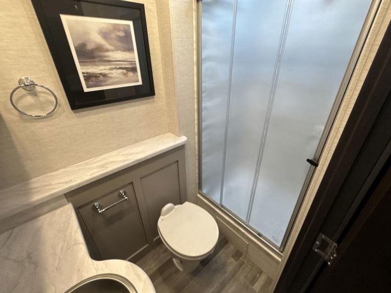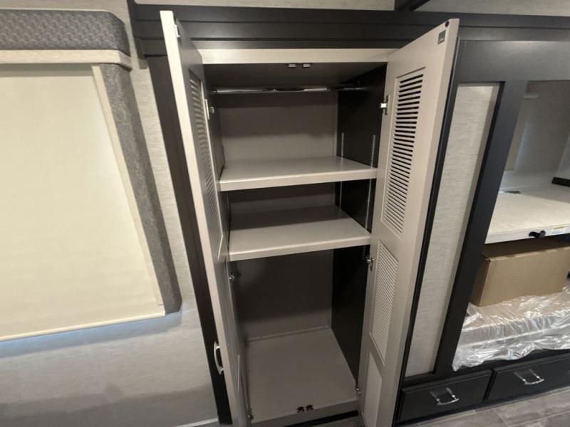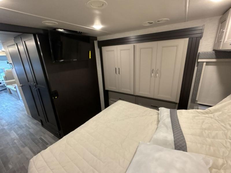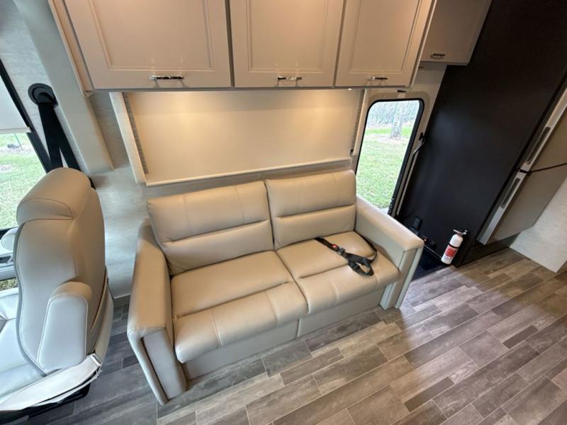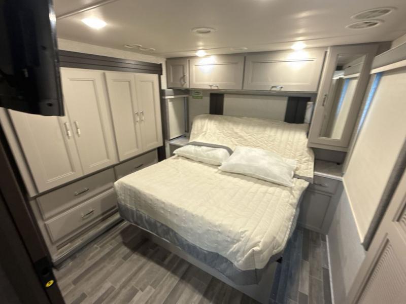 The whole family can travel together in this motorhome! The kiddos can sleep on the 24" x 27" bunk beds that can convert to a wardrobe and the 48" x 74" bunk over cab provides additional sleeping space. The rear private bedroom has a Tilt-A-View inclining queen bed for a good night's rest, a closet slide, a 32" LED TV to watch your favorite movies in comfort, and an area that has stacking washer and dryer prep. You could even transform the 72" Dream Dinette and 67" jackknife sofa into extra sleeping spaces or switch out the sofa for the optional 67" theater seats. Freshen up each morning in the full bathroom with the 30" x 36" shower, and enjoy entertainment even outdoors with the outside TV!