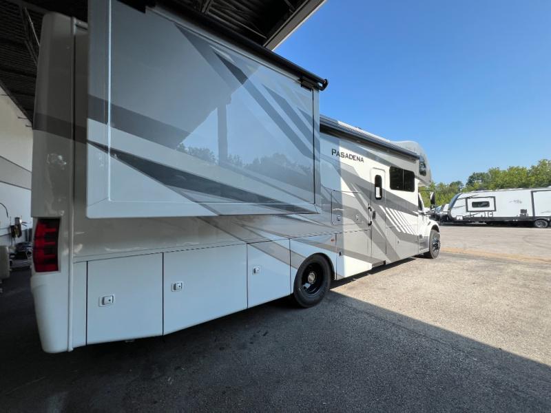 With any Pasadena Super C diesel motorhome by Thor Motor Coach, the rotocast basement pass-through storage compartments are durable and easy to clean. Other capabilities include the automotive dash with Android Auto and/or Apple CarPlay on a large 10.1" touch screen when you plug in your phone, and a side view camera system, plus a significant gross combined vehicle rating of the chassis allows plenty of pulling capacity even when fully loaded. There is even solar onboard and a Winegard ConnecT 2.0 system to stay connected. The S2RV Freightliner chassis with Atlas foundation might be the reason you looked at this coach, yet all the other features might be why you decide to go big and choose a Pasadena such as the residential luxury vinyl tile flooring, the leatherette home theater seating with footrests, the solid surface countertops and designer backsplash in the kitchen, and the list continues!