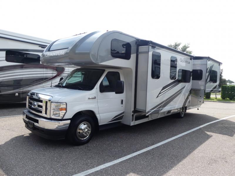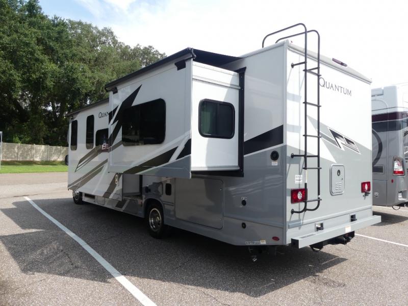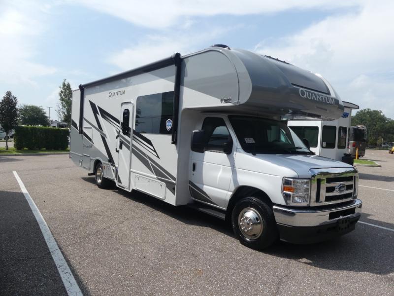 With any Quantum Class C gas motorhome by Thor Motor Coach, you will find a welded tubular aluminum roof and sidewall cage construction, plus a fiberglass front cap with a skylight and power shade for added privacy. The interior offers residential vinyl flooring, Leatherette furniture, and full extension soft close metal ball-bearing drawer guides. The driver is sure to appreciate the touchscreen dash radio and back-up monitor to make maneuvering in and out of campgrounds easier than ever. A 4.0kW gas generator and 30-amp shoreline power cord will provide the power you need for your adventures, and the 100-watt solar charging system with a power controller will provide off-grid capabilities.