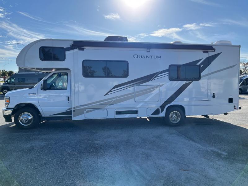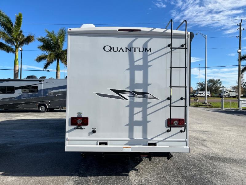 With any Quantum Class C gas motorhome by Thor Motor Coach, you will find a welded tubular aluminum roof and sidewall cage construction, plus a fiberglass front cap with a skylight and power shade for added privacy. The interior offers residential vinyl flooring, Leatherette furniture, and full extension soft close metal ball-bearing drawer guides. The driver is sure to appreciate the touchscreen dash radio and back-up monitor to make maneuvering in and out of campgrounds easier than ever. A 4.0kW gas generator and 30-amp shoreline power cord will provide the power you need for your adventures, and the 100-watt solar charging system with a power controller will provide off-grid capabilities.