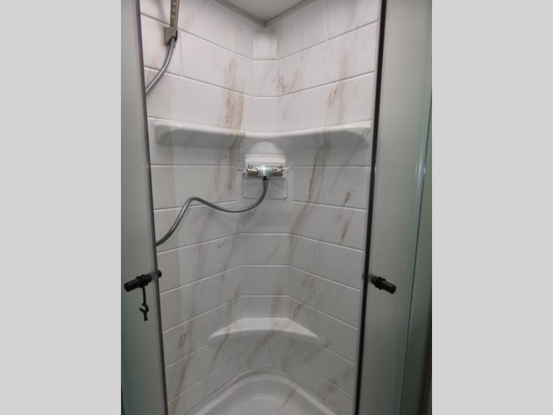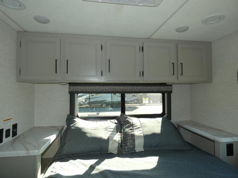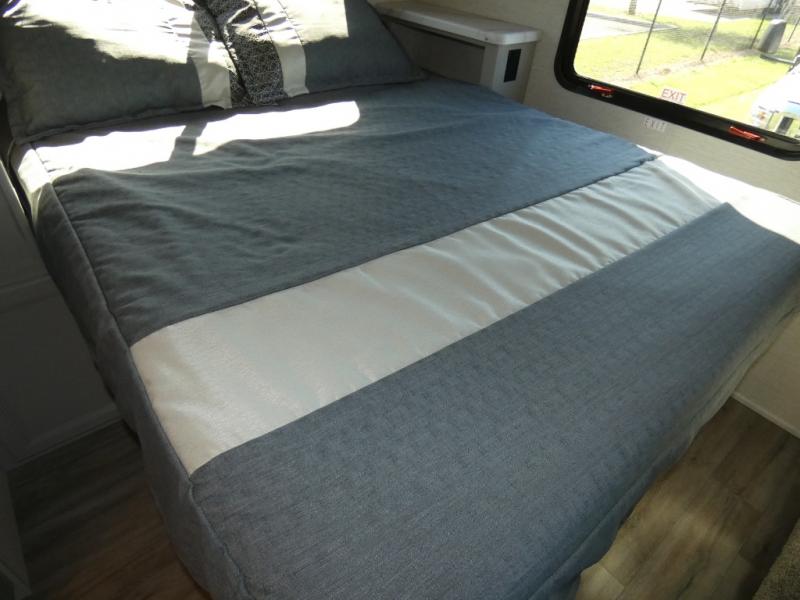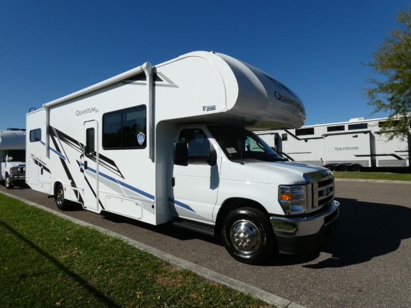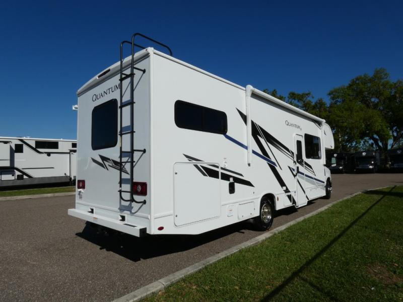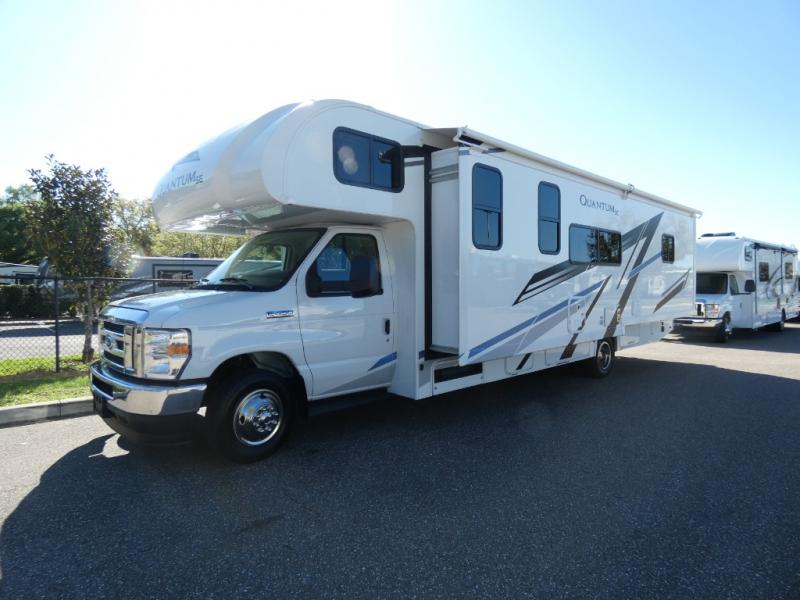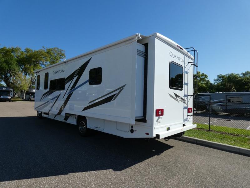 Each Quantum SE is constructed atop a durable Ford E-Series chassis on select models. A one piece fiberglass front cap and slick fiberglass exterior with a graphics package provide a stylish appearance that is easy to maintain for years of family travel, plus there is premium one-piece Crossflex roofing for added durability. You will also love the keyless entry, black framed windows, and solar prep with a solar controller for off-grid capabilities. Each unit provides a power awning with integrated LED lighting, a convenient roof ladder, and lighted rotocast storage compartments so you can easily find what you need even after dark. The on-board 4.0 kw gas generator and 30-amp shoreline power cord will keep your adventures powered up, and the tankless water heater will be a feature you won't want to camp without. Why not make one of these Quantum SE models your new traveling home-on-wheels.