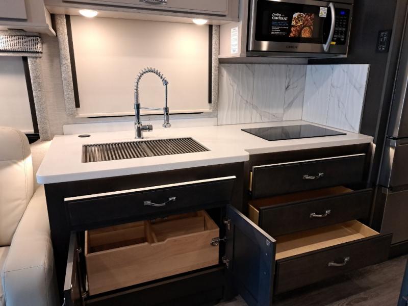 Dream of the places you'll go and sights you'll see in this spacious coach for six! There is a full-wall slide, plus two additional slides for maximum space and comfort. The little ones or your guests will love sleeping on the drop-down overhead bunk, while you take the king bed slide out in the rear private bedroom. There is also a large bedroom closet, a dresser, and your own 32" LED Smart TV here to watch a late-night show in bed. You will love to relax in the main living area on the reclining theater seating across from the 50" LED Smart TV, or you can all play a game at the 92" Dream Dinette slide. When everyone gets hungry, the chef of your group can whip up a hearty meals with the two burner electric induction cooktop or use the stainless steel over-the-range convection microwave, and there is a 15.7 cu. ft. French door residential refrigerator here for perishables!