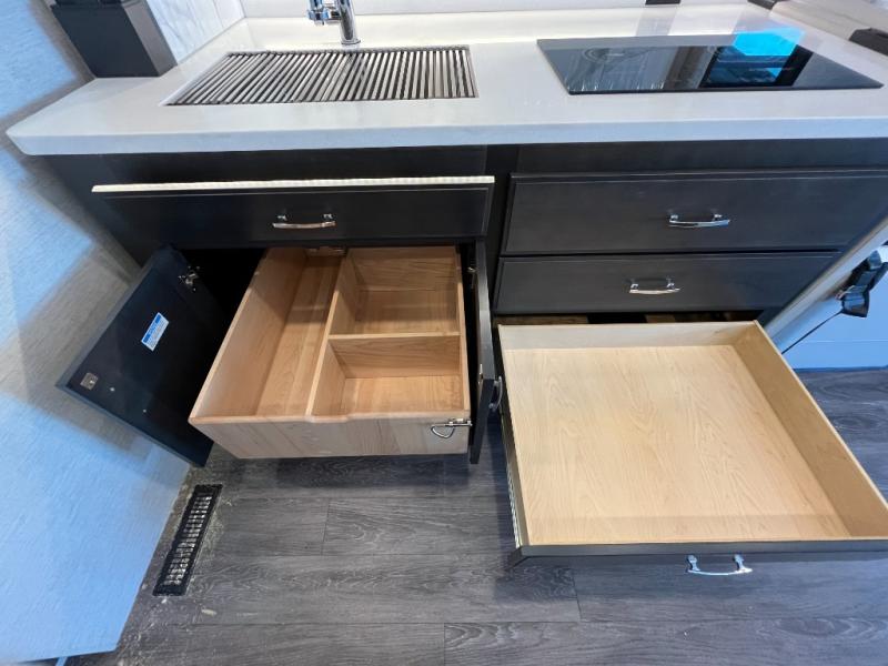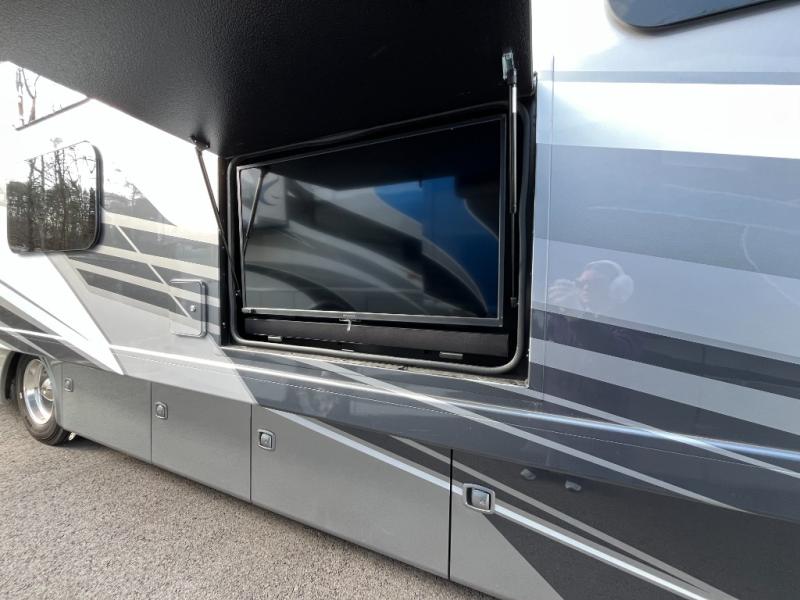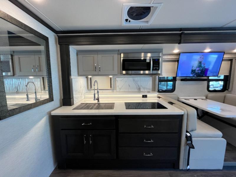 Premium Seating • Large Entertainment Center • Solid-Surface Countertops • Power Awning • Exterior Storage • Residential-Style Amenities