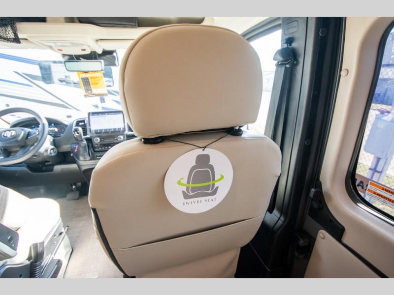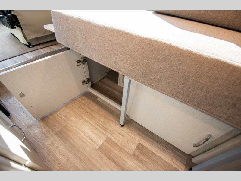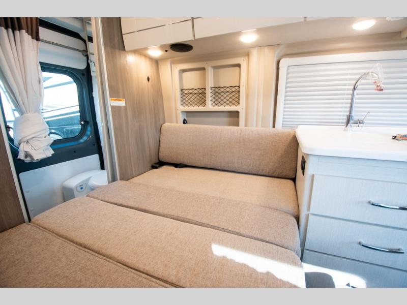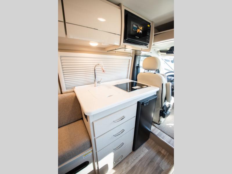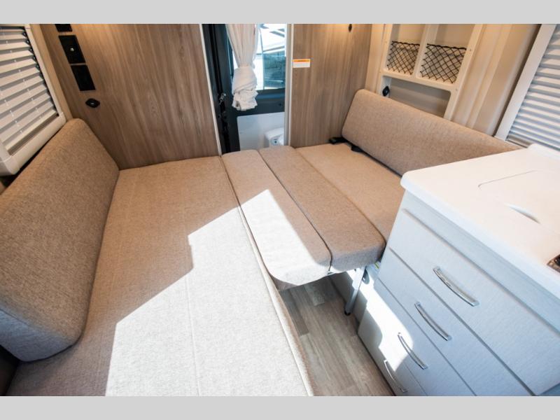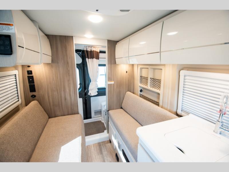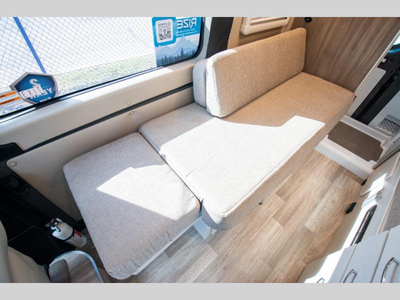 Travel easily in this Rize 18G motorhome. When you are ready to get off the road for a few hours or several days you will have plenty of comforts to enjoy before you head to your next location. The expanding sleeper sofa offers plenty of seating during the day and additional seating can be found opposite with each seating area offering one set of seat belts for two rear travelers. Create meals on the go with a two-burner gas cooktop and microwave oven, you can dine while seated in one of the captain's chairs that swivel, or from the seating in back. Create a 44" x 70" sleeping space at night with the expanding sofa along the curbside. The large opening window above the sink and stove will provide plenty of fresh air throughout, and the wet bath in back is a convenience that you just can't beat while on the road or in camp!