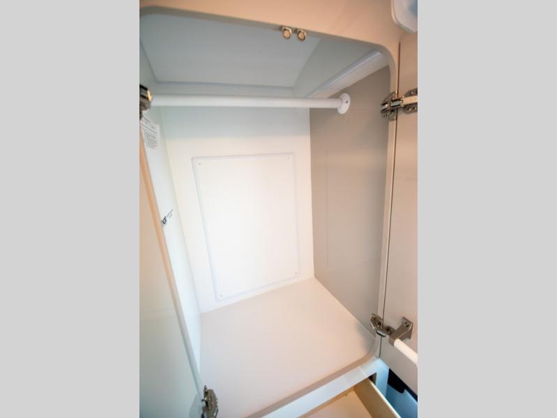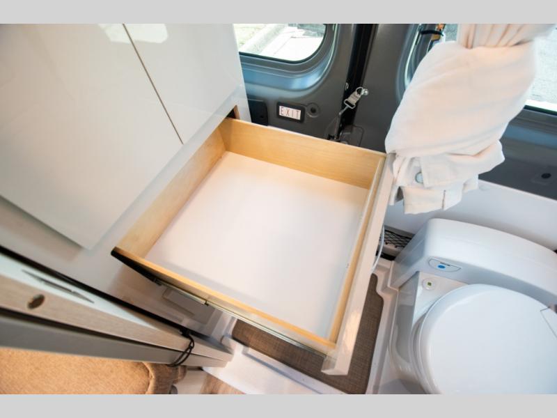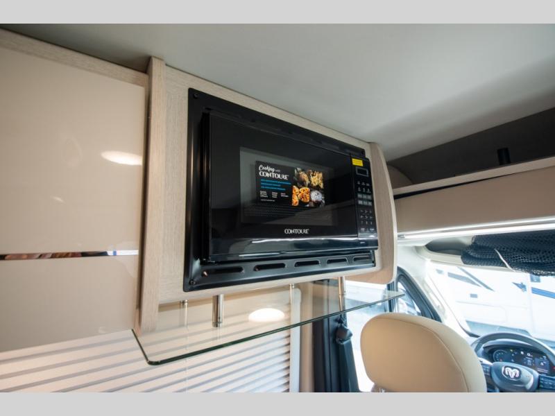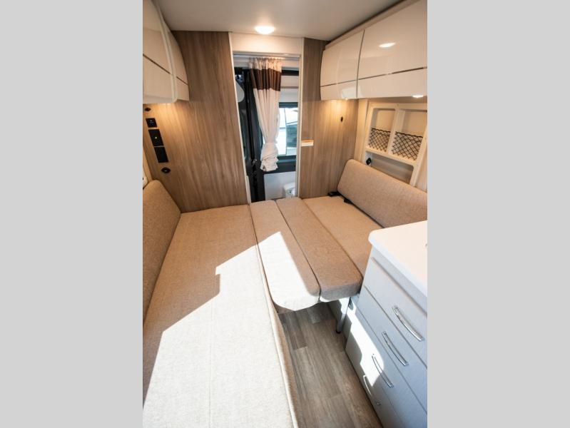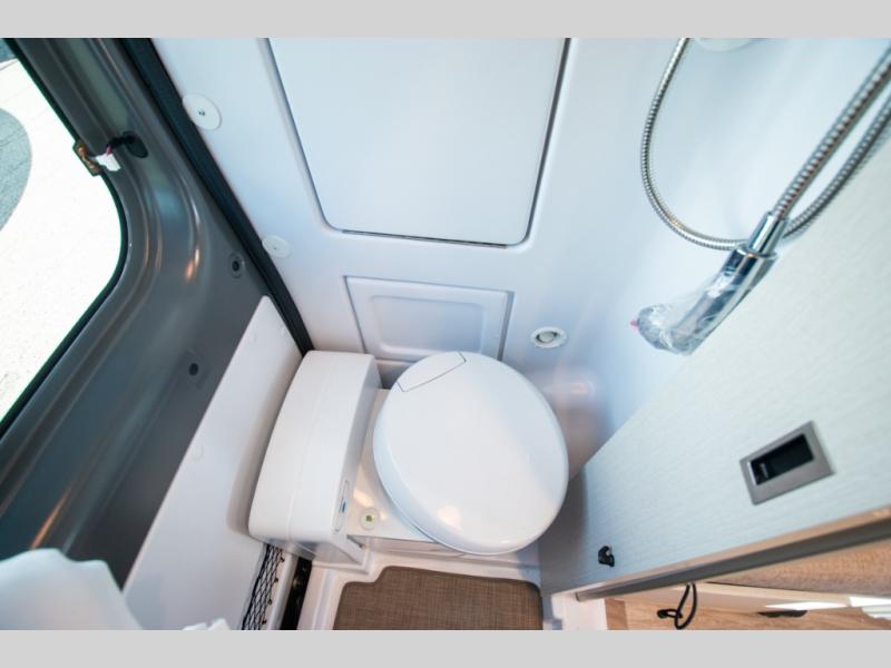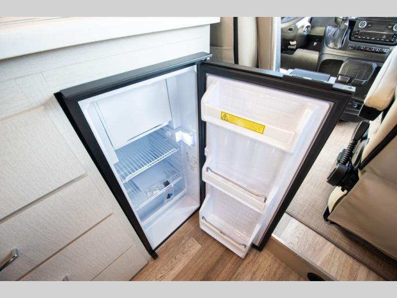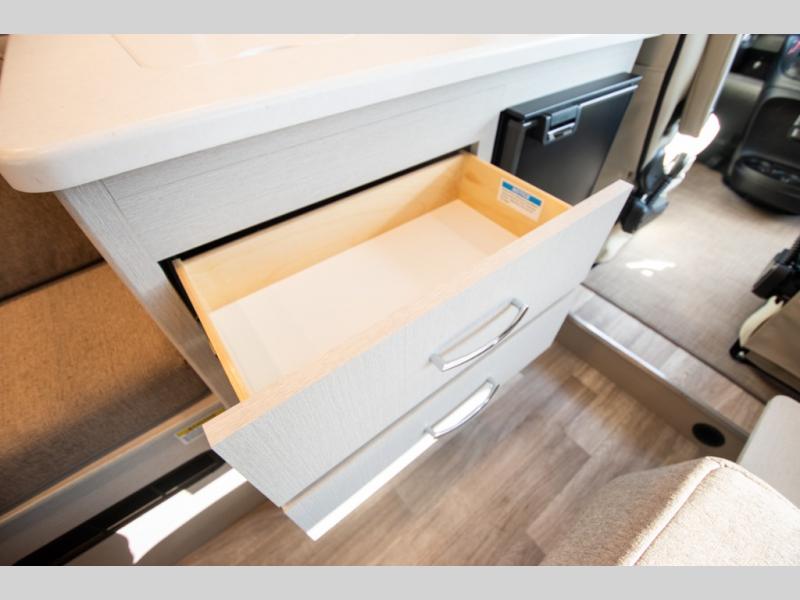 Travel easily in this Rize 18G motorhome. When you are ready to get off the road for a few hours or several days you will have plenty of comforts to enjoy before you head to your next location. The expanding sleeper sofa offers plenty of seating during the day and additional seating can be found opposite with each seating area offering one set of seat belts for two rear travelers. Create meals on the go with a two-burner gas cooktop and microwave oven, you can dine while seated in one of the captain's chairs that swivel, or from the seating in back. Create a 44" x 70" sleeping space at night with the expanding sofa along the curbside. The large opening window above the sink and stove will provide plenty of fresh air throughout, and the wet bath in back is a convenience that you just can't beat while on the road or in camp!