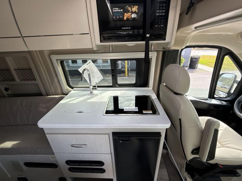 Travel easily in this Rize 18G motorhome. When you are ready to get off the road for a few hours or several days you will have plenty of comforts to enjoy before you head to your next location. The expanding sleeper sofa offers plenty of seating during the day and additional seating can be found opposite with each seating area offering one set of seat belts for two rear travelers. Create meals on the go with a two-burner gas cooktop and microwave oven, you can dine while seated in one of the captain's chairs that swivel, or from the seating in back. Create a 44" x 70" sleeping space at night with the expanding sofa along the curbside. The large opening window above the sink and stove will provide plenty of fresh air throughout, and the wet bath in back is a convenience that you just can't beat while on the road or in camp!
