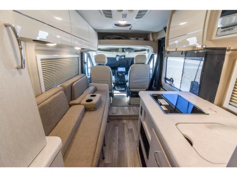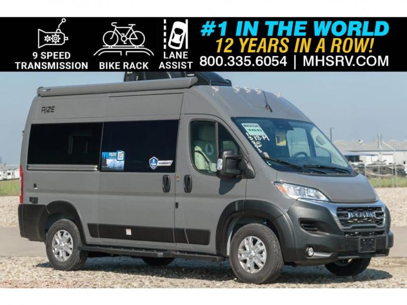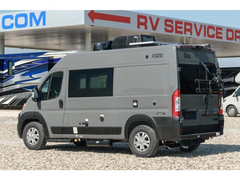The Rize Class B gas motorhome by Thor Motor Coach allows you to experience the camping lifestyle in a compact RV packed with convenient features. There is a 3.6L Pentastar V6 engine and 276 HP to power your excursions, and the outdoor enthusiast will love the 190W solar panel and solar charge controller. Each model includes residential vinyl flooring, TechnoForm Euro-style upper cabinet doors, and premium window privacy shades. You'll find pressed countertops in the kitchen and a glass protective cover and task lighting above the cooktop to easily cook meals each day. The keyless entry system adds to the convenience found throughout these models, plus there is an exterior LP connection if you want to hook up your own grill and a rear water sprayer to wash off your hiking boots.
