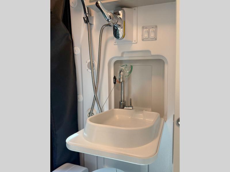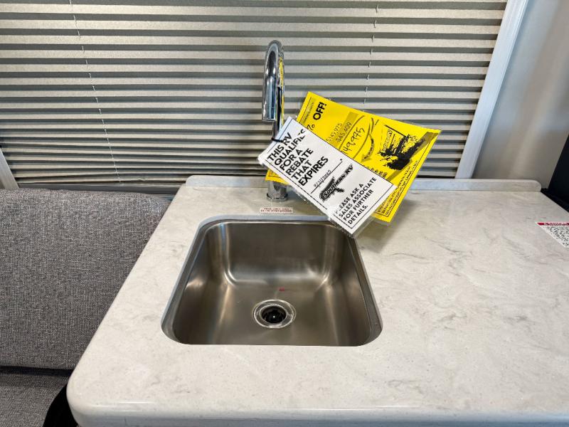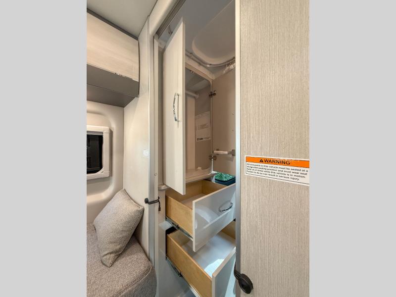 The perfect traveling companion for two who enjoy life on the road. The captain's chairs up front swivel to provide more seating in back, plus you have a 70" x 70" expandable sleeper sofa with a removable table nearby. The single burner induction cooktop allows you to make meals easily when stopped, and there is also a sink for cleaning up and refrigerator as well. You will find a flip-down TV in the living area located in front that can be viewed from anywhere in back! A wet bath in the very back allows all travelers to stay clean and fresh during the trip, and there is a wardrobe plus drawers to keep your clothing and personal items neat and tidy while you travel.