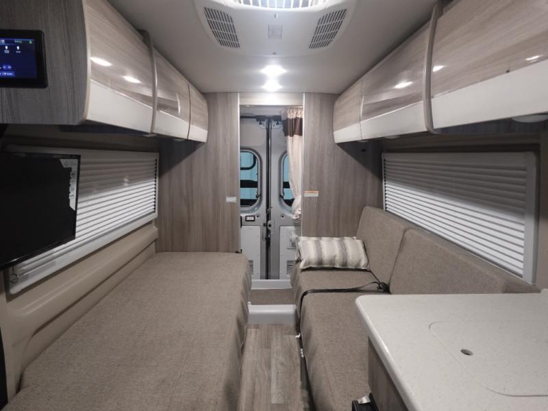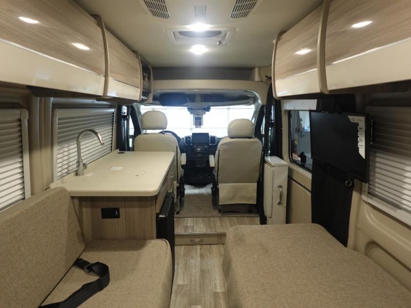 Travel the country with your favorite person in this motorhome! You can freshen up after a long day of traveling in the rear enclosed wet bath with a power vent fan to eliminate unwanted steam and a wardrobe with drawers to store your clothes and towels. Enjoy a good night's rest on the 74" x 80" expanding sleeper sofa once converted, and there is a removable table in between to dine at. The kitchen not only has a single burner induction cooktop, single door 12V refrigerator, and convection microwave, but also a flip-up countertop for more space. There are even large opening side windows to let in some fresh air and natural lighting!