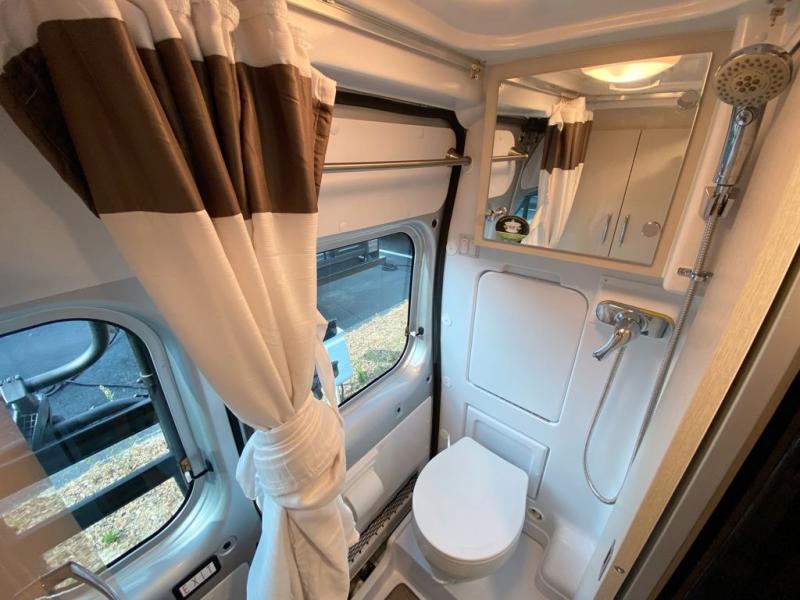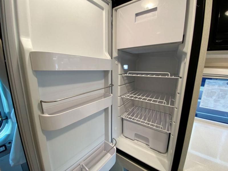 Hit the open road in this coach that can sleep two to three each night. You will love relaxing on the expanding sleeper sofa with a portable table, plus there is a pull-out bench that converts to a 60" x 51" sleeping space for an extra guest. A single burner induction cooktop and microwave oven lets you cook meals each day, and the single door 12V refrigerator will be perfect for cold items. You'll find the rear wet bath convenient to freshen up before bed, plus there is a wardrobe and drawers here for clean towels and toiletries!