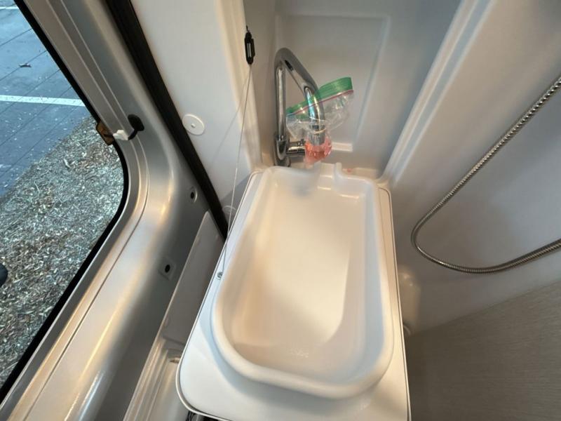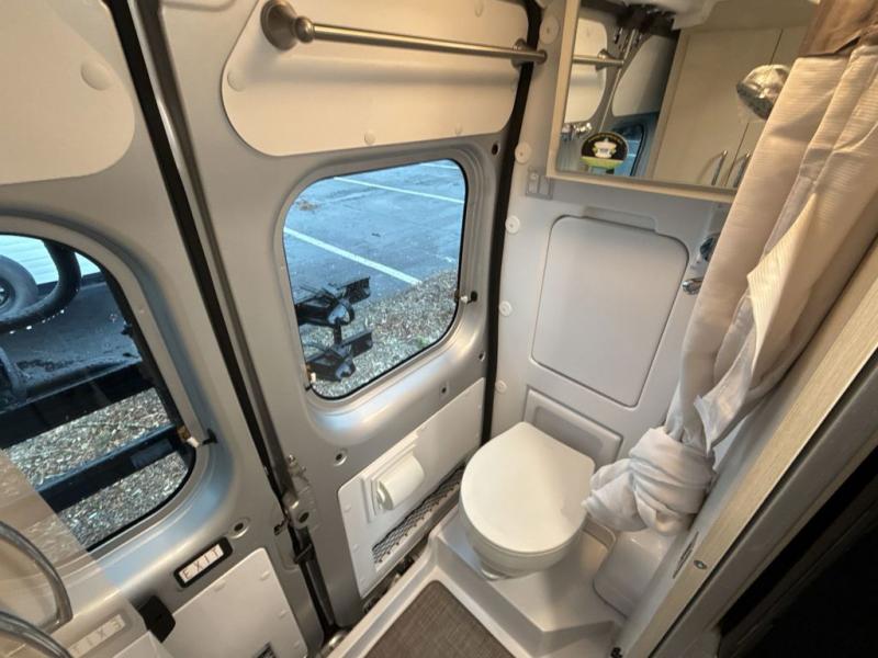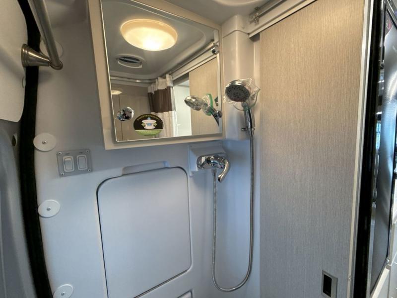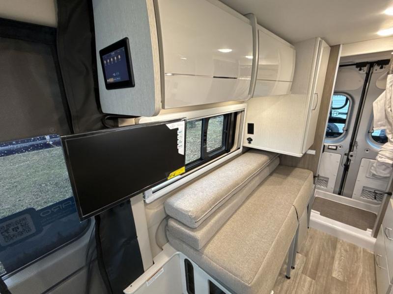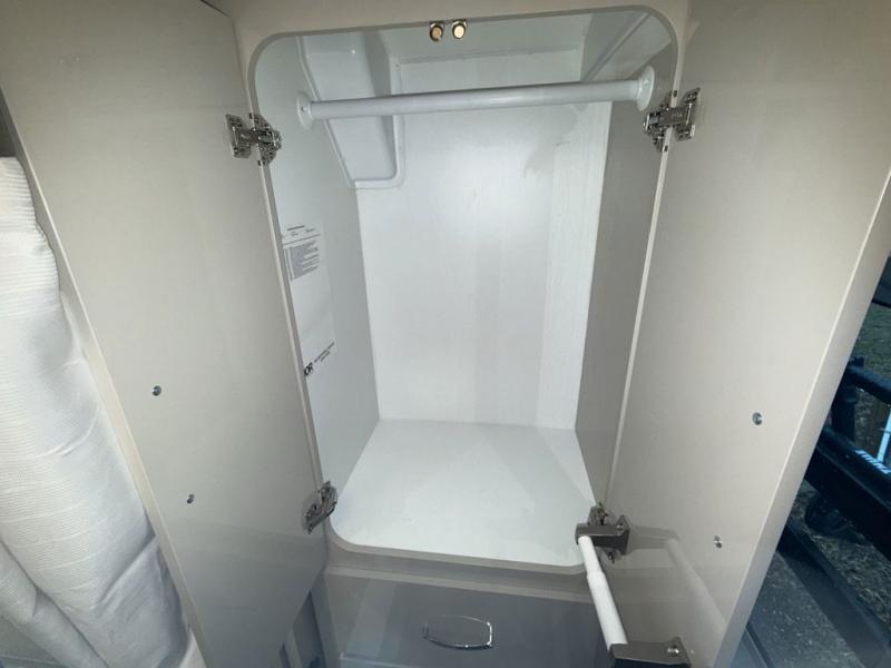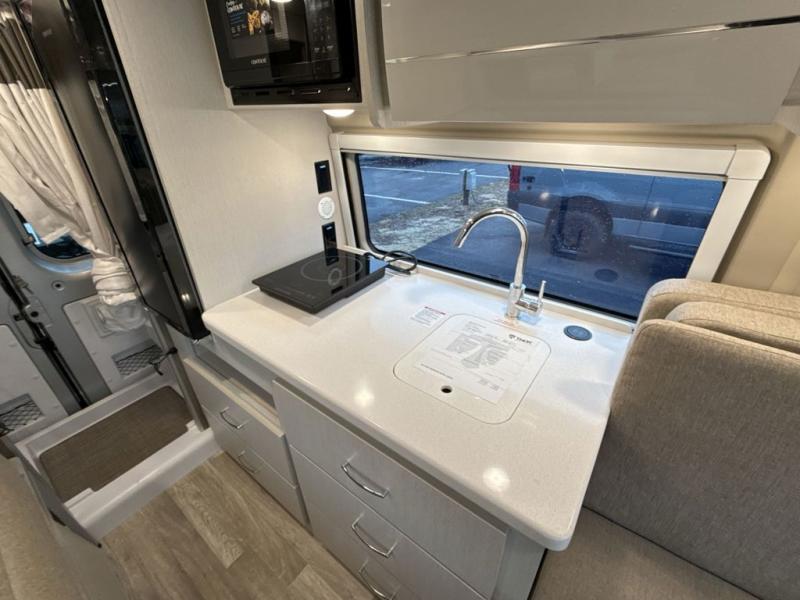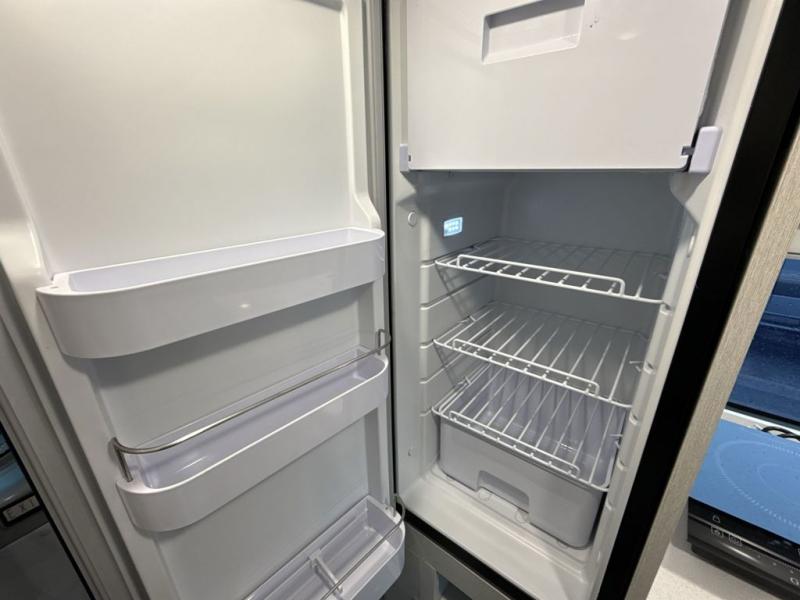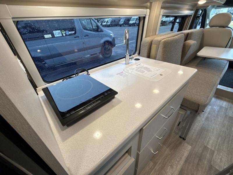 Hit the open road in this coach that can sleep two to three each night. You will love relaxing on the expanding sleeper sofa with a portable table, plus there is a pull-out bench that converts to a 60" x 51" sleeping space for an extra guest. A single burner induction cooktop and microwave oven lets you cook meals each day, and the single door 12V refrigerator will be perfect for cold items. You'll find the rear wet bath convenient to freshen up before bed, plus there is a wardrobe and drawers here for clean towels and toiletries!