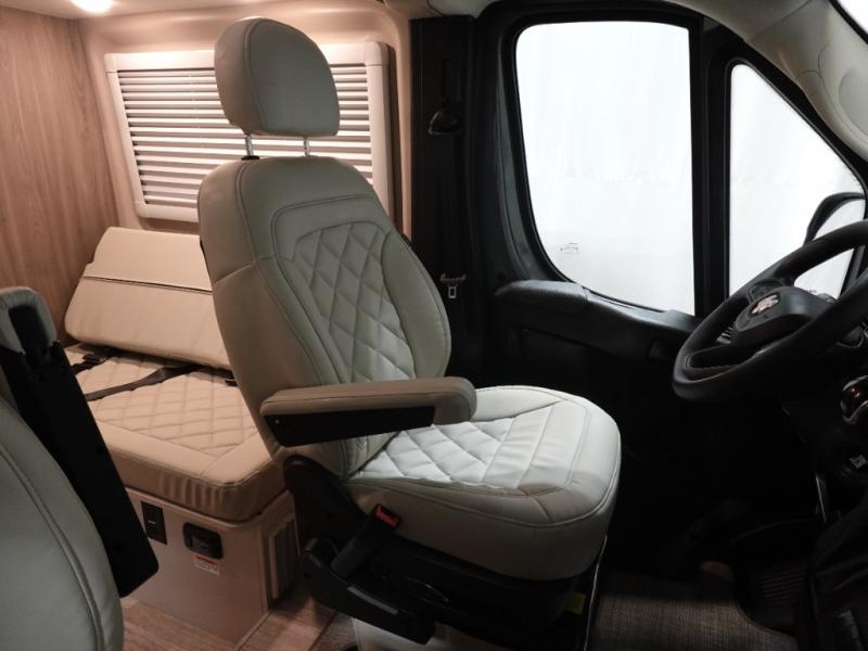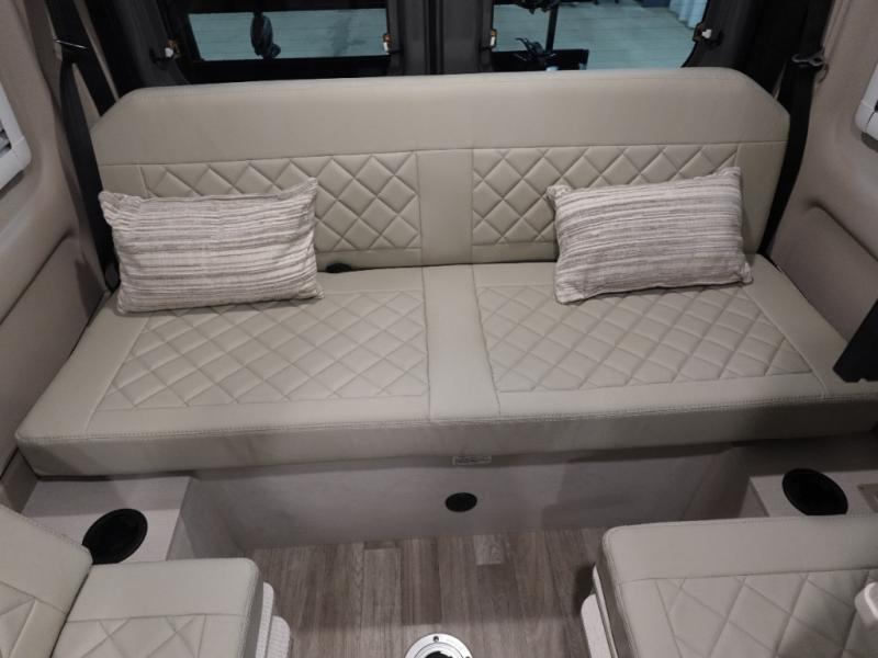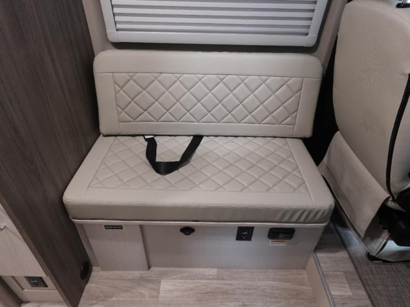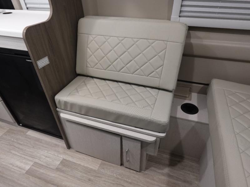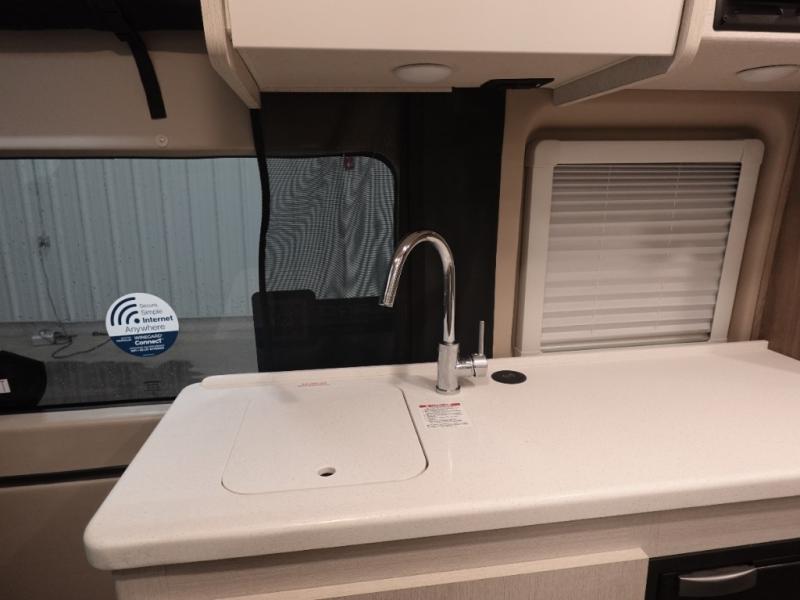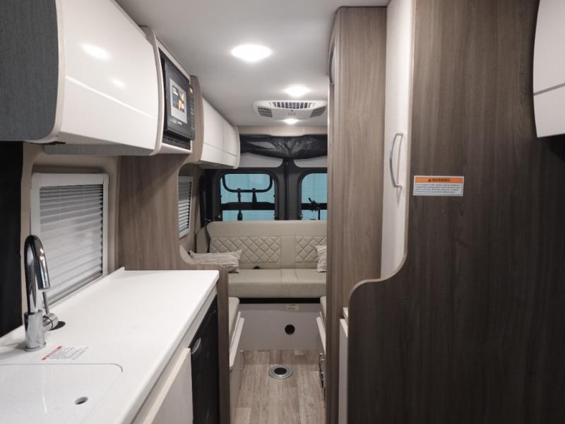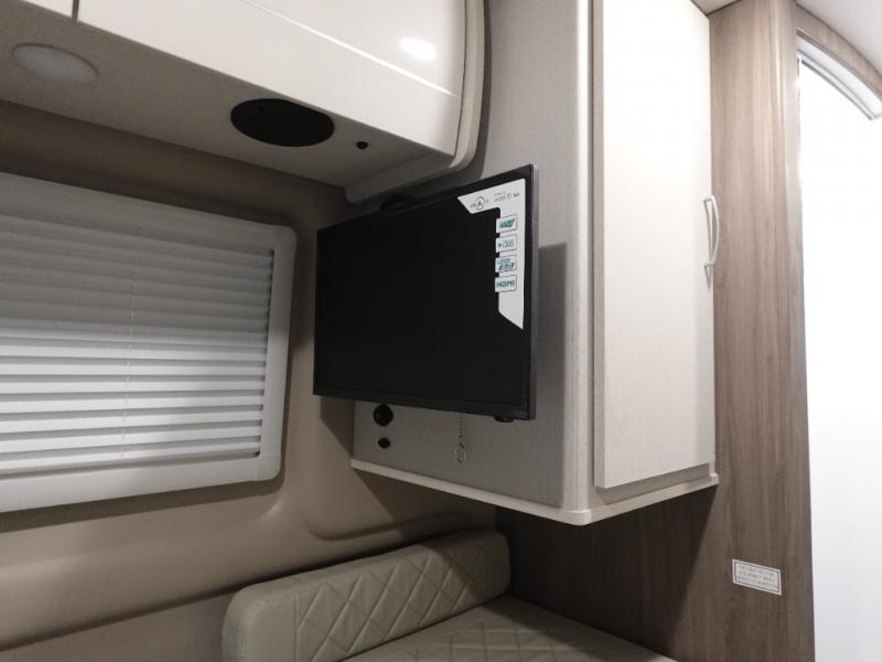 You'll want to take this Tellaro Class B gas motorhome out on the road as your permanent home when you see the comfort it provides! There is a removable table on a swing arm in front of a seating area, so you have a place to work each day. This area can also be used for dining later on in the day. The large skylight in the living area provides you with sunshine while you work, and the fully enclosed wet bathroom has a cassette toilet for easy disposal of waste. The manual rear sofa bed system is where you will spend your nights sleeping like a baby, and you even have a 24" Smart TV back here by the sofa to watch while you're lounging or resting for the night.