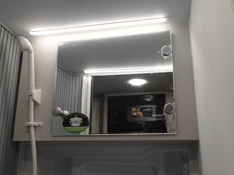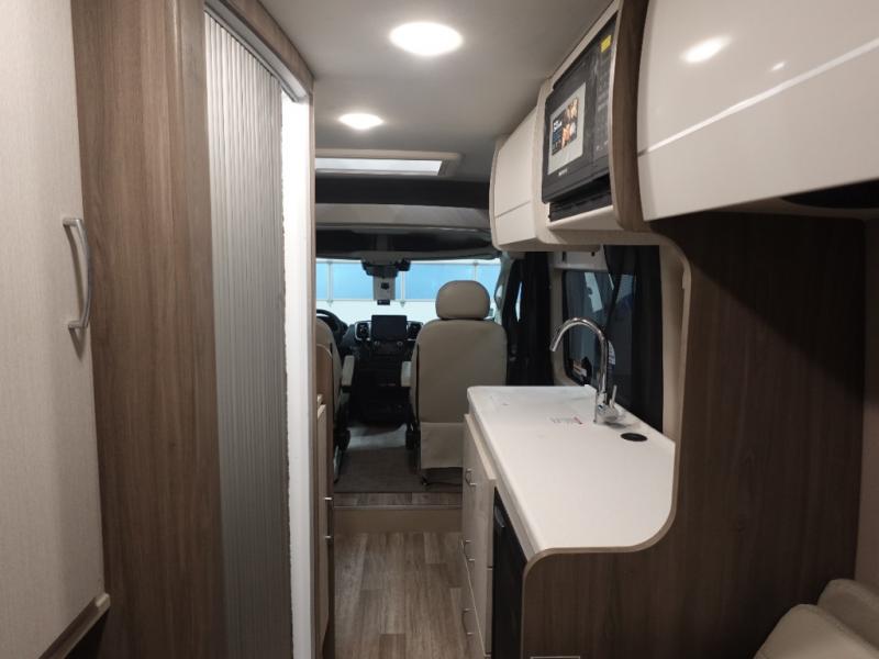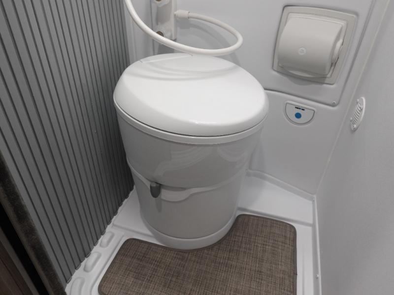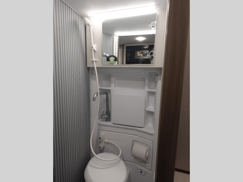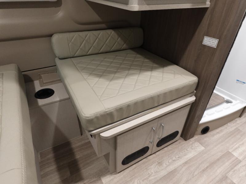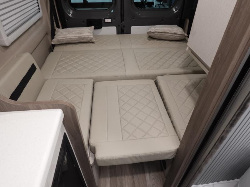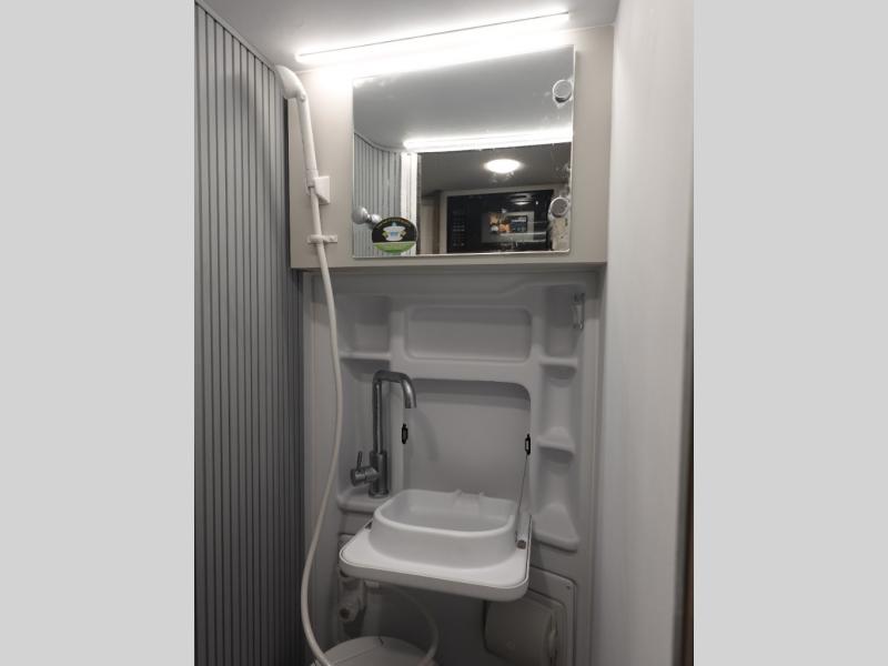 You'll want to take this Tellaro Class B gas motorhome out on the road as your permanent home when you see the comfort it provides! There is a removable table on a swing arm in front of a seating area, so you have a place to work each day. This area can also be used for dining later on in the day. The large skylight in the living area provides you with sunshine while you work, and the fully enclosed wet bathroom has a cassette toilet for easy disposal of waste. The manual rear sofa bed system is where you will spend your nights sleeping like a baby, and you even have a 24" Smart TV back here by the sofa to watch while you're lounging or resting for the night.