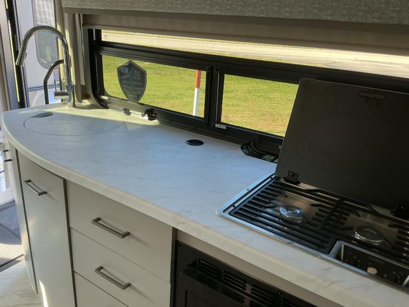 This Tiburon Sprinter Class C diesel motorhome has everything you need to vacation comfortably! During the day you will find a 67" sofa and 70" Dream Dinette with footrests to relax on, but once night falls, you can transition the sofa into a 60" x 74" Murphy bed which you can use to sleep soundly. When you wake up, it will be easy to head over to the kitchen to prepare something to eat. You can use the two-burner gas cooktop and the convection microwave oven with an air fryer to prepare a hot meal, or you can just grab some cereal from the pantry and some milk from the refrigerator for a fast breakfast.