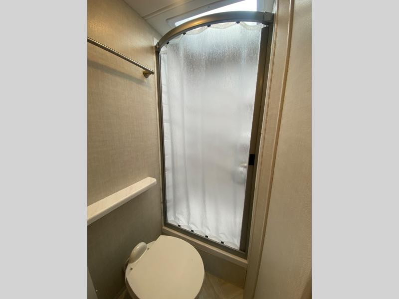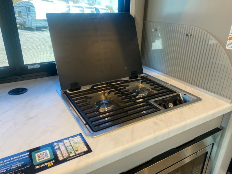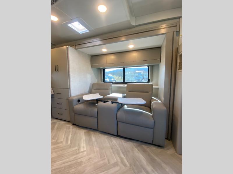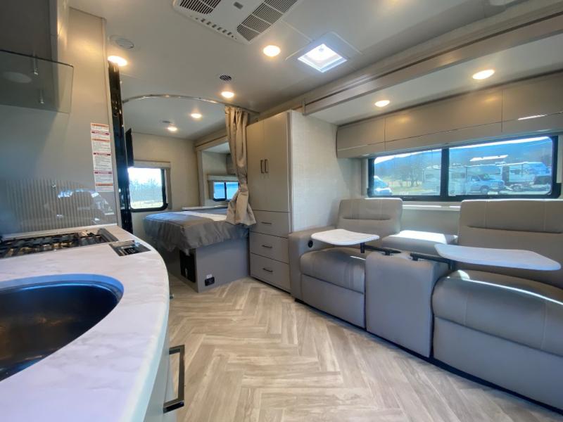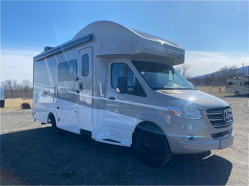 You can turn dreary days into exciting adventures simply by adding this Tiburon Sprinter Class C diesel motorhome to the mix! There is lots of convenience in the kitchen. You'll find a refrigerator, pressed laminate countertops with an under-mounted sink that has a sink cover, a two-burner gas cooktop with a glass cover, a convection microwave with an air fryer, and a large stainless steel single-bowl sink and faucet with pull-down sprayer. The bathroom is also accommodating, and it features a skylight above the 24" x 32" shower, a foot-flush toilet, and a curved anti-microbial shower curtain. A large closet sits in between the flip-up RV queen bed and the 76" Dream Dinette with footrests.