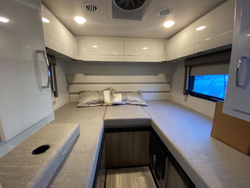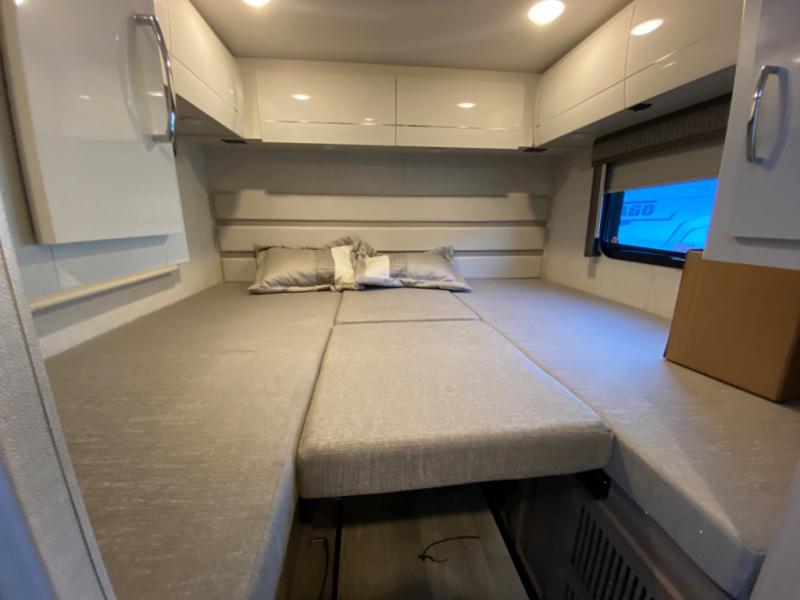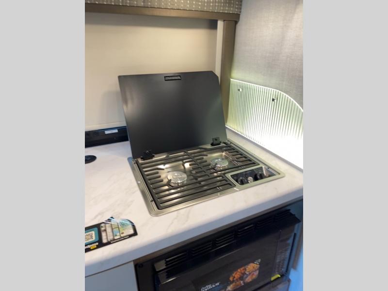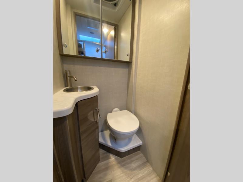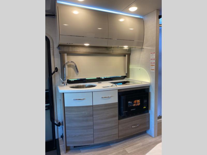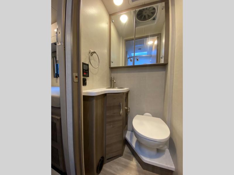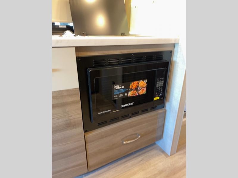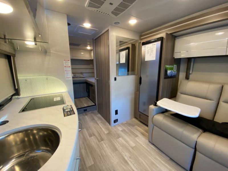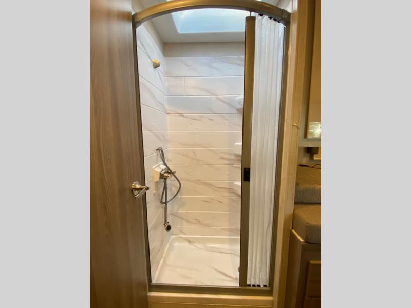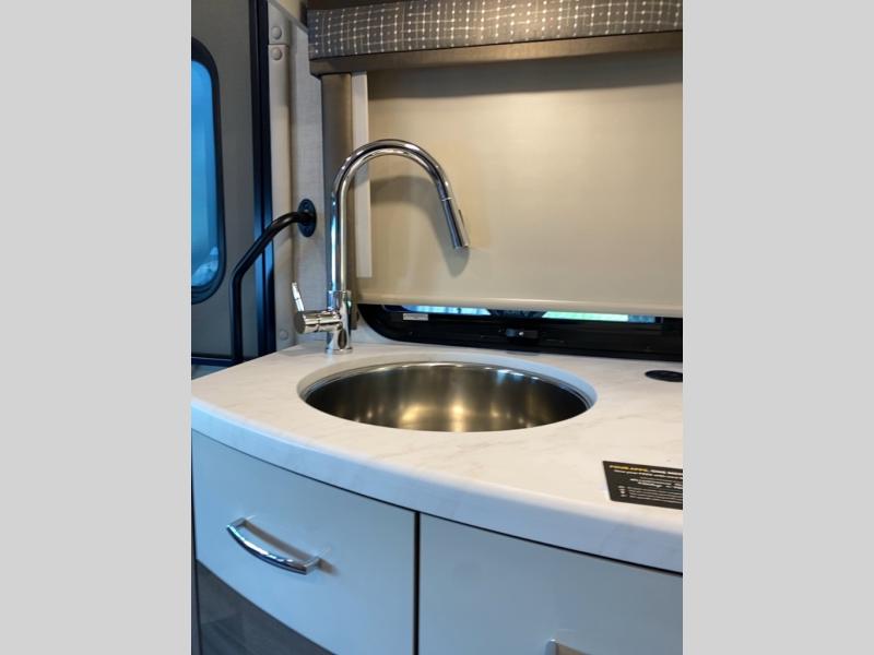 Enjoy a relaxing road trip in this motorhome! There are lots of conveniences in the kitchen. You'll find a 12V refrigerator with auto generator start, pressed laminate countertops with an under-mounted sink that has a sink cover, a two-burner gas cooktop with a glass cover and electric start, a convection microwave with an air fryer, and a large stainless steel single-bowl sink and faucet with pull-down sprayer. The separated bathroom is also accommodating, and it features a skylight above the 24" x 32" shower with curved anti-microbial shower curtain across from a private foot-flush toilet and sink. The rear 31" x 76" twin beds can convert into a king bed with closets at the foot of the beds and a privacy curtain to draw for a comfortable night's rest!