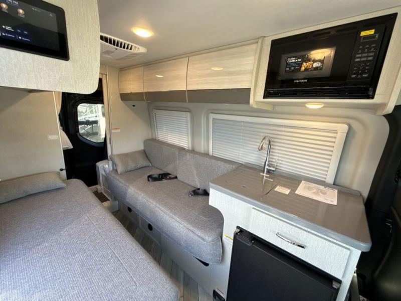 The most relaxing vacation you'll ever have is in the Thor Motor Coach Tranquility Class B diesel motorhome! These vans have a 2.0L 4-cyclinder engine to power your adventures and a 5,000 lb. trailer hitch for towing purposes. There is also a Mercedes-Benz Sprinter with a 2500 or 3500 AWD chassis depending on the model you choose. You'll be able to stay connected whenever you want with the Winegard® ConnecT 2.0 4G/Wi-Fi/digital TV antenna, and you can also use the electronics station with HDMI cable and USB charging ports to keep your devices powered. Some of the interior comforts include a solid surface countertop in the kitchen, cassette shades, and Euro-style cabinet doors. Getting off grid is easier than ever with the solar charge control with a 200W solar panel because it allows you to dry camp, and you can plan to stay off grid even longer with the Re(Li)able power pack electrical system that comes with a 460Ah lithium battery, a 3,000W pure sine inverter, and a 170 amp alternator.