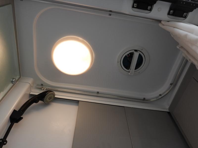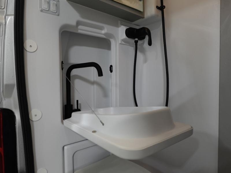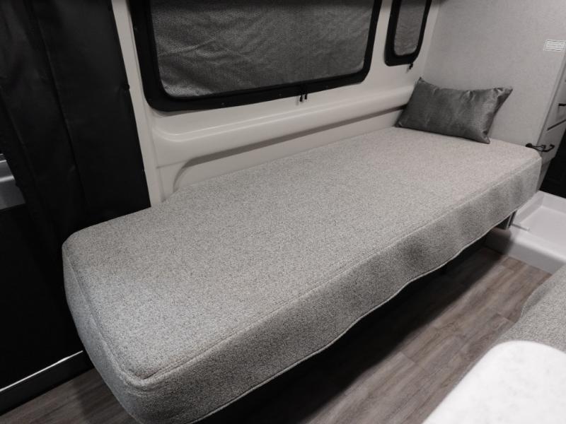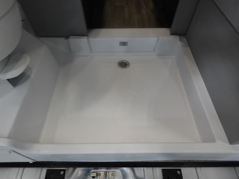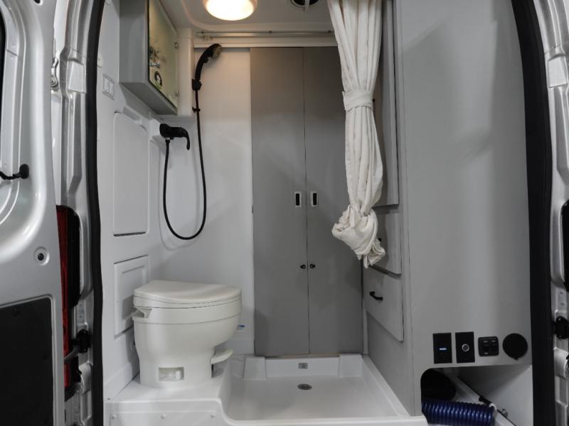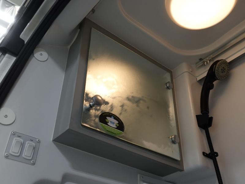 This Thor Motor Coach Twist features a wet bath located all the way to the rear so you have more living space up front. The kitchen is just behind the cockpit swivel chairs, with a single door 12V refrigerator, two burner cooktop, and steel sink. Towards the back are two twin-size beds/expanding sleeper sofa that serve as seating areas during the day, and at night they can be converted to a king-size bed. There's also a removable dining table to enjoy all your meals. The fully enclosed rear wet bath features a shower and power vent. There's also an outdoor shower to keep things extra clean.