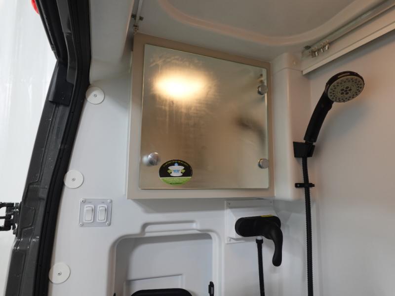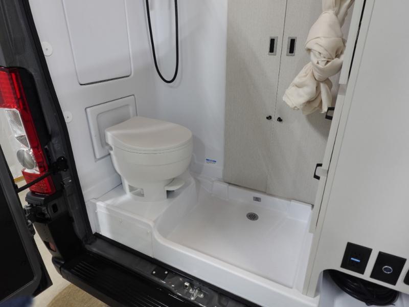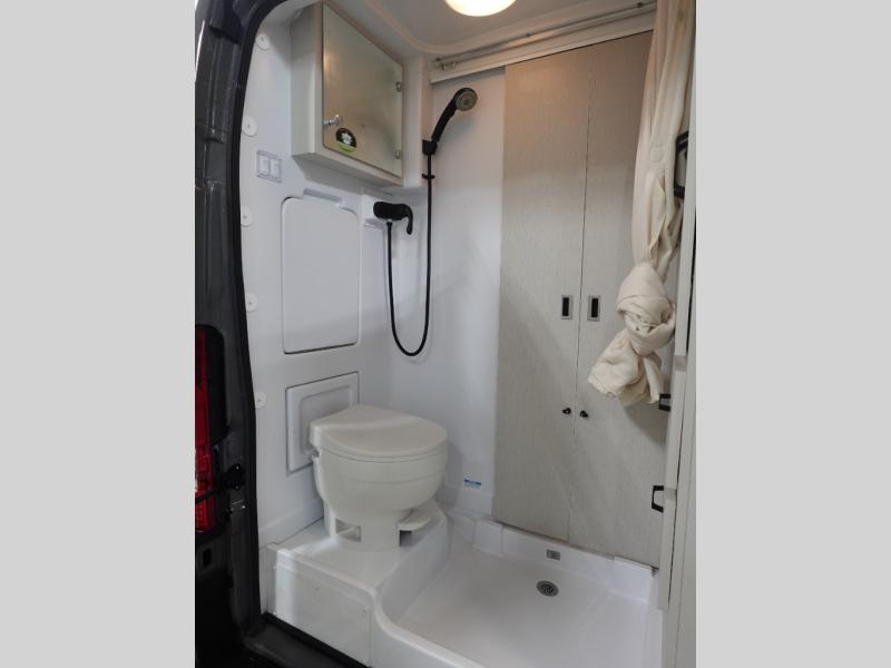 This Thor Motor Coach Twist features a wet bath located all the way to the rear so you have more living space up front. The kitchen is just behind the cockpit swivel chairs, with a single door 12V refrigerator, two burner cooktop, and steel sink. Towards the back are two twin-size beds/expanding sleeper sofa that serve as seating areas during the day, and at night they can be converted to a king-size bed. There's also a removable dining table to enjoy all your meals. The fully enclosed rear wet bath features a shower and power vent. There's also an outdoor shower to keep things extra clean.