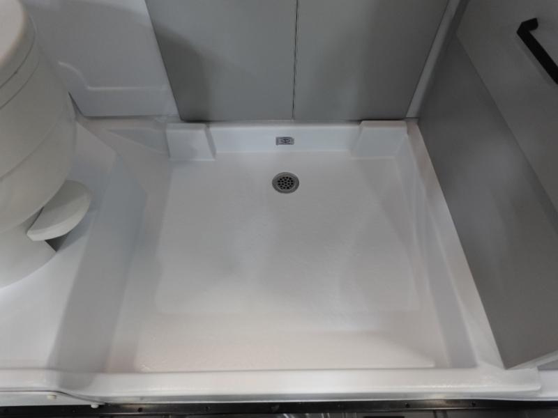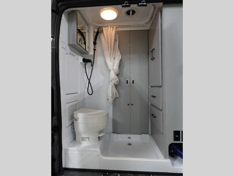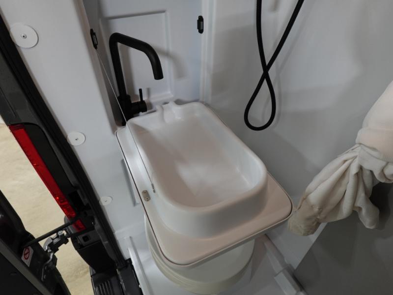This Thor Motor Coach Twist features a wet bath located all the way to the rear so you have more living space up front. The kitchen is just behind the cockpit swivel chairs, with a single door 12V refrigerator, two burner cooktop, and steel sink. Towards the back are two twin-size beds/expanding sleeper sofa that serve as seating areas during the day, and at night they can be converted to a king-size bed. There's also a removable dining table to enjoy all your meals. The fully enclosed rear wet bath features a shower and power vent. There's also an outdoor shower to keep things extra clean.