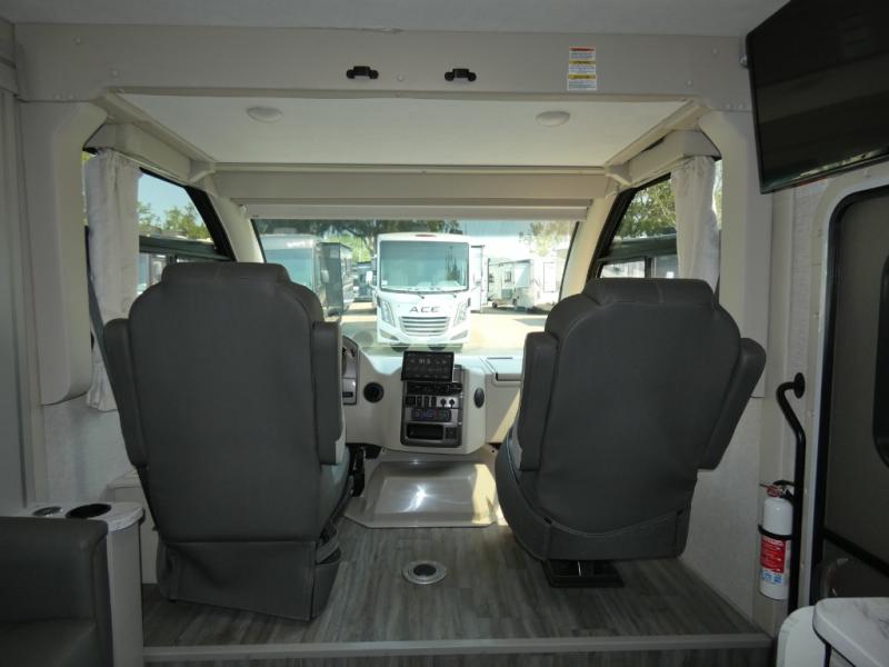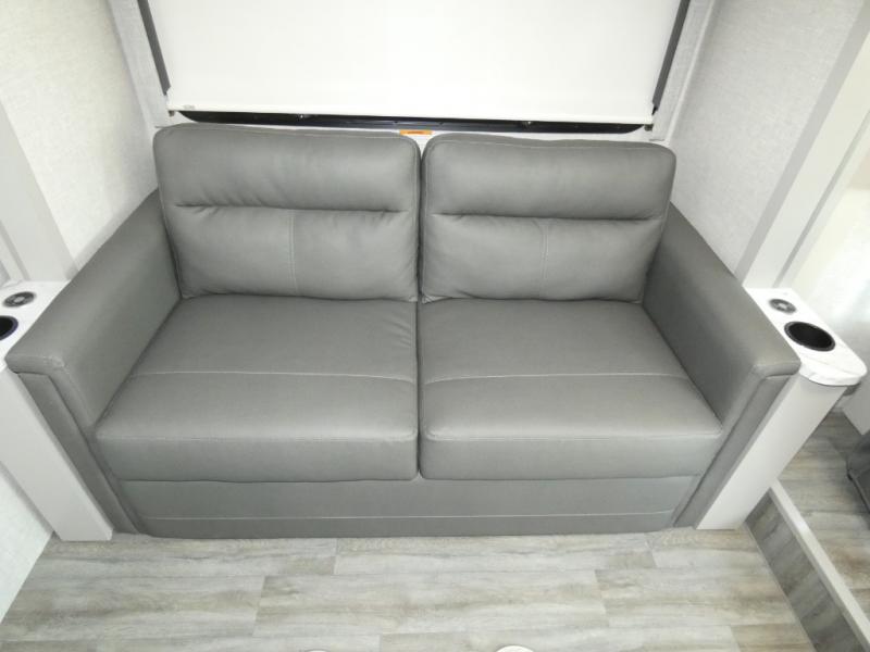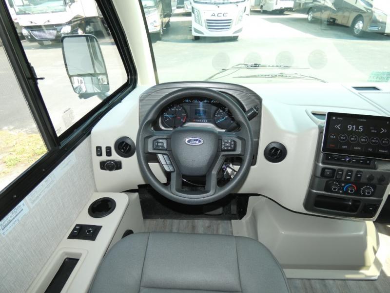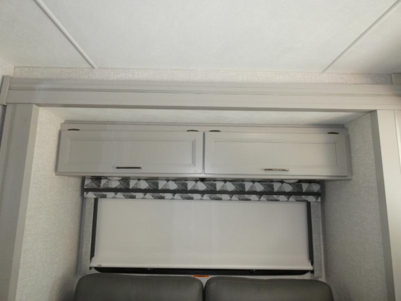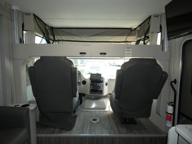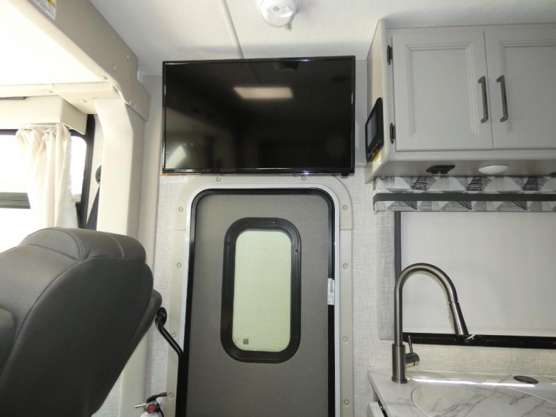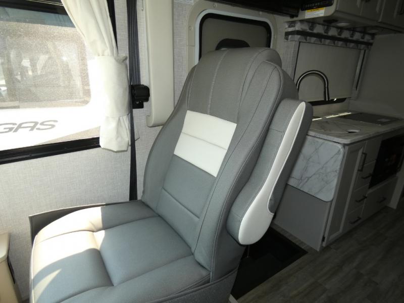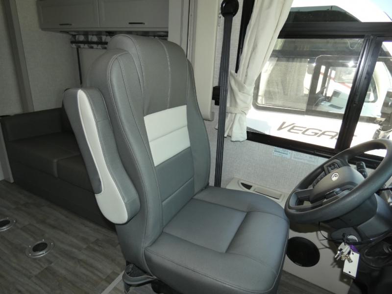 The front cab of this Vegas Class A gas motorhome is excellently appointed with a stow-away coffee table, reclining/swivel leatherette captain's chairs, and a 10" touchscreen dash radio with Bluetooth, Android Auto, and Apple CarPlay! A single slide holds the 68" sofa bed so that it isn't in your way as you walk back to the semi-private bedroom. The kitchen offers you a two burner cooktop to sauté veggies, and there are two Smart TVs to provide you with all the entertainment you could need. Within the full bath you'll find a 27" x 27" radius shower with a skylight, a stainless steel bath sink, and a 12V power bath vent to keep this space fresh.