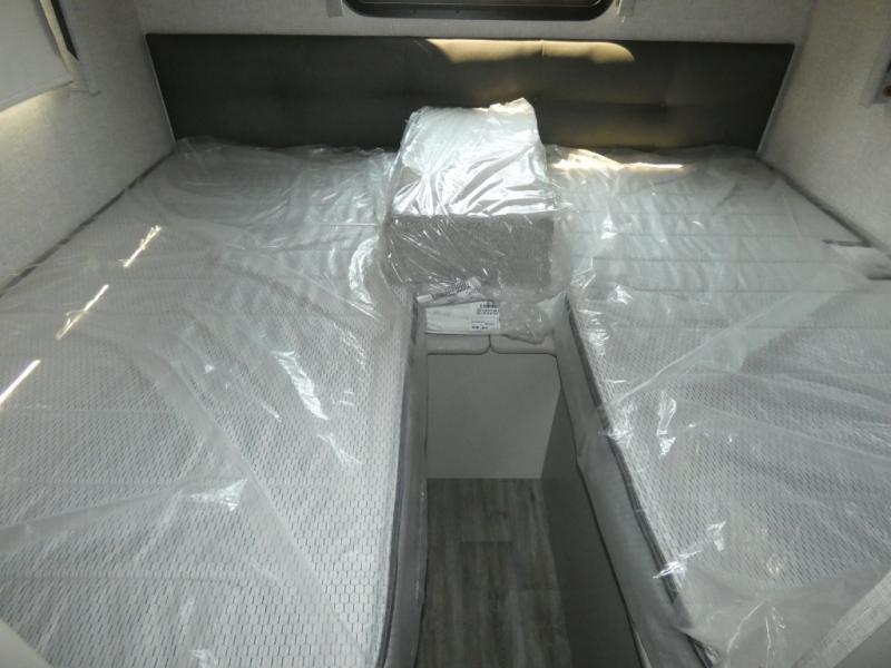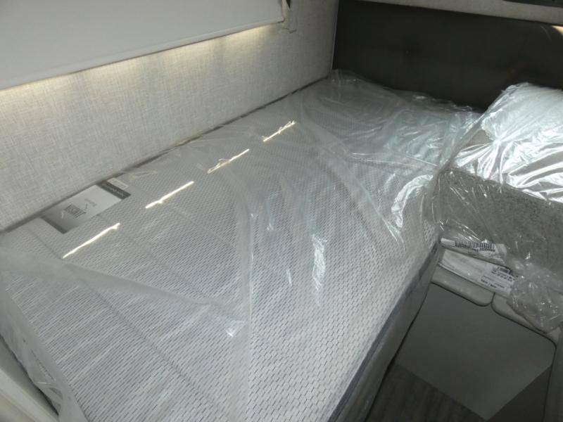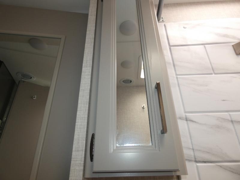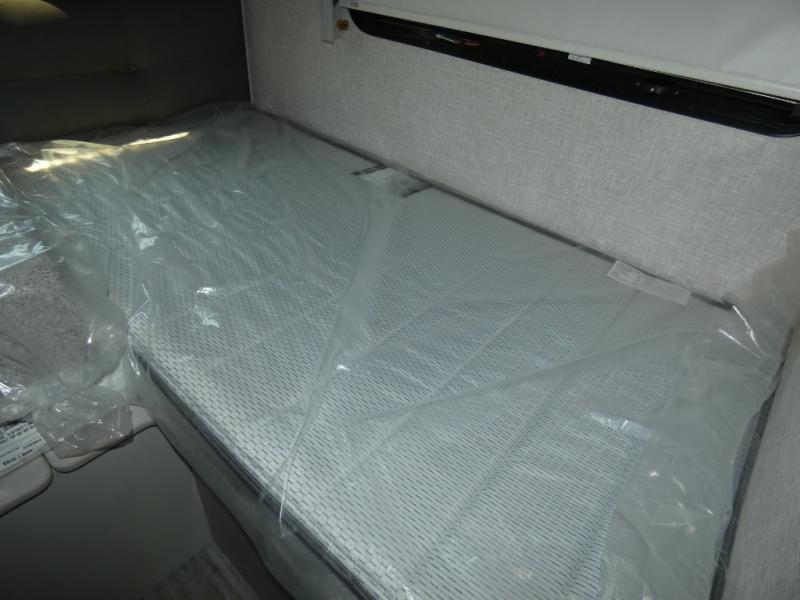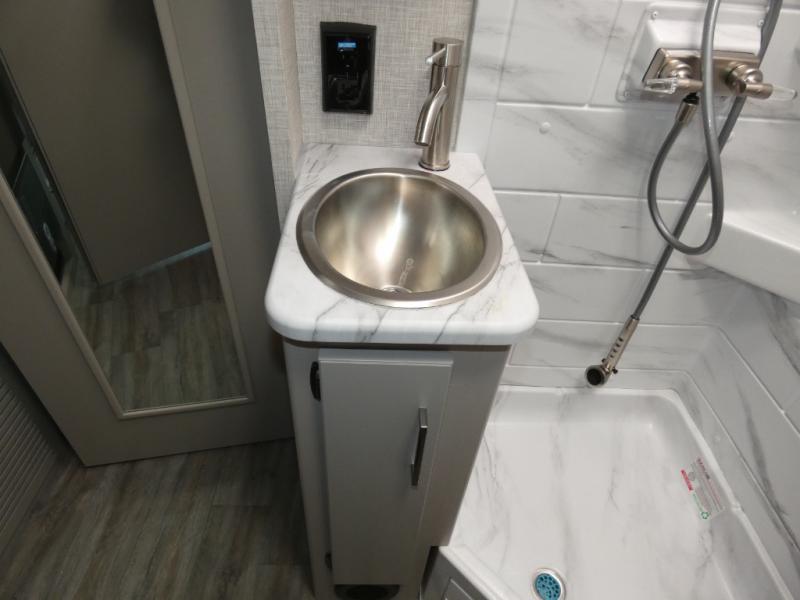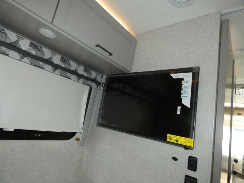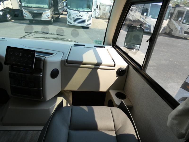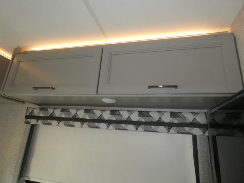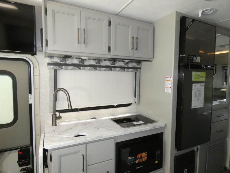The front cab of this Vegas Class A gas motorhome is excellently appointed with a stow-away coffee table, reclining/swivel leatherette captain's chairs, and a 10" touchscreen dash radio with Bluetooth, Android Auto, and Apple CarPlay! A single slide holds the 68" sofa bed so that it isn't in your way as you walk back to the semi-private bedroom. The kitchen offers you a two burner cooktop to sauté veggies, and there are two Smart TVs to provide you with all the entertainment you could need. Within the full bath you'll find a 27" x 27" radius shower with a skylight, a stainless steel bath sink, and a 12V power bath vent to keep this space fresh.