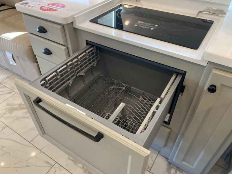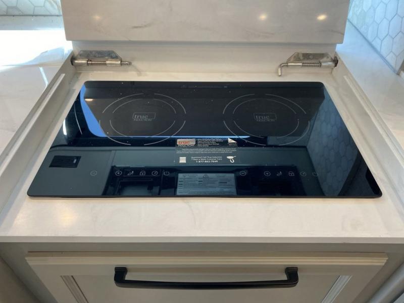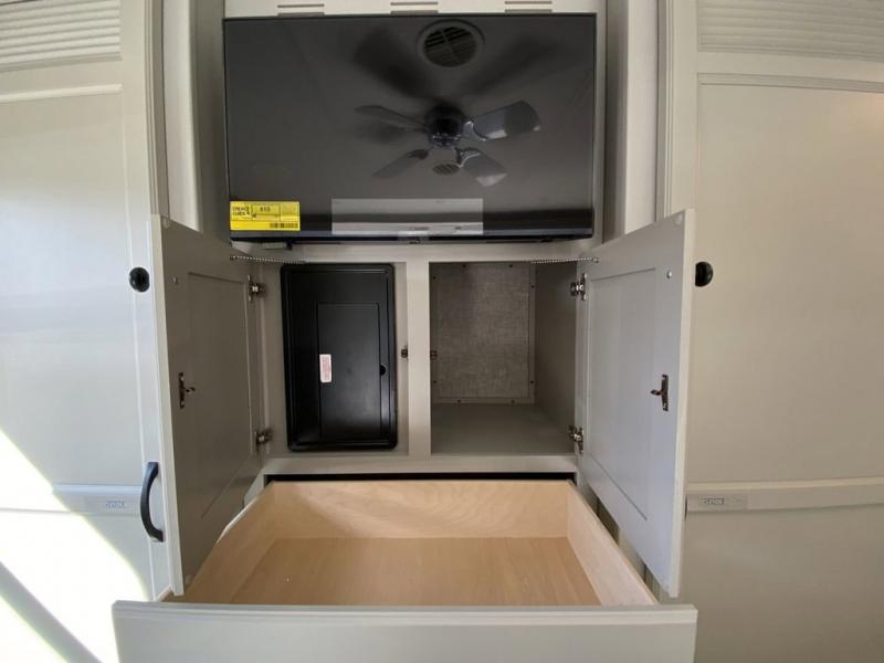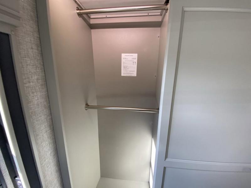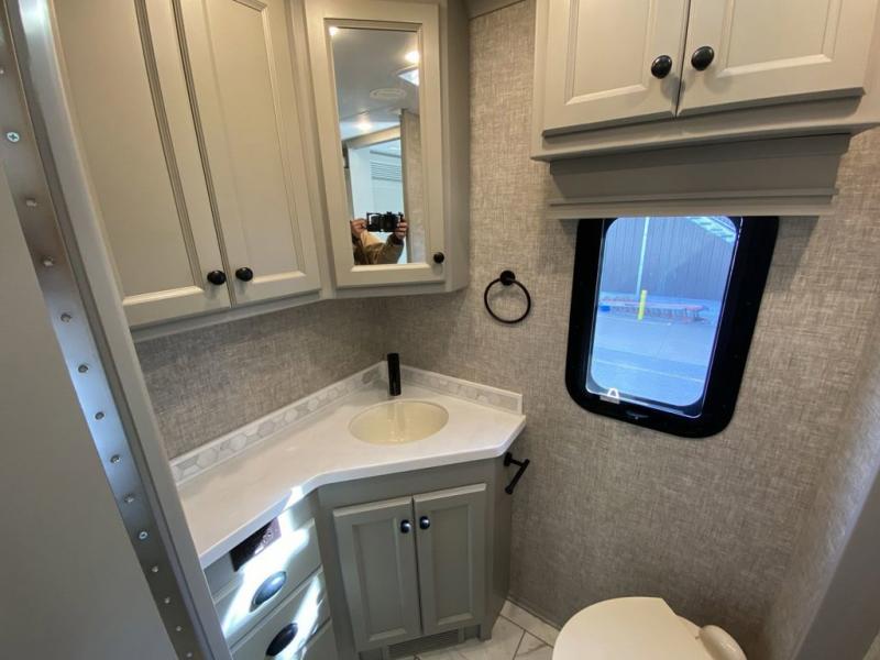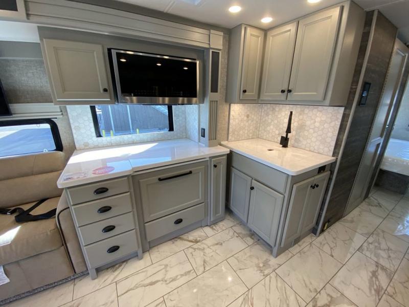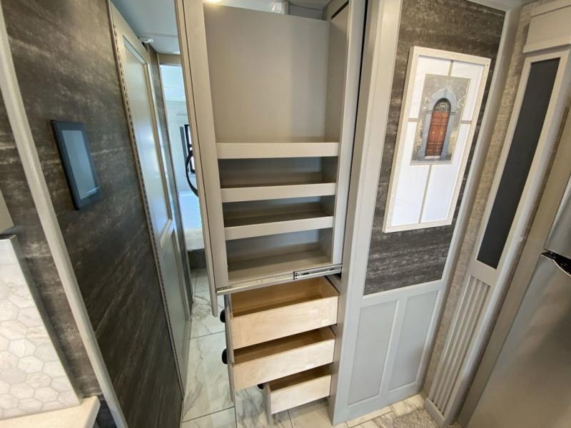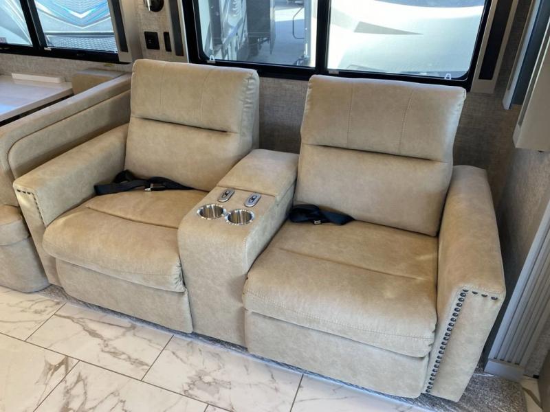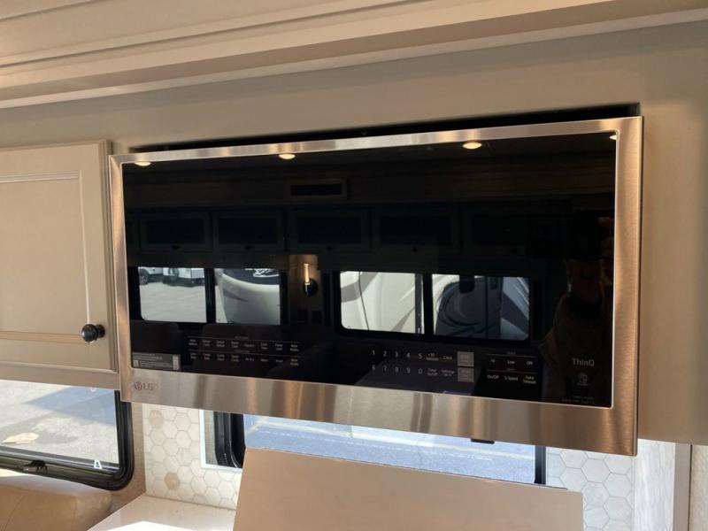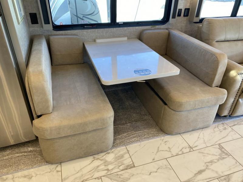Head across the country in this luxury coach for nine! The dual opposing slides in the main living area will provide you with tons of space to stretch out once you park, and you'll find seating space on the two sofa beds and the booth dinette. The chef can whip up a hearty meal on the three burner cooktop with a convection microwave with an air fryer, and the Expand-An-Island will come in handy when they need extra counter space. The private toilet and sink are right across from the shower so two people can freshen up at once, and you'll love having the rear bedroom all to yourselves. Here, you'll find a king bed slide out that can be optioned out for a queen, a large wardrobe with a bank of drawers, plus an optional washer and dryer if you choose to add. The interior is inviting, but you will also love spending time outdoors under the power awning with LED lights as well and an optional exterior TV.
