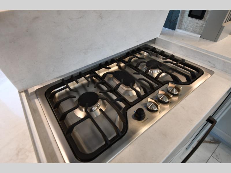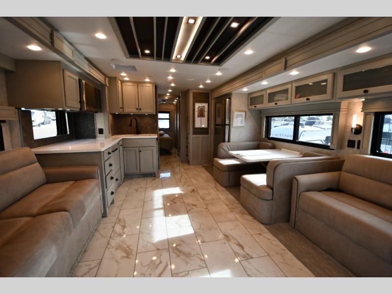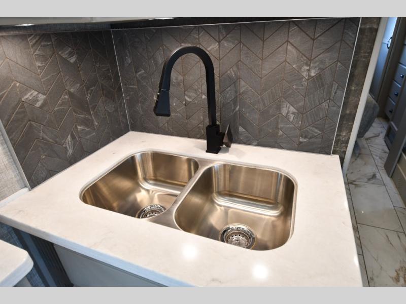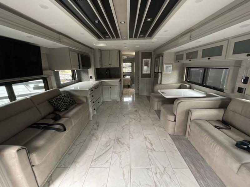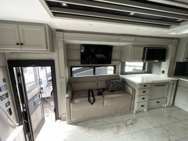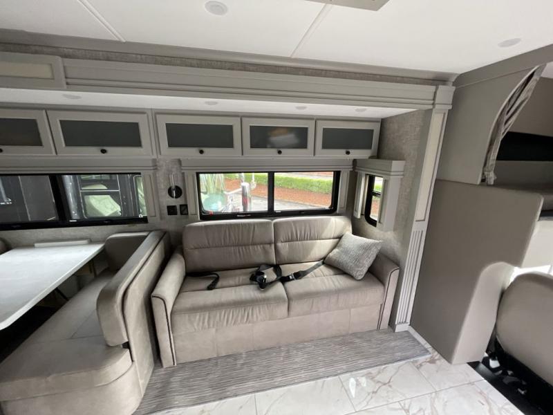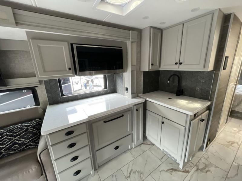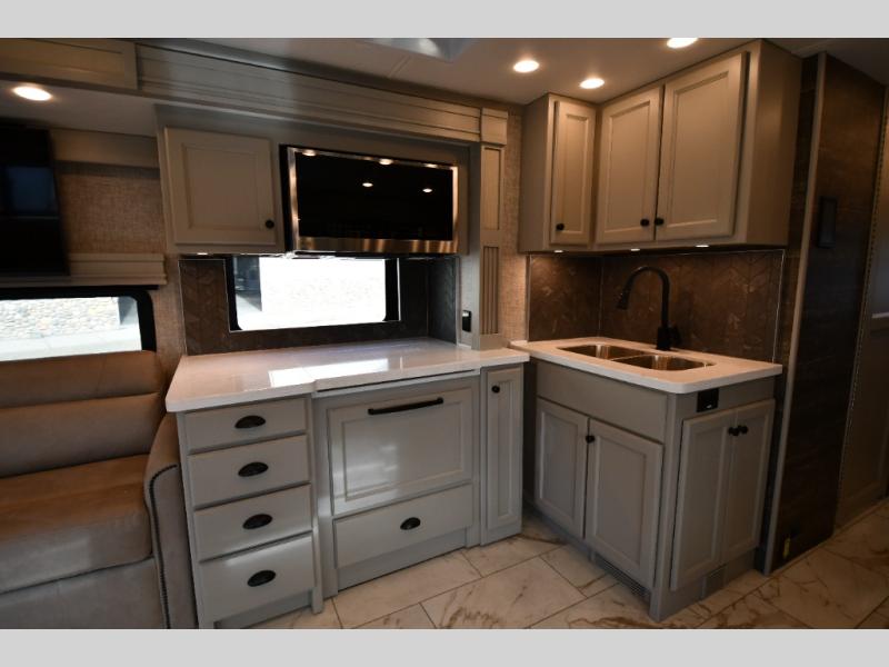 Head across the country in this luxury coach for nine! The dual opposing slides in the main living area will provide you with tons of space to stretch out once you park, and you'll find seating space on the two sofa beds and the booth dinette. The chef can whip up a hearty meal on the three burner cooktop with a convection microwave with an air fryer, and the Expand-An-Island will come in handy when they need extra counter space. The private toilet and sink are right across from the shower so two people can freshen up at once, and you'll love having the rear bedroom all to yourselves. Here, you'll find a king bed slide out that can be optioned out for a queen, a large wardrobe with a bank of drawers, plus an optional washer and dryer if you choose to add. The interior is inviting, but you will also love spending time outdoors under the power awning with LED lights as well and an optional exterior TV.
