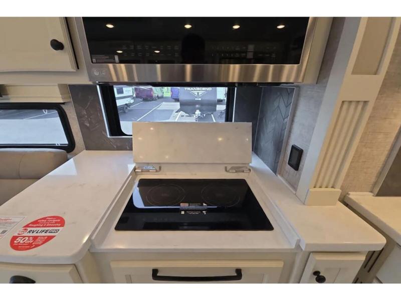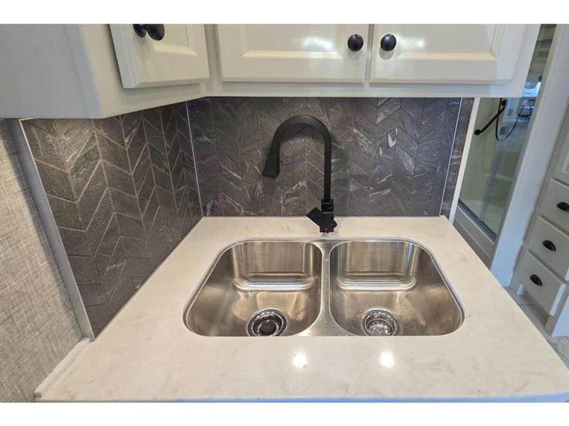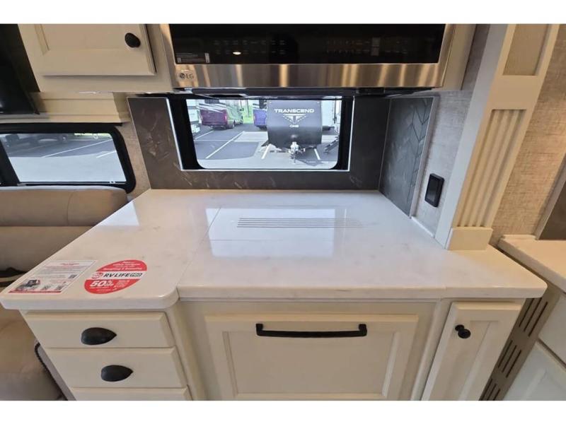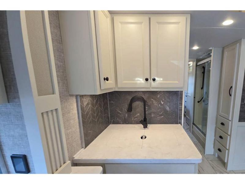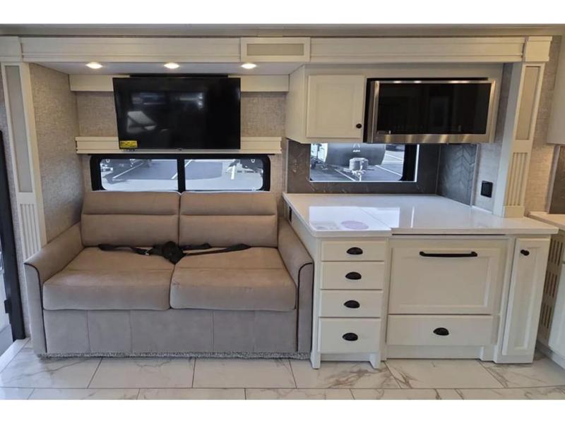 Head across the country in this luxury coach for nine! The dual opposing slides in the main living area will provide you with tons of space to stretch out once you park, and you'll find seating space on the two sofa beds and the booth dinette. The chef can whip up a hearty meal on the three burner cooktop with a convection microwave with an air fryer, and the Expand-An-Island will come in handy when they need extra counter space. The private toilet and sink are right across from the shower so two people can freshen up at once, and you'll love having the rear bedroom all to yourselves. Here, you'll find a king bed slide out that can be optioned out for a queen, a large wardrobe with a bank of drawers, plus an optional washer and dryer if you choose to add. The interior is inviting, but you will also love spending time outdoors under the power awning with LED lights as well and an optional exterior TV.